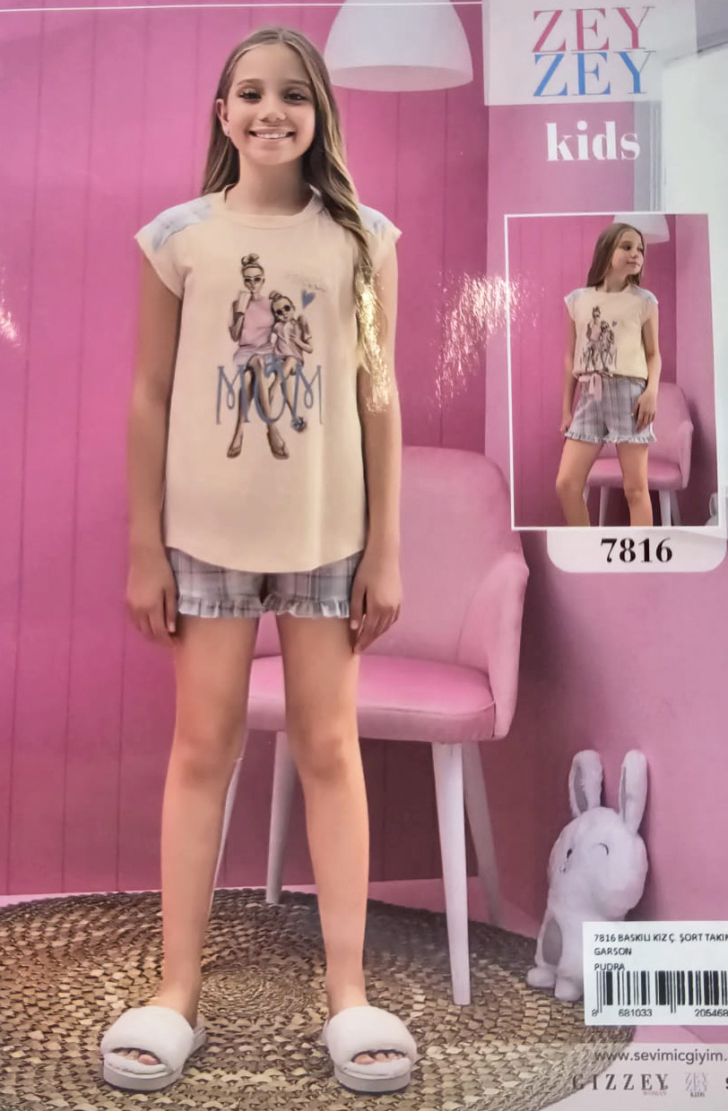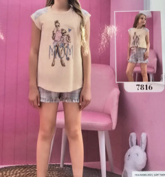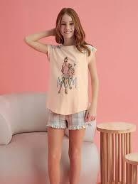 Комплект состоит из футболки с коротким рукавом и коротких шортиков, украшенных небольшим воланом.
