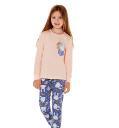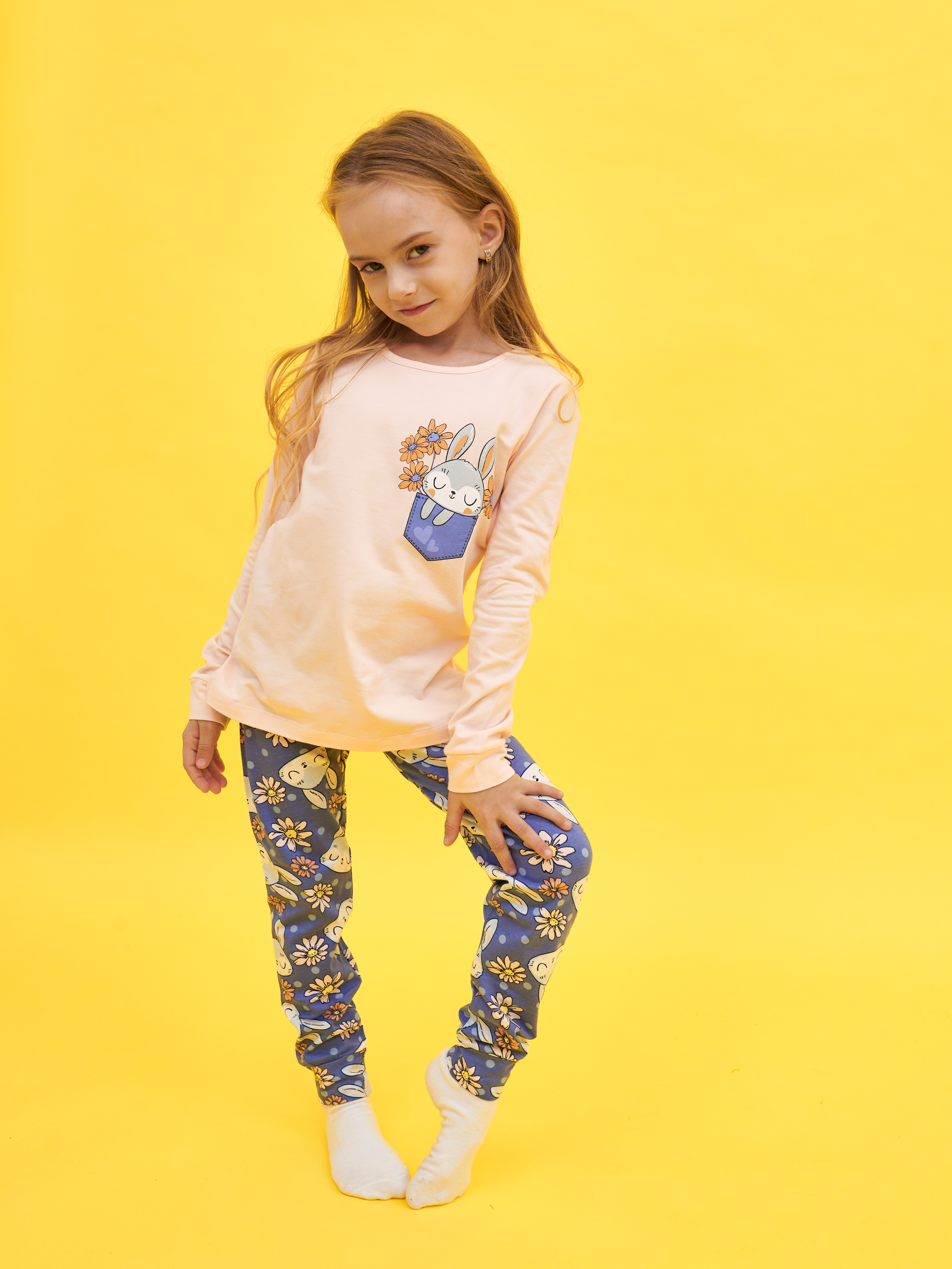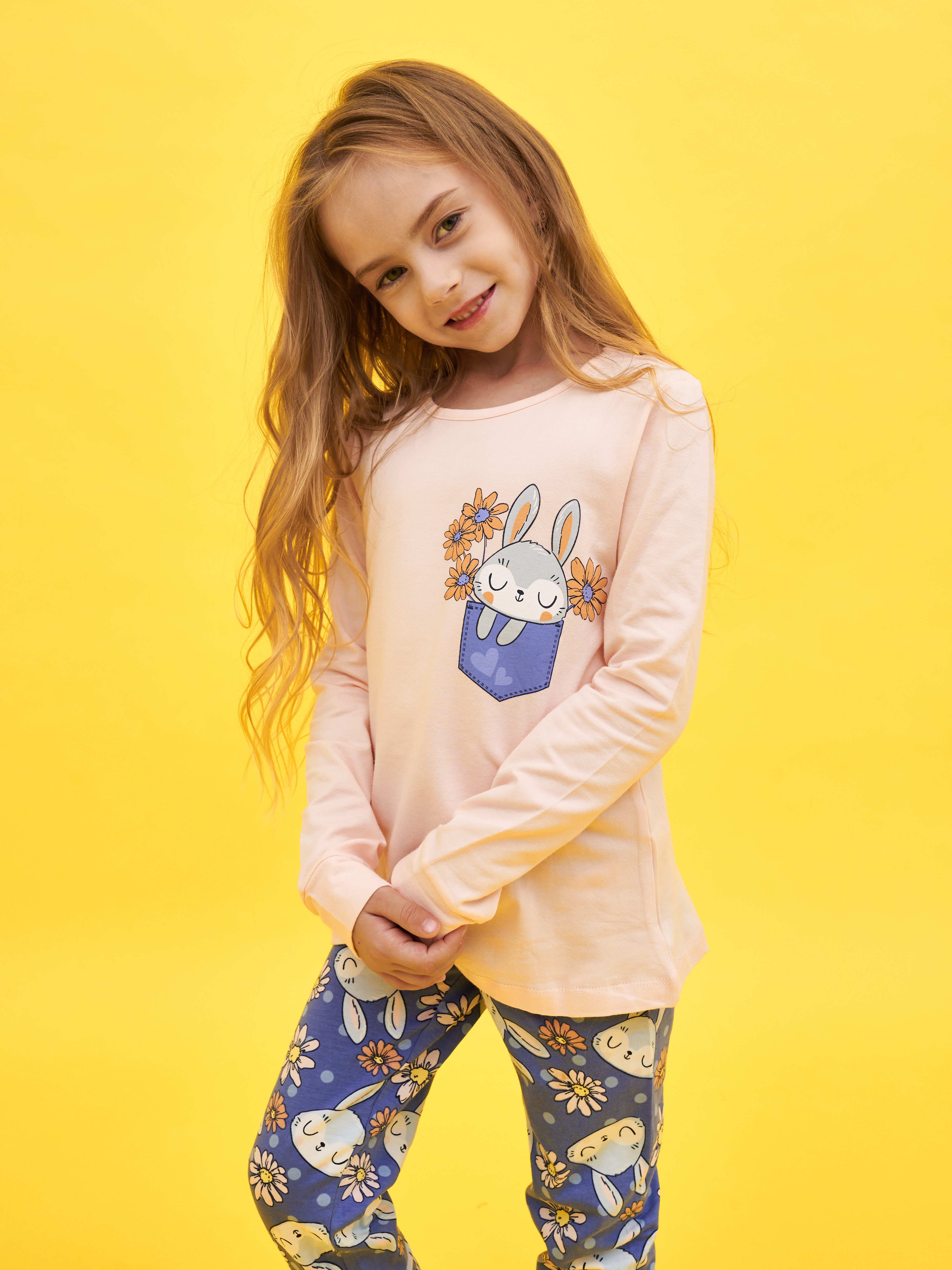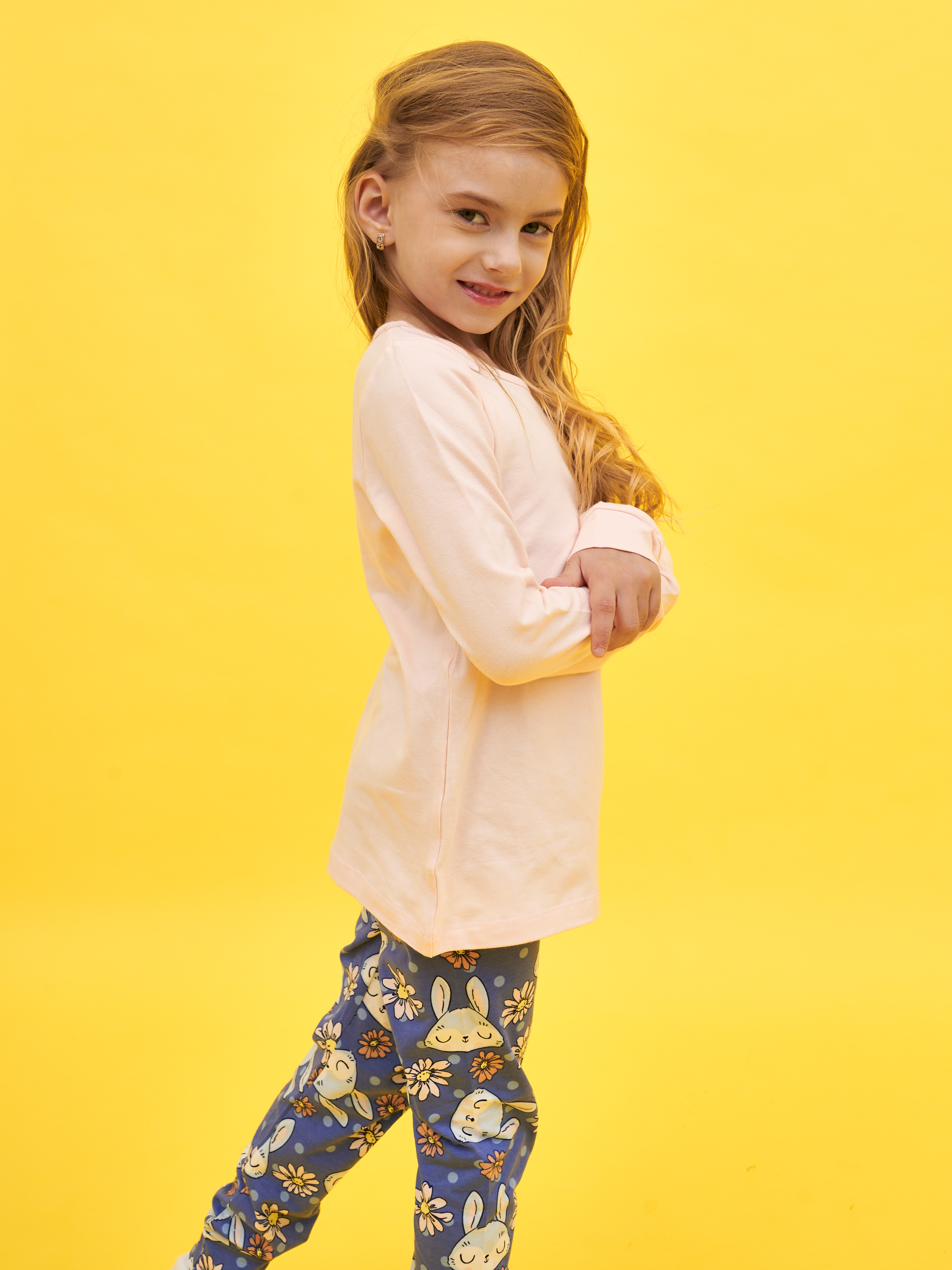 Стильная, уютная детская пижама, приятных оттенков без утеплителя и начеса. Пижама для девочки подойдёт как домашняя одежда, для сна и отдыха. Комплект состоит из кофты (лонгслив) с длинным рукавом и домашних штанов свободного кроя на манжете, выполненных из мягкого трикотажа.