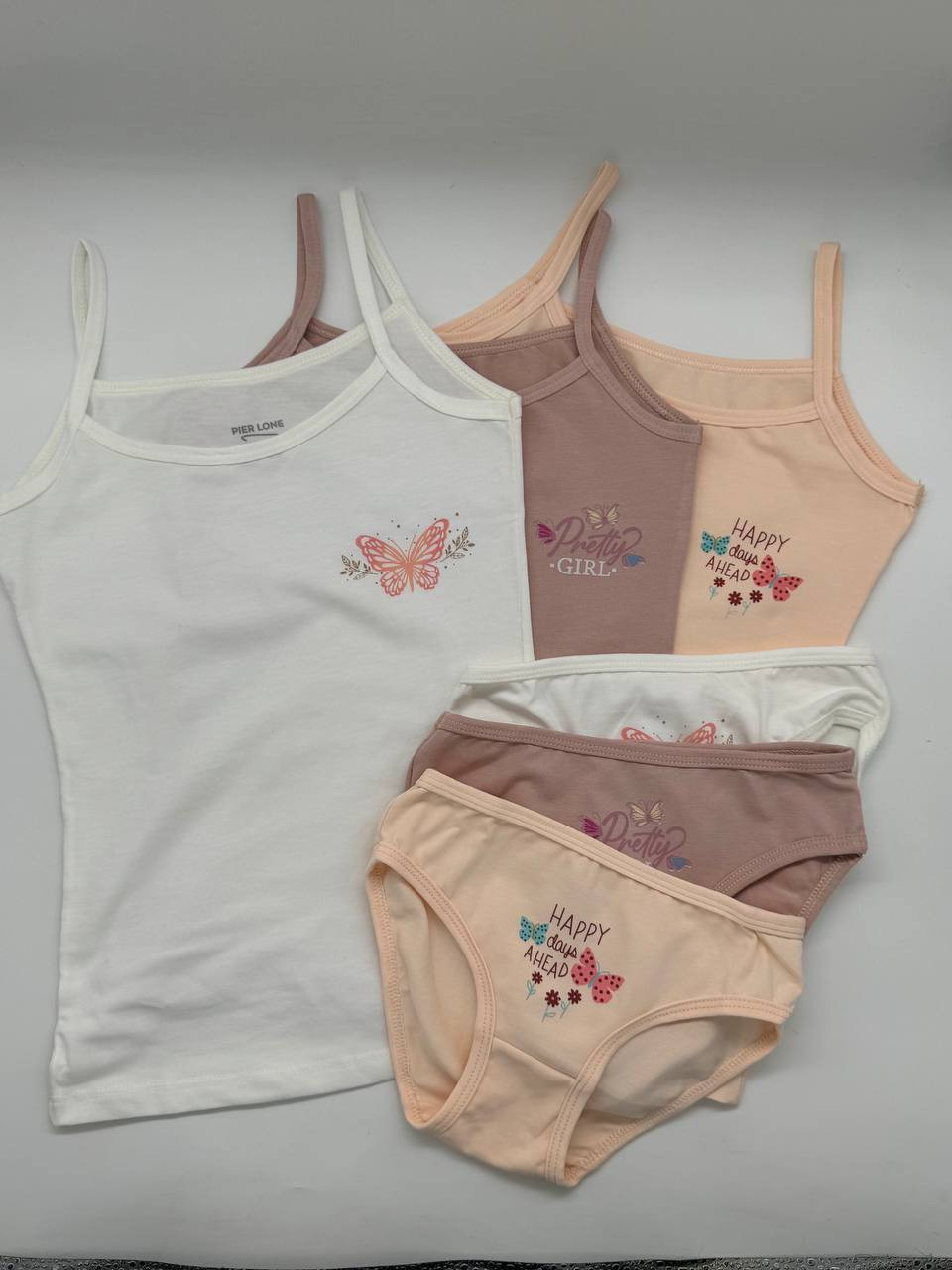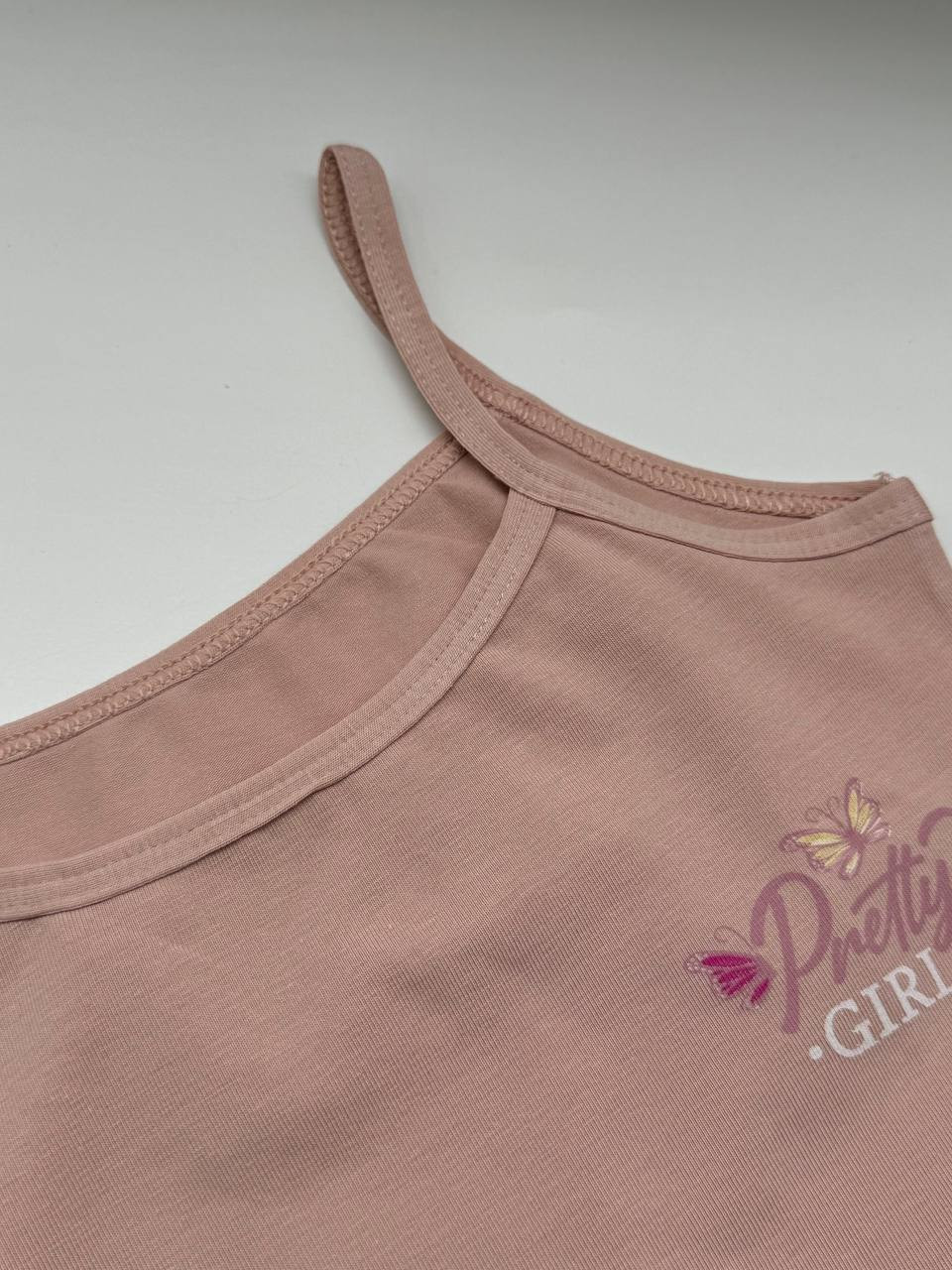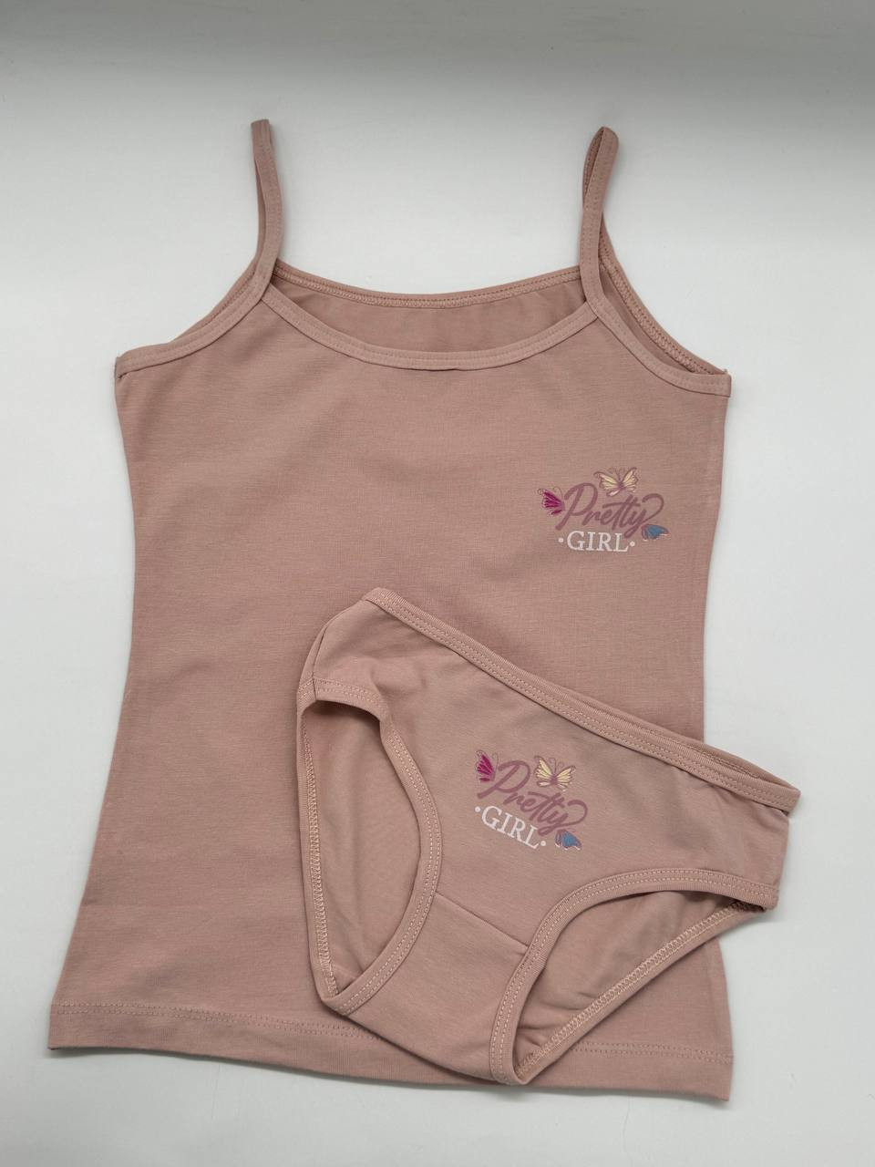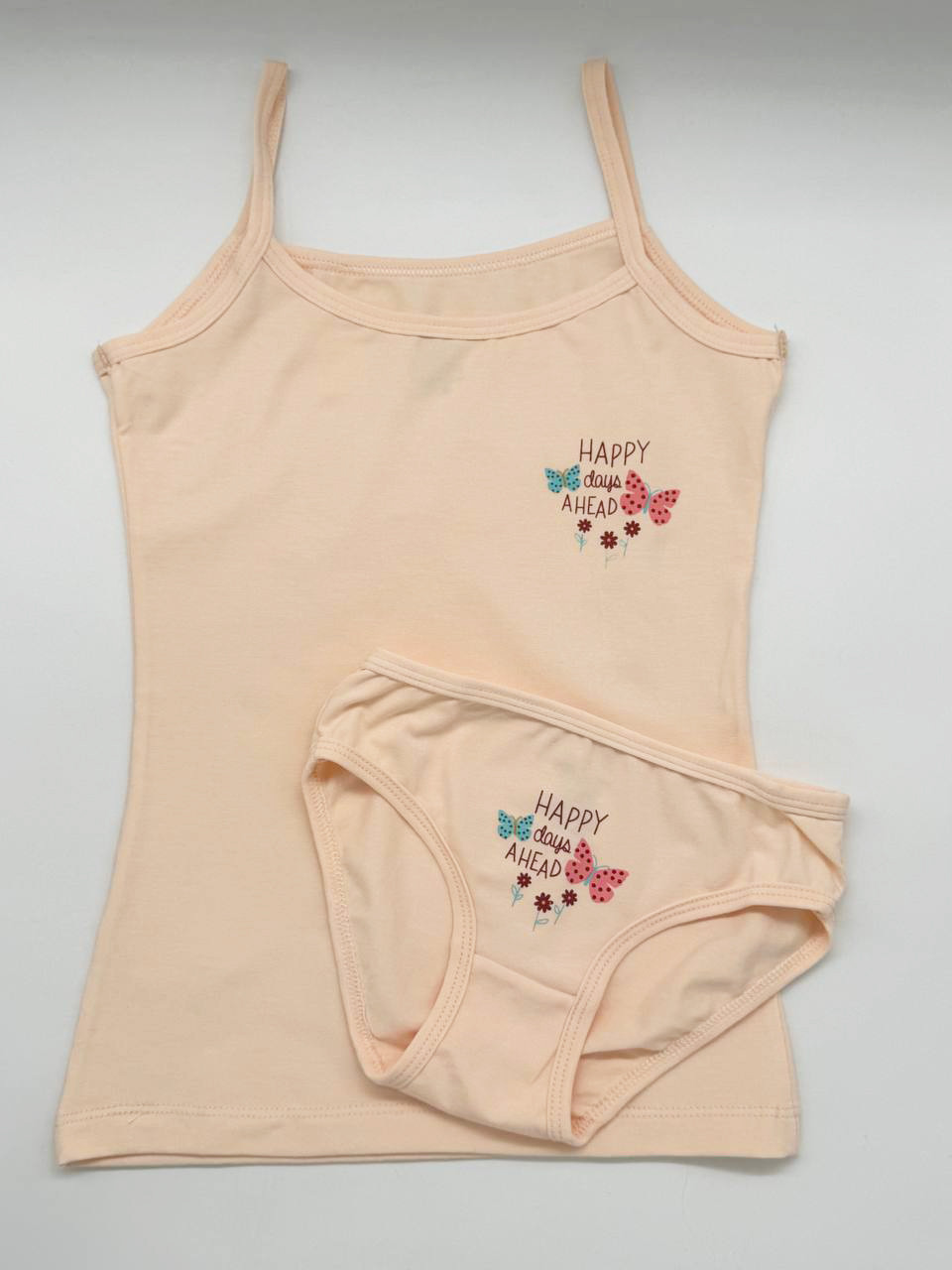 Комплект для девочки состоит из майки на тонких бретельках и трусиков. Цвета в ассортименте. Цена указана за 1 комплект.