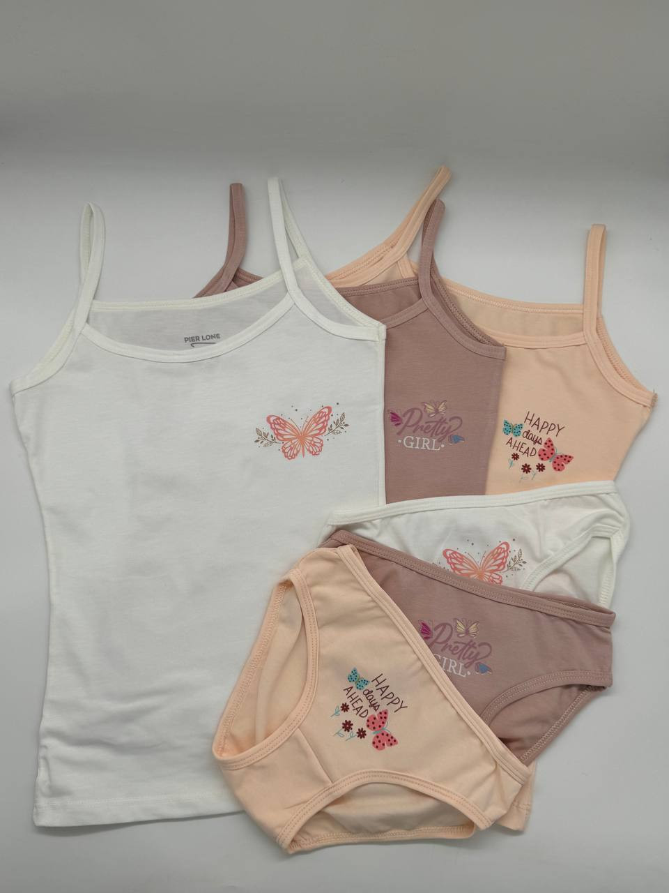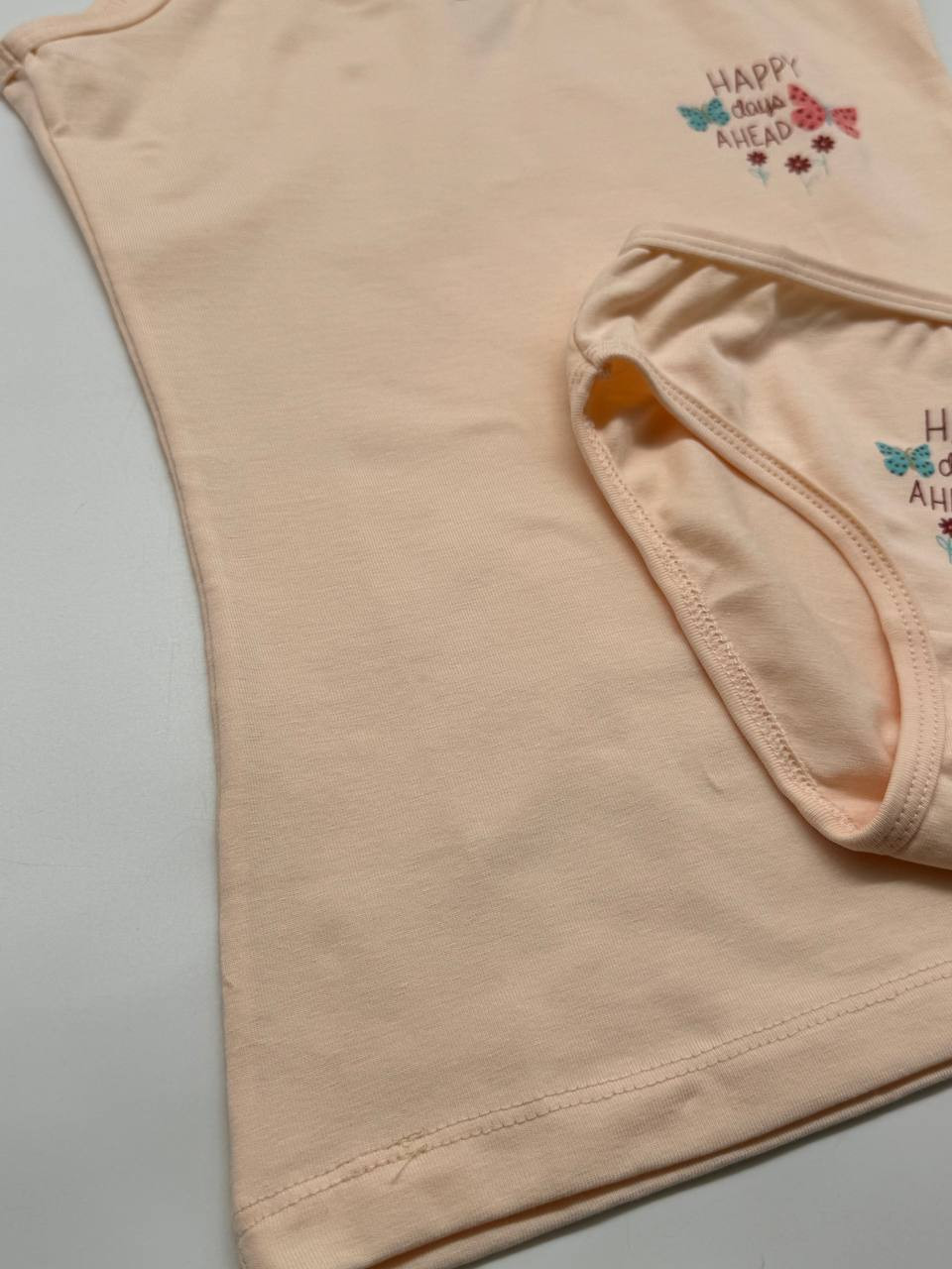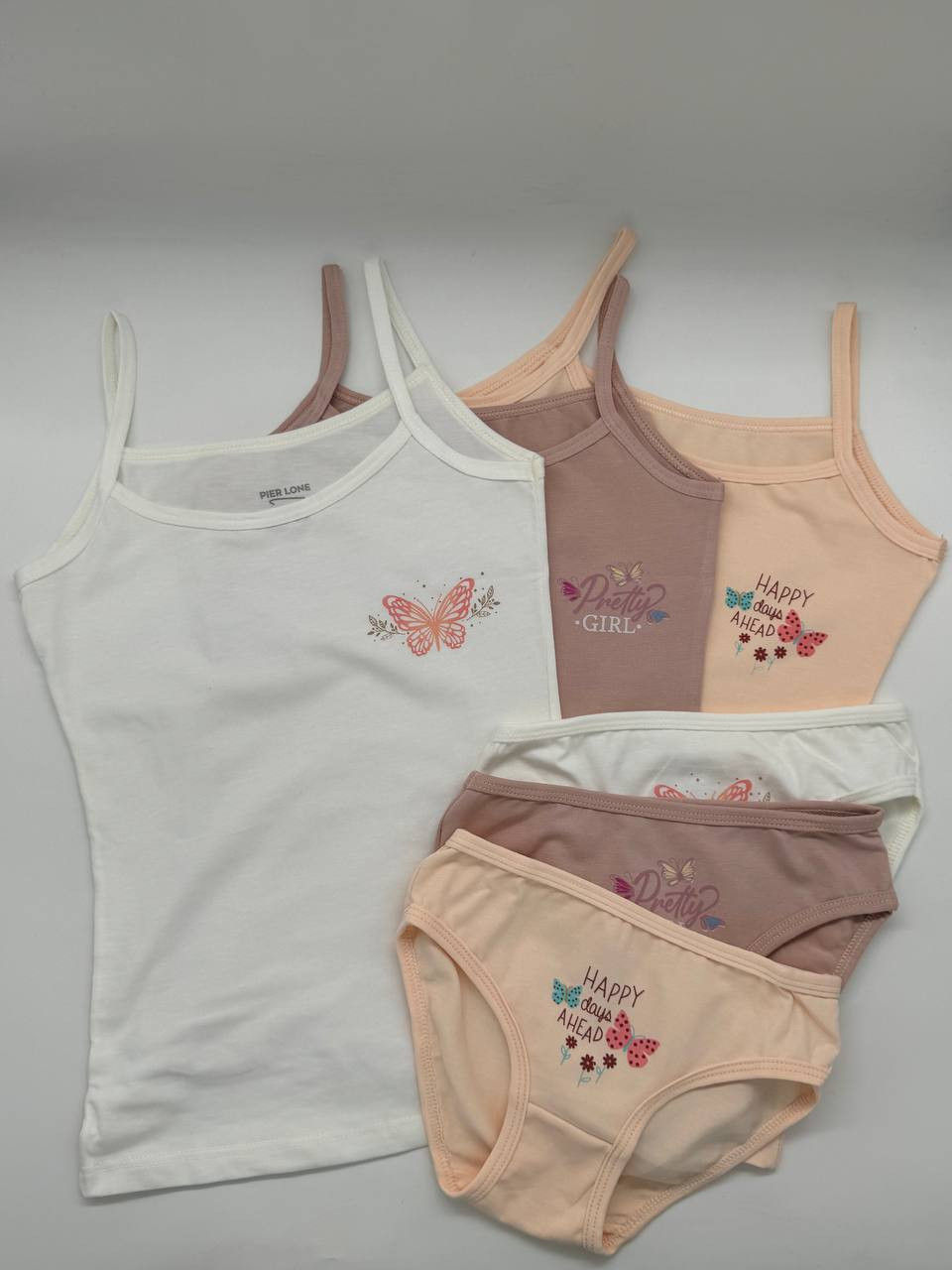 Комплект для девочки состоит из майки на тонких бретельках и трусиков. Цвета в ассортименте. Цена указана за 1 комплект.