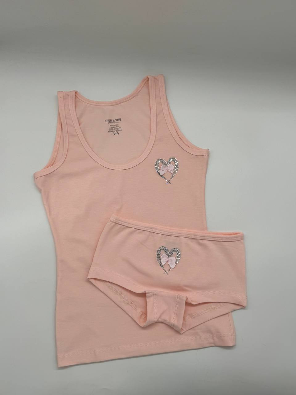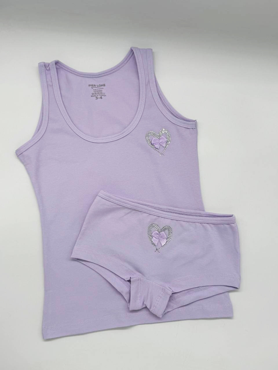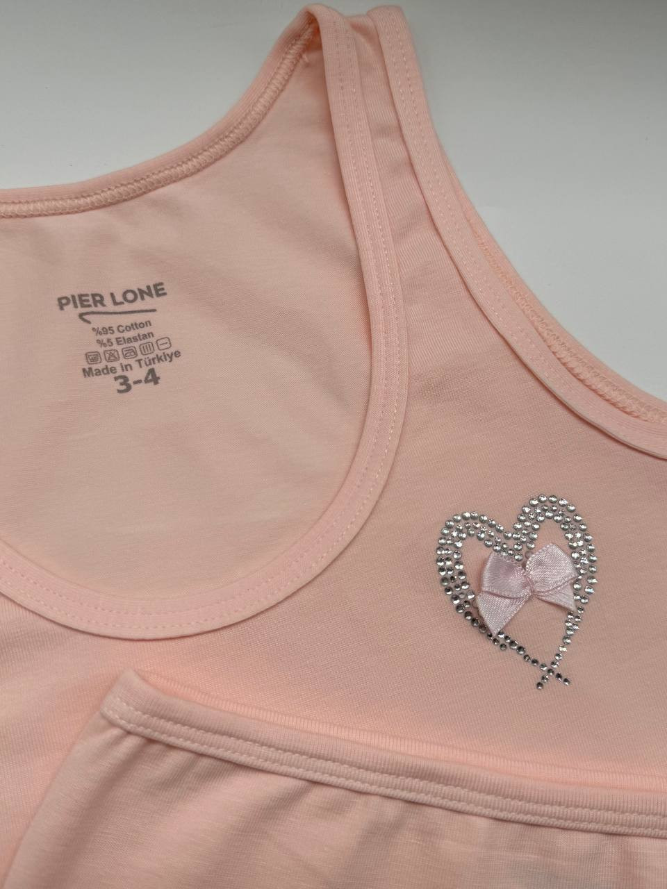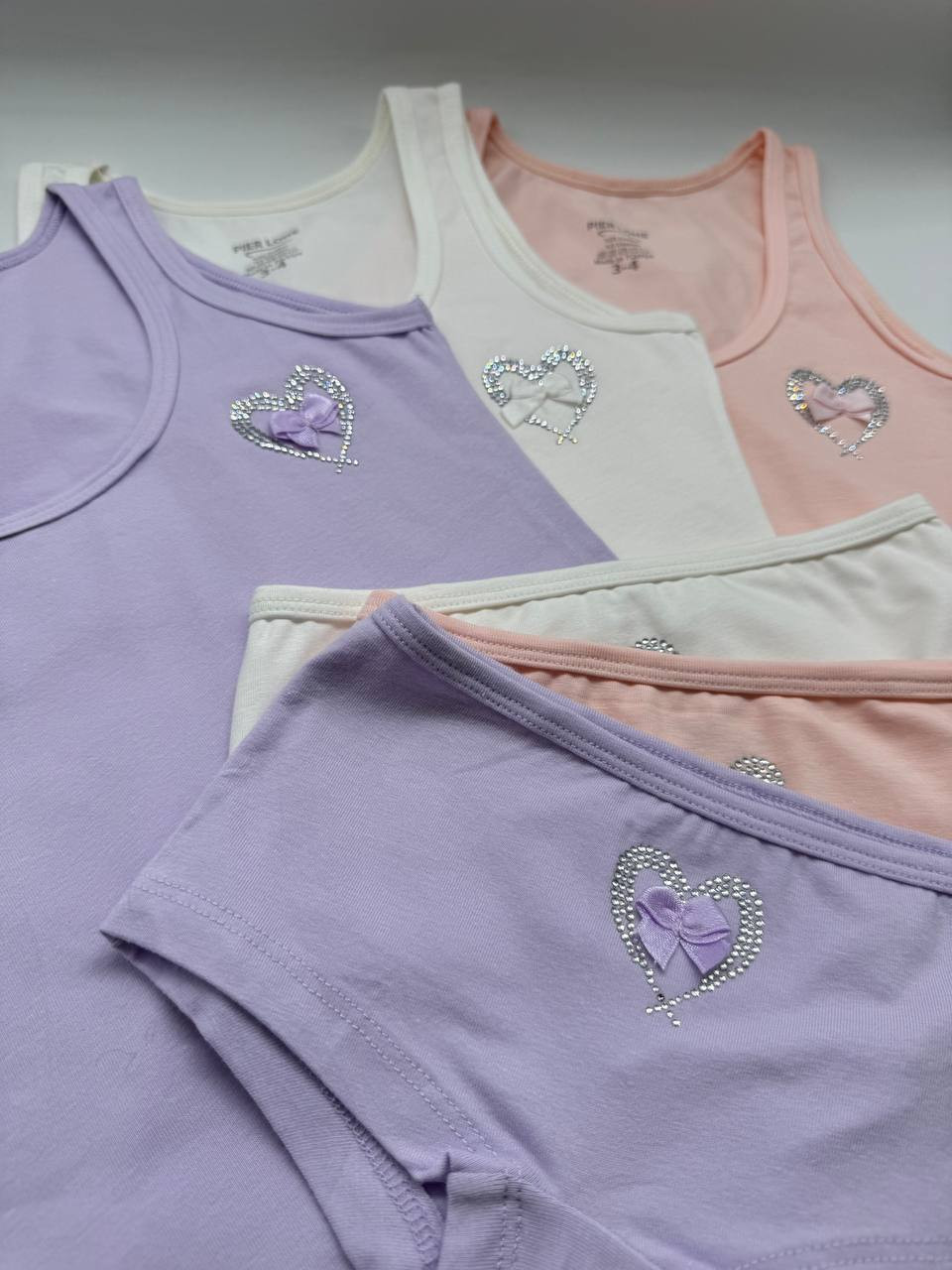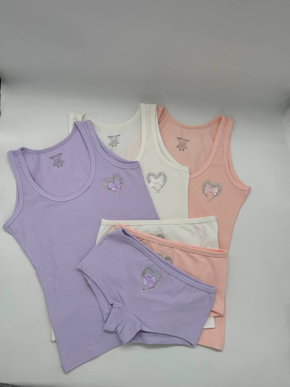 Комплект для девочки состоит из майки на широких бретельках и трусиков. Цвета в ассортименте. Цена указана за 1 комплект.