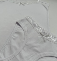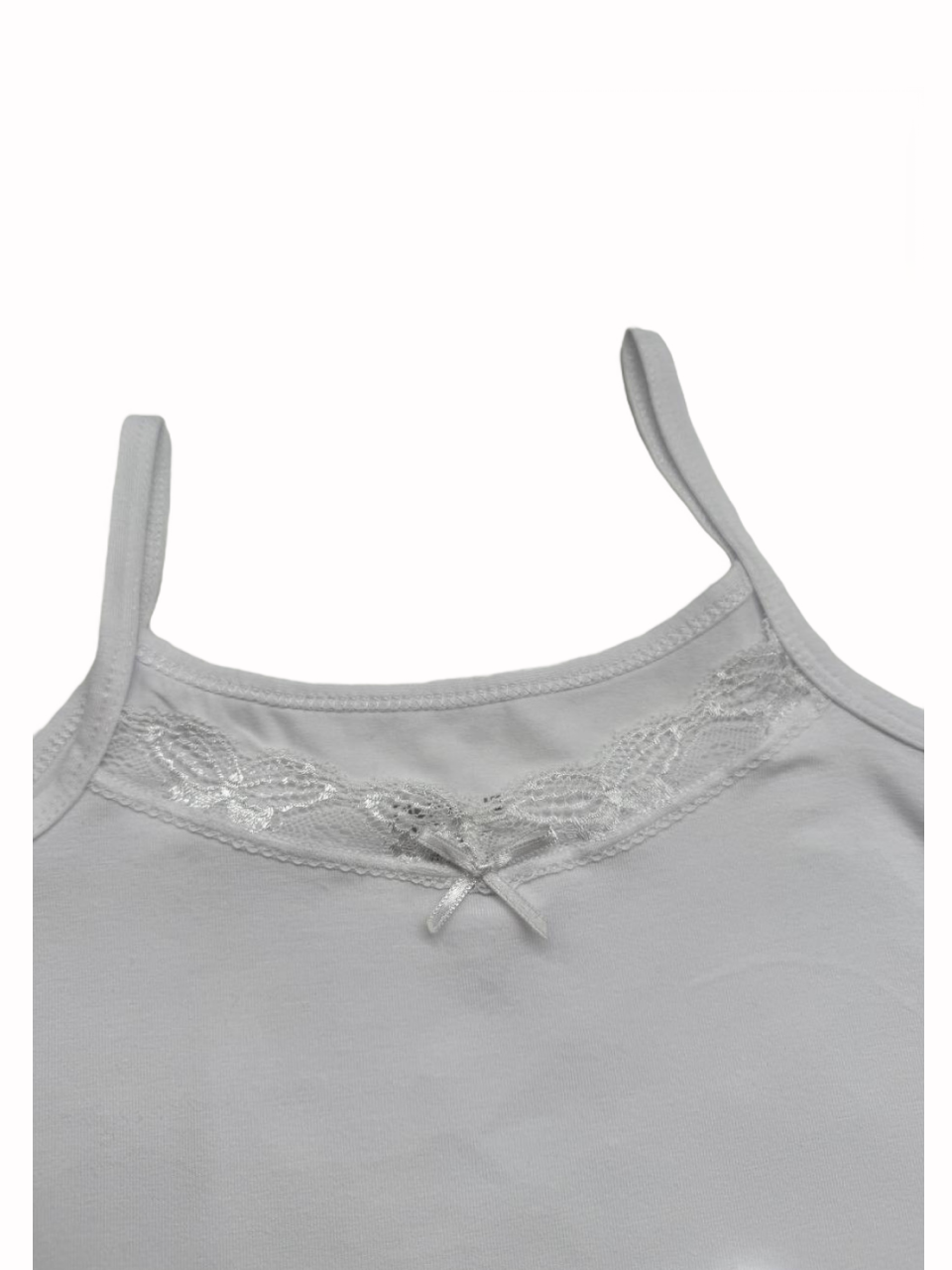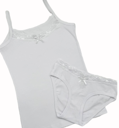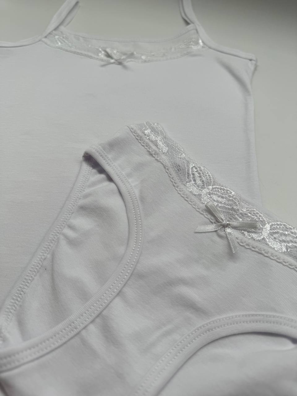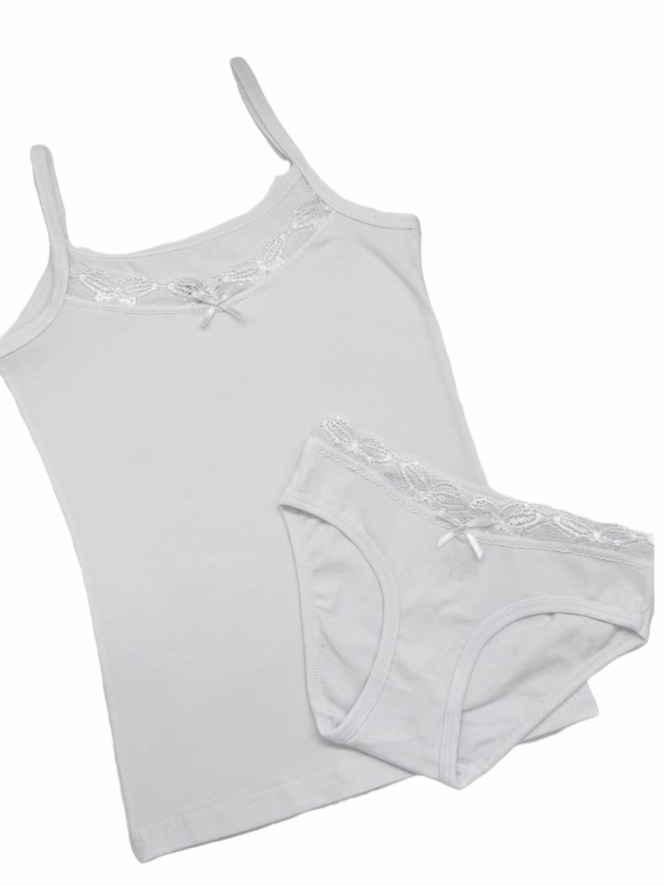 Комплект для девочки состоит из майки на тонких бретельках и трусиков с кружевной отделкой.