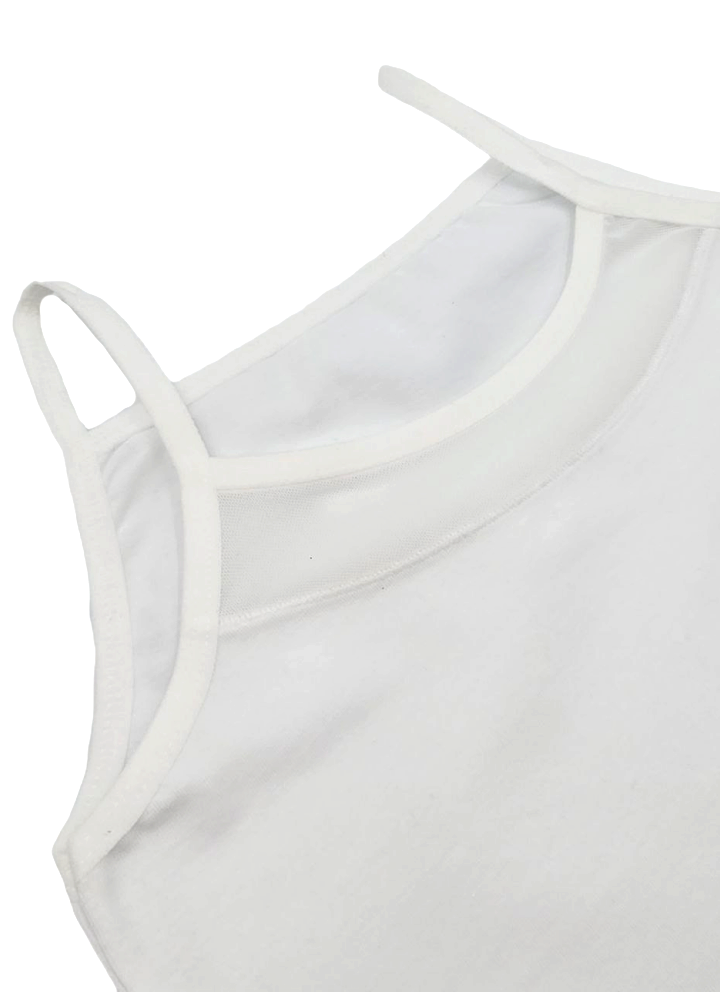 Майка для девочки на тонких бретельках с элегантной вставкой из сеточки на груди. Модель приталенного кроя, что обеспечивает аккуратную посадку по фигуре. Благодаря составу ткани — 95% хлопок и 5% эластан — майка приятна к телу, хорошо пропускает воздух и сохраняет форму даже после многократных стирок, не вытягивается и не теряет внешний вид.