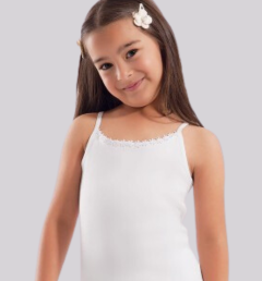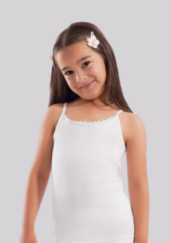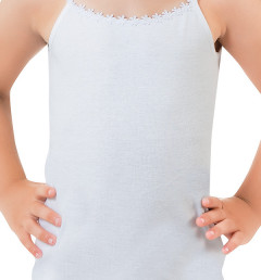 Майка для девочки на тонких бретельках представлена в белом цвете, что подчеркивает ее универсальность и подходит к каждому повседневному образу. Майка из натурального хлопка приятно облегает тело ребенка, не вызывая раздражения. Хлопковая ткань прекрасно дышит и поддерживает оптимальный температурный режим тела ребенка в течение дня. Горловина маечки украшена мягким кружевом.
