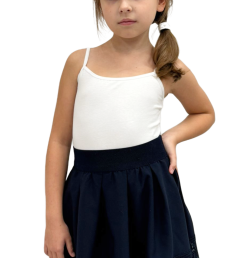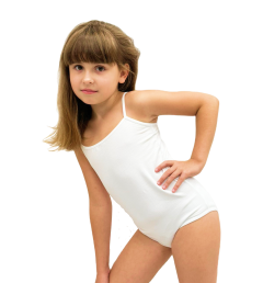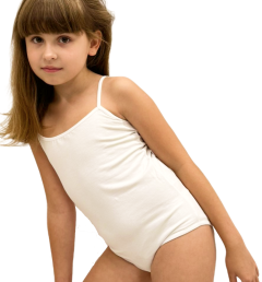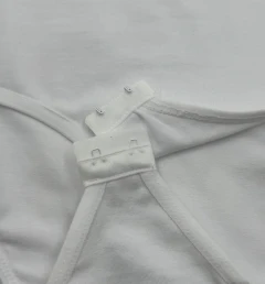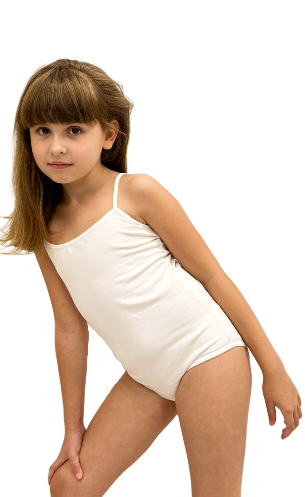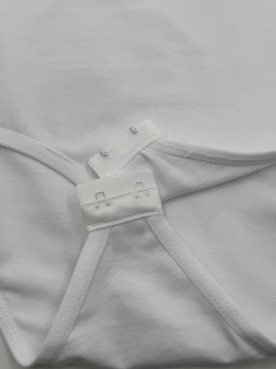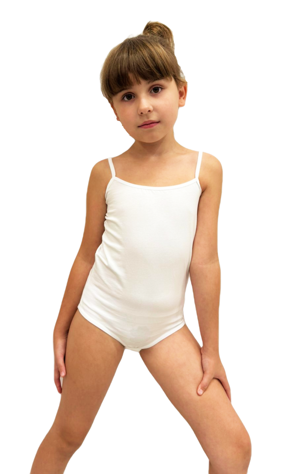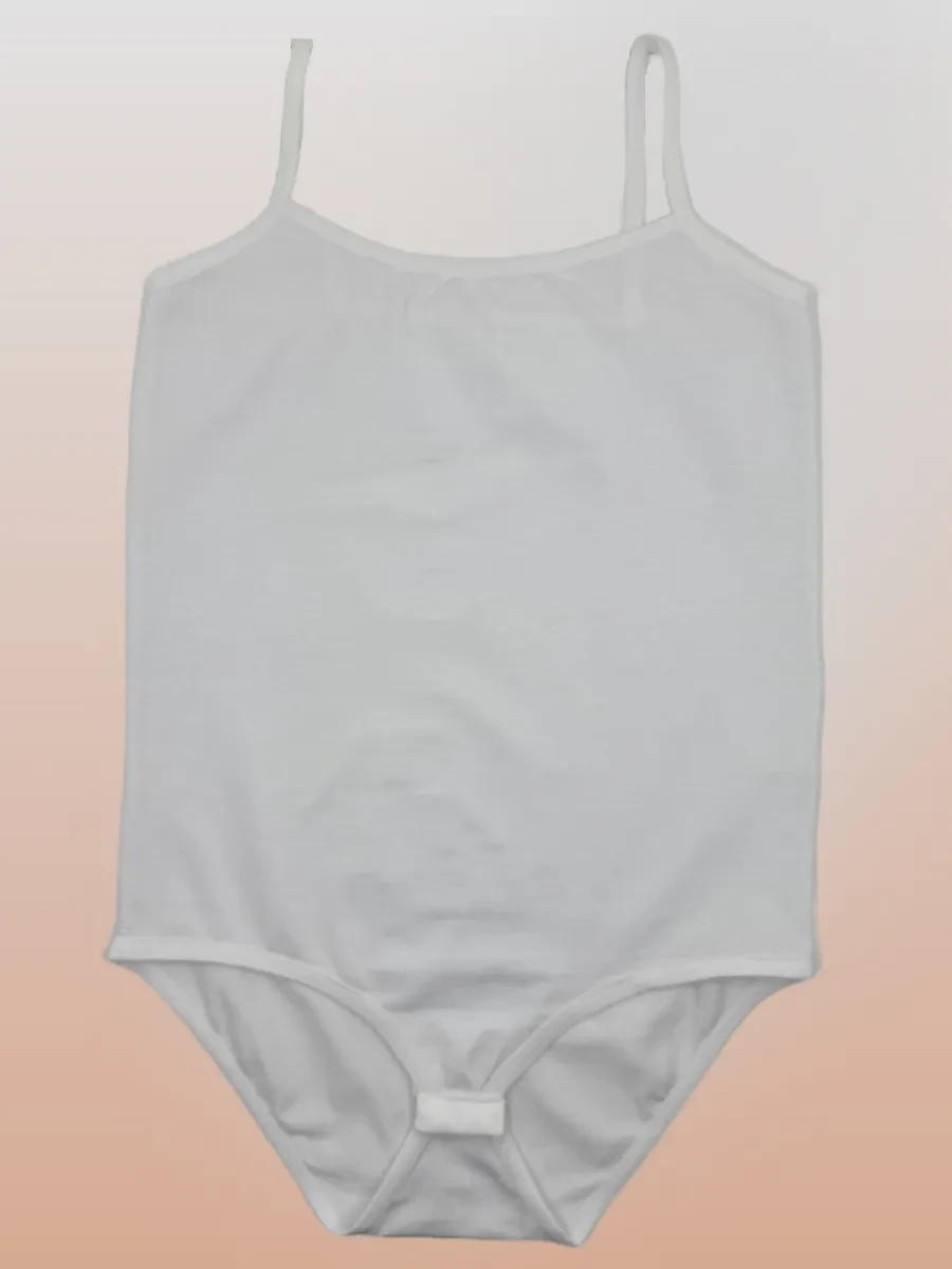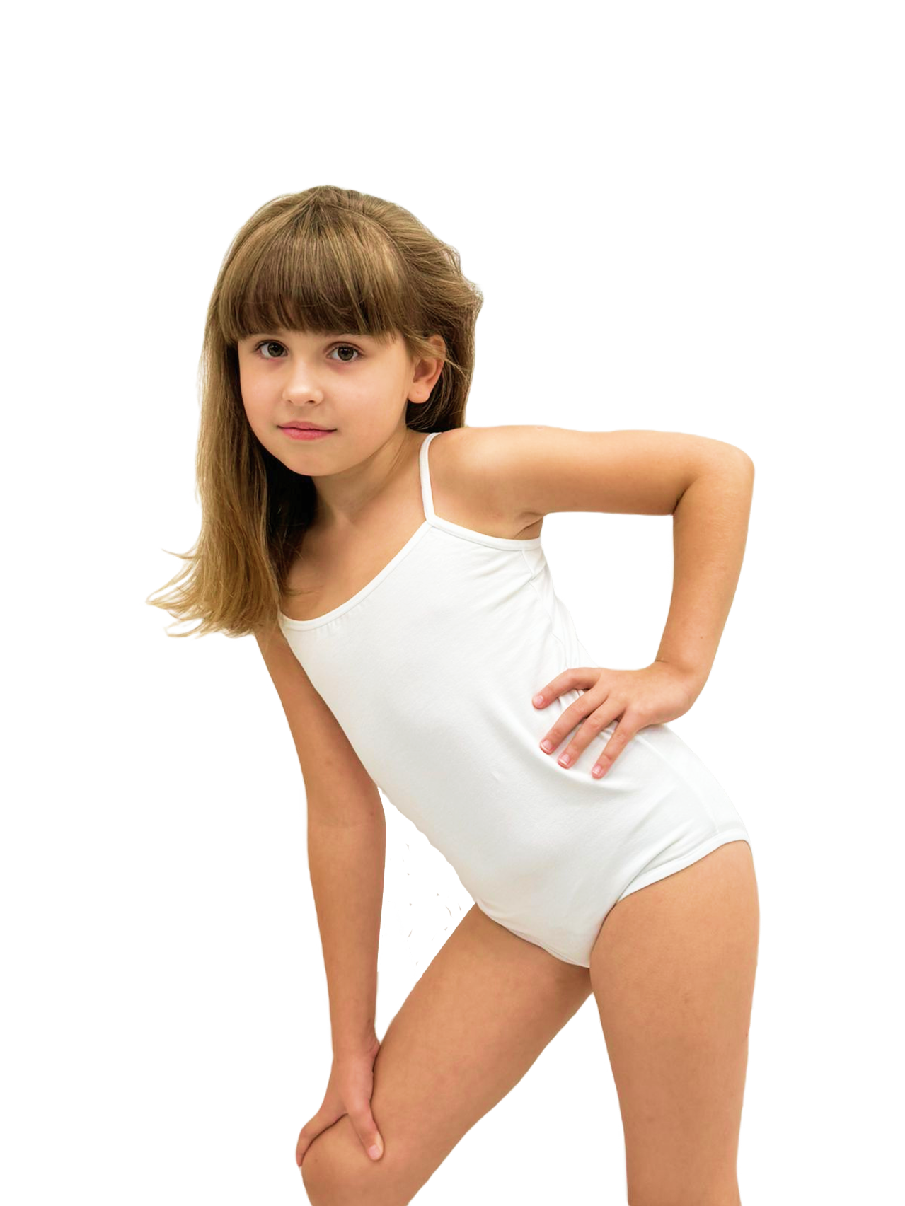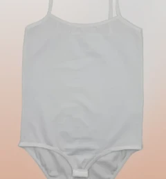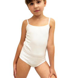 Детское классическое боди Kota белого цвета на тонких, не регулируемых бретельках, застежка на крючках.