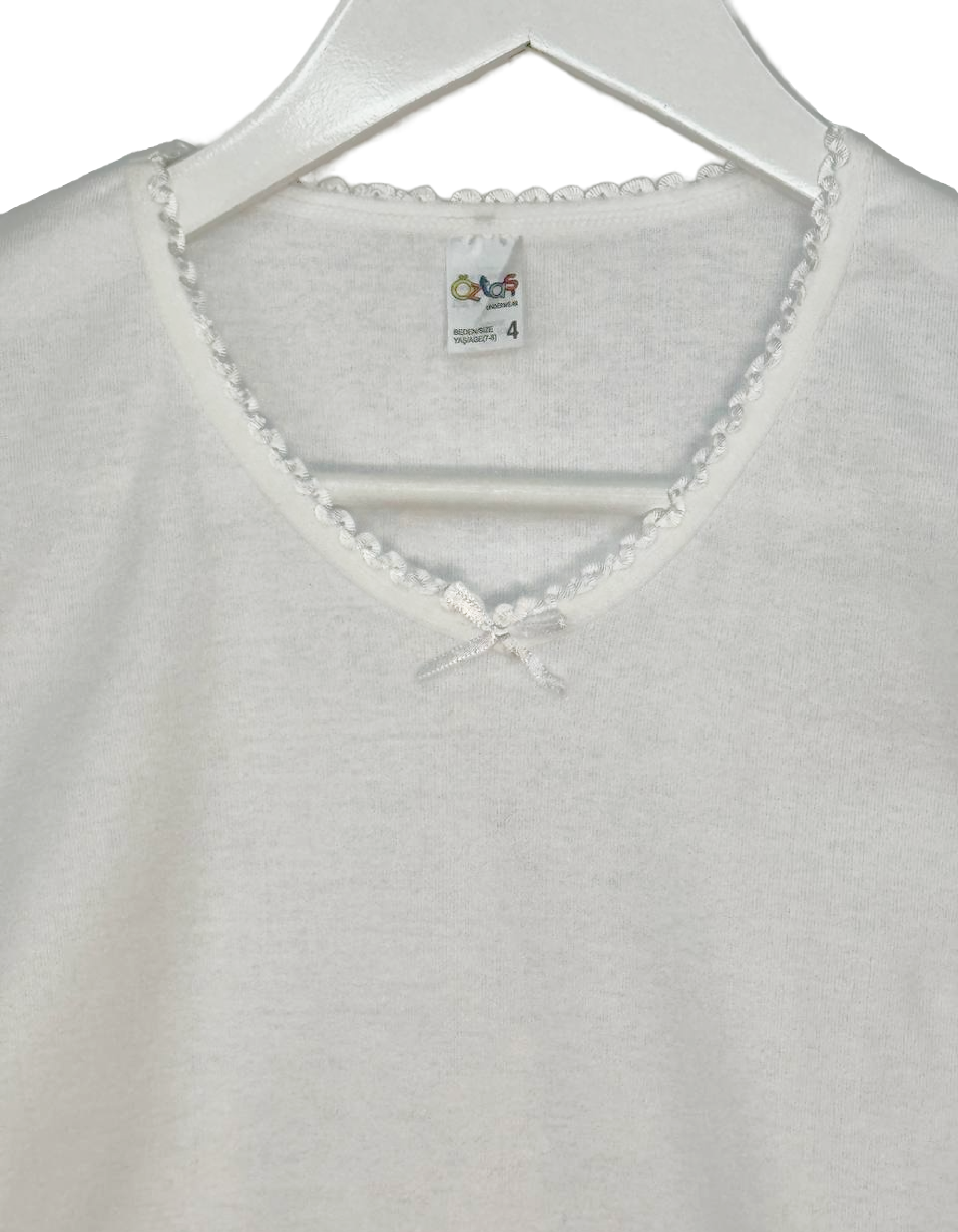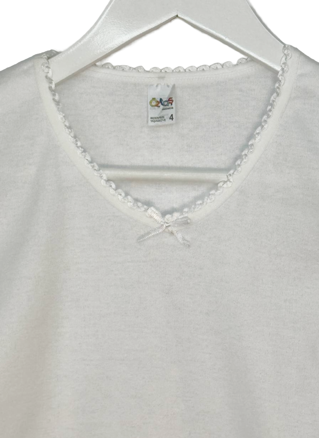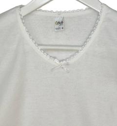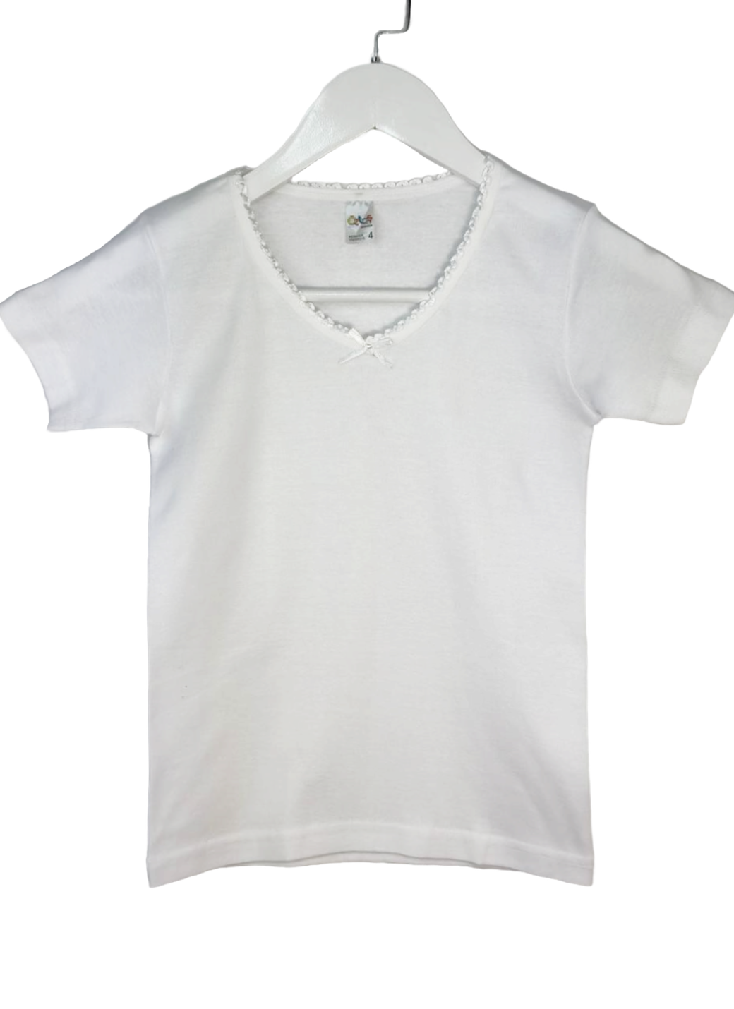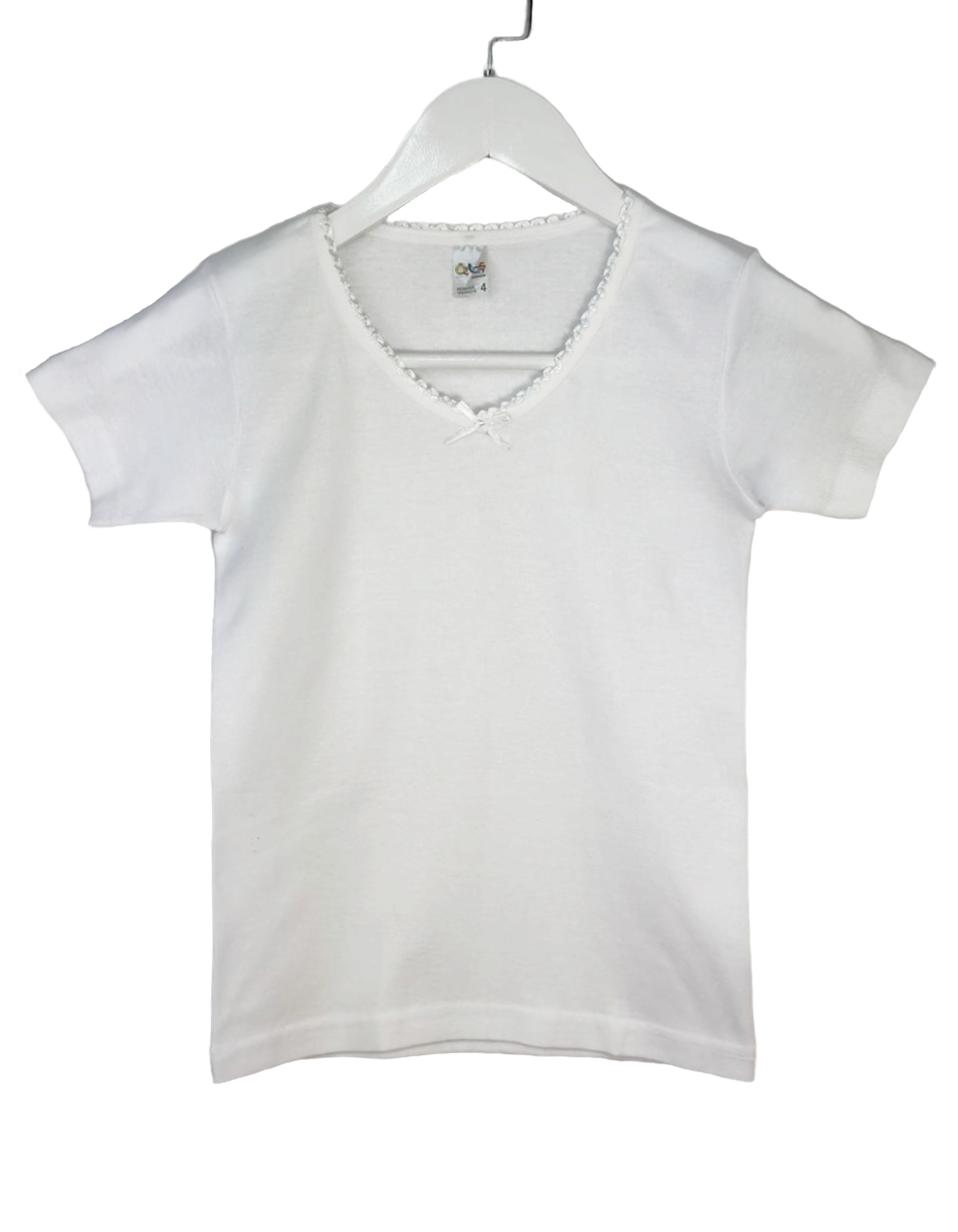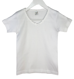 Футболки для девочки изготовлена из мягкого и комфортного хлопка, чтобы обеспечить удобство и свободу движений. С коротким рукавом и круглой горловиной, украшена ажурной тесьмой.