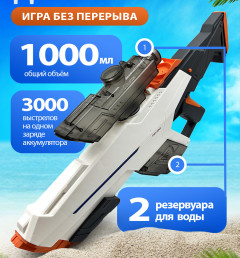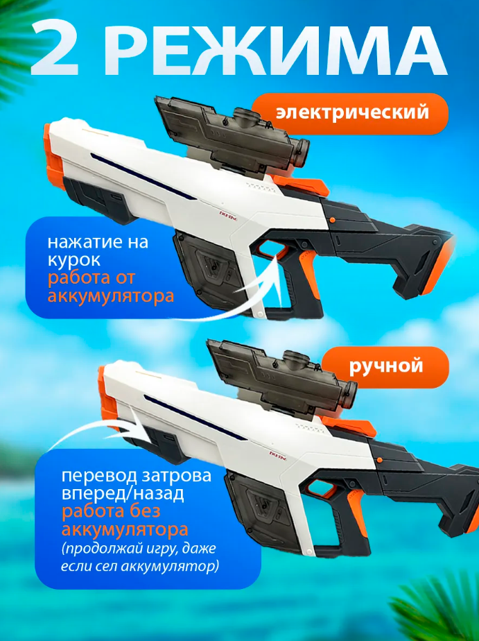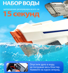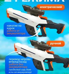 Это детский игрушечный водный автомат –водный бластер Water Gun, который работает на аккумуляторе и заполняется водой. Автоматически выстреливает струи воды на расстояние до 12 метров, благодаря мощному встроенному электрическому насосу, а так же в нем есть механический насос с помощью которого можно в ручную стрелять водой.