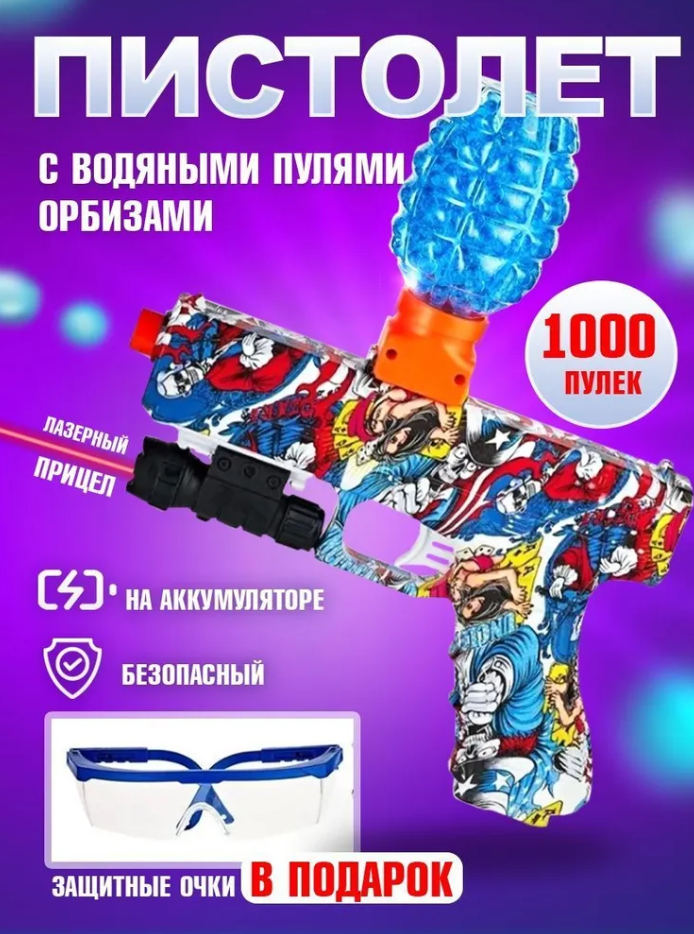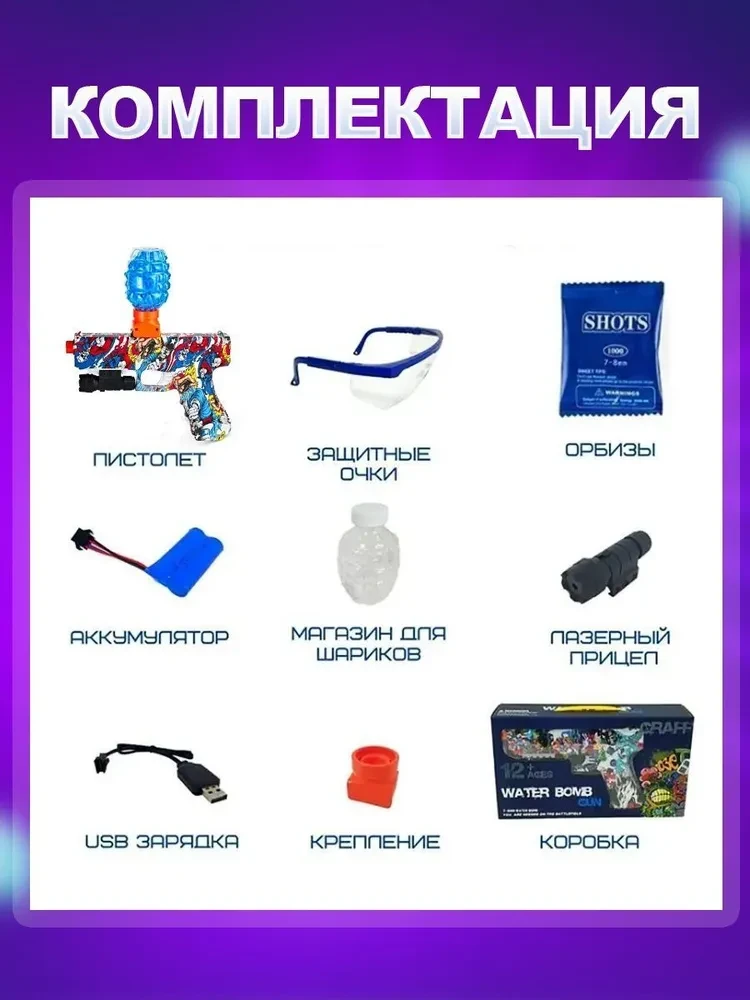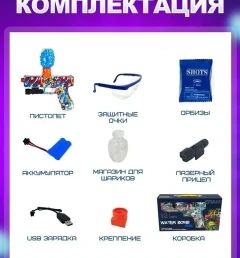 В комплекте с пистолетом идут лазерный прицел, аккумулятор, зарядное устройство, магазин и защитные очки. Также в наборе есть набор шаров Orbeez на 1000 штук (диаметр 7-8мм). Размеры пистолета составляют 24 см в длину, 16 см в высоту без магазина и 250 гр без пулек.