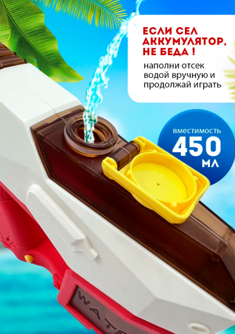 Пистолет имеет лазерное и звуковое эффекты, а также оснащен прицелом и извлекаемой обоймой, что делает его более реалистичным и интересным для игры. Дальность поражения составляет 16 метров, а скорострельность 600 выстрелов в минуту. Скорость гидрошаров составляет 35 метров в секунду, а максимальная дальность - 20 метров.