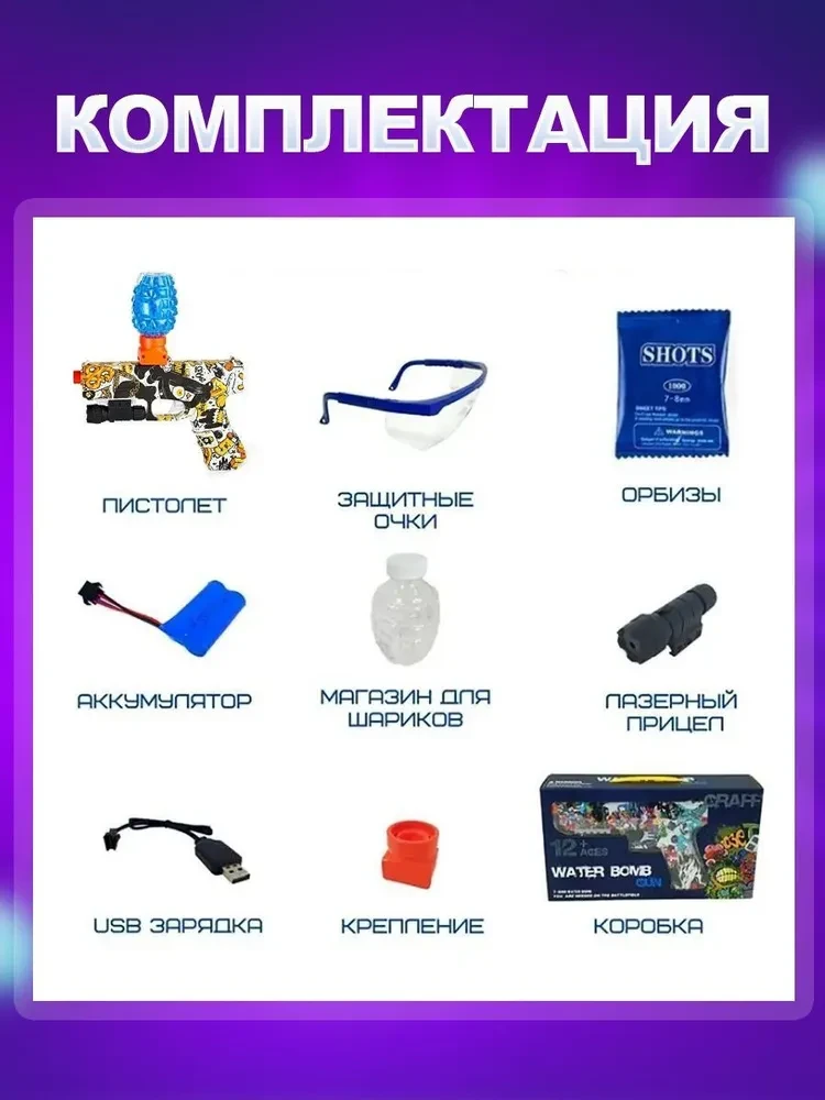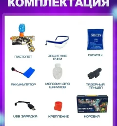 В комплекте с пистолетом идут лазерный прицел, аккумулятор, зарядное устройство, магазин и защитные очки. Также в наборе есть набор шаров Orbeez на 1000 штук (диаметр 7-8мм). Размеры пистолета составляют 24 см в длину, 16 см в высоту без магазина и 250 гр без пулек.