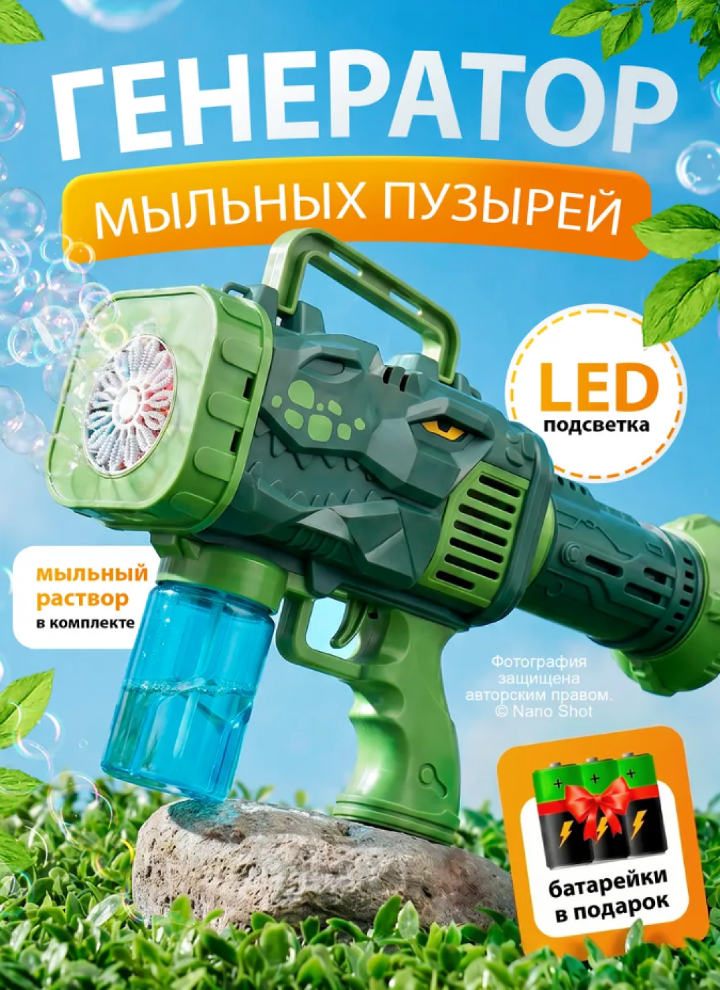 Безопасные материалы: Генератор изготовлен из высококачественного нетоксичного пластика, полностью безопасного для детей. Мыльный раствор не оставляет следов на одежде и легко смывается водой.