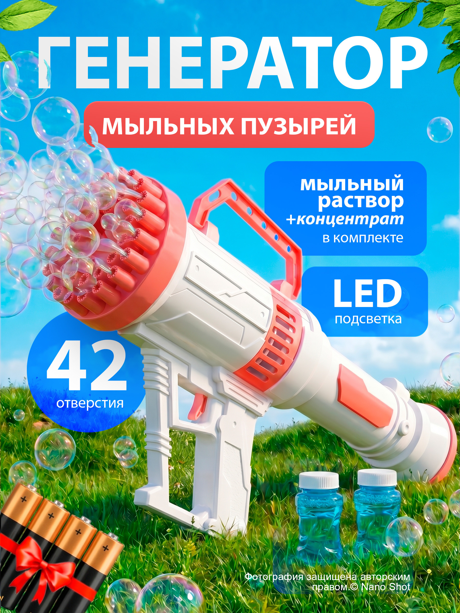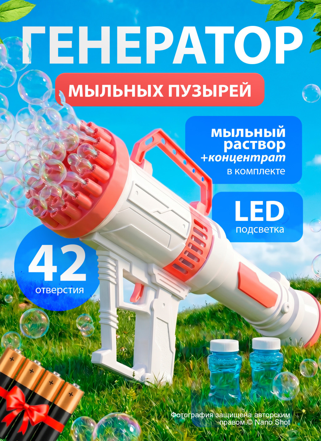 В комплекте — пушка для мыльных пузырей, лоток для мыльного раствора, две баночки с мыльным раствором , а также 2 концентрата и 4 батарейки в подарок, благодаря чему пушка сразу готова к использованию. Экономичный расход мыльного раствора достигается за счет продуманной конструкции отверстий, позволяющей создавать большое количество пузырей при минимальных затратах раствора.Генератор мыльных пузырей идеальны для детских праздников, выпускных, вечеринок, игр дома или на улице.Наслаждайся мыльными пузырями, дари радость детям и создавай атмосферу веселья в любой момент.