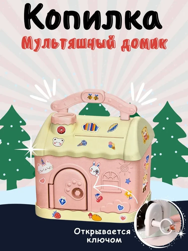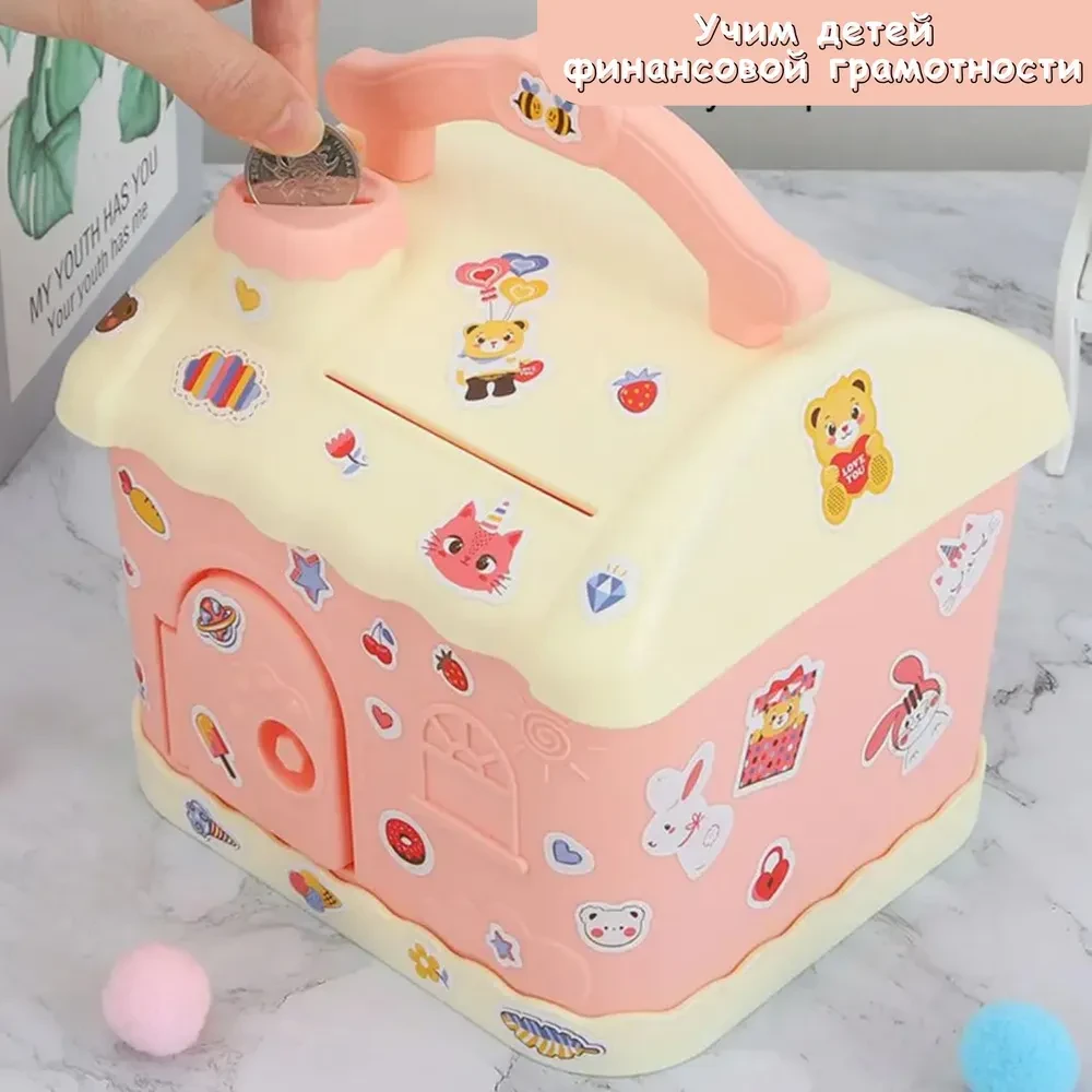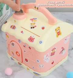 Денежная копилка для монет и купюр Мультяшный домик, розовый