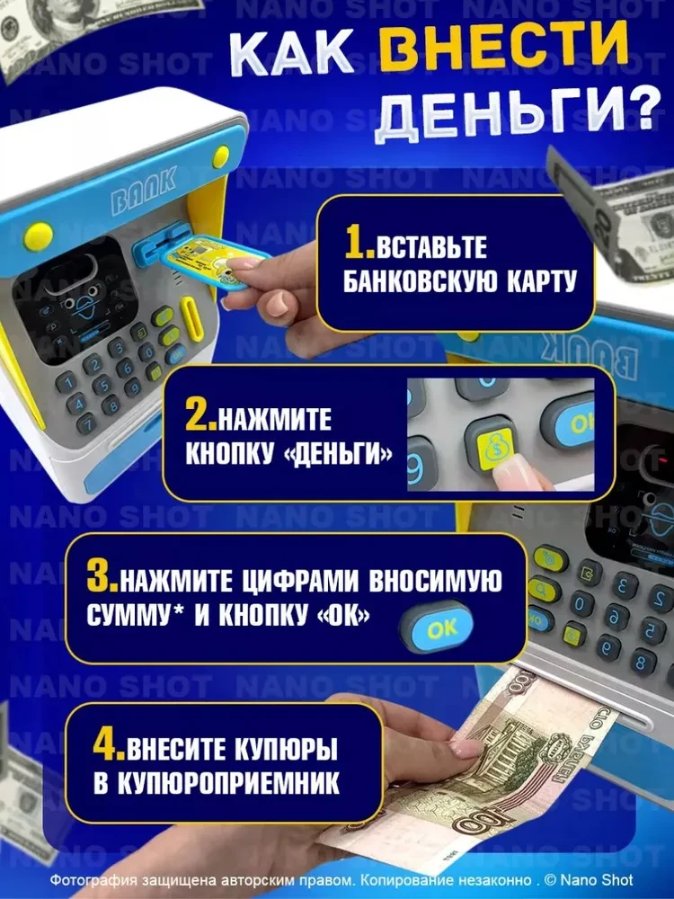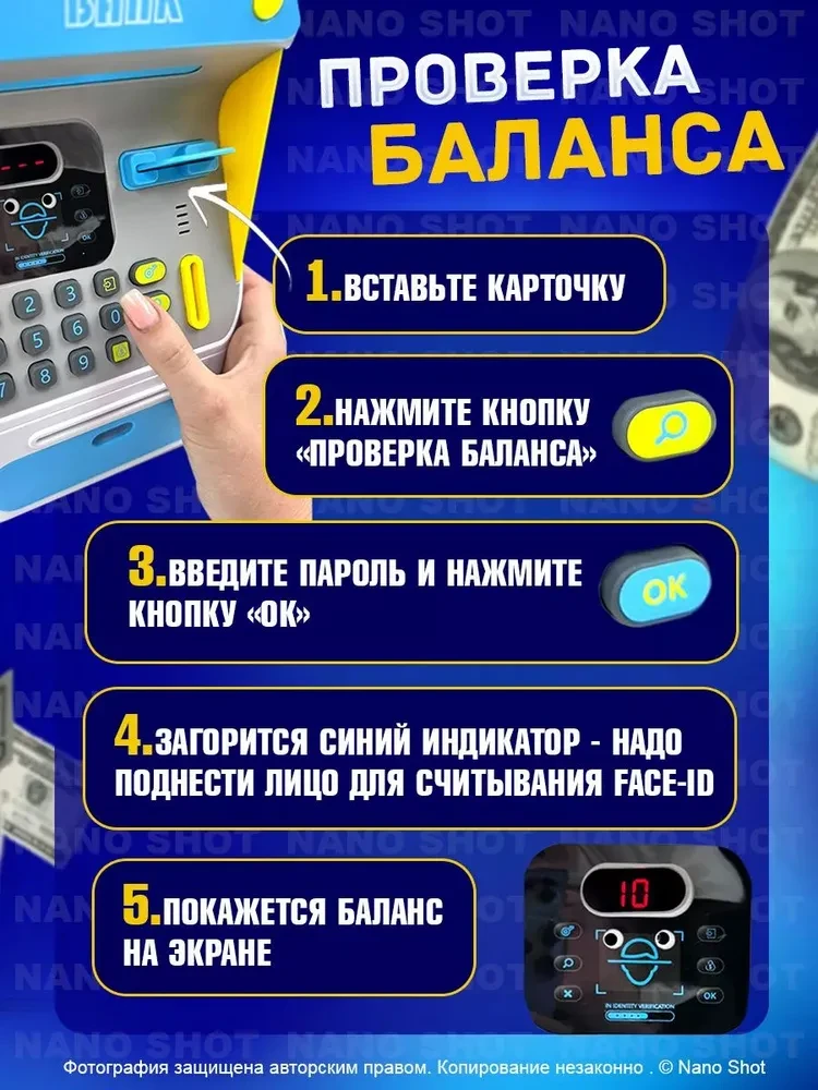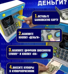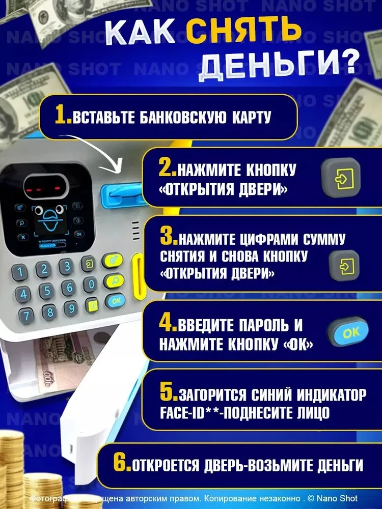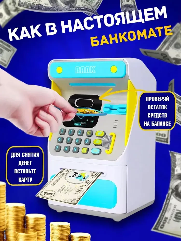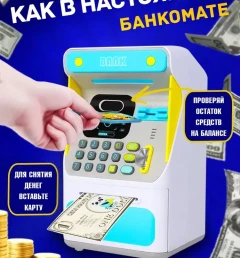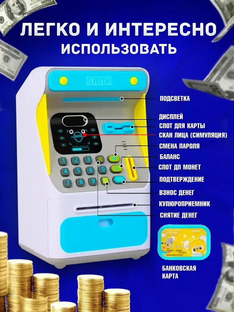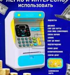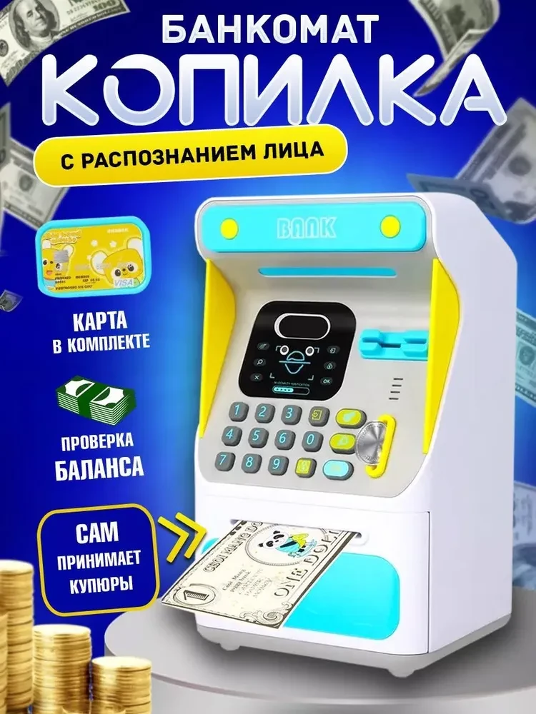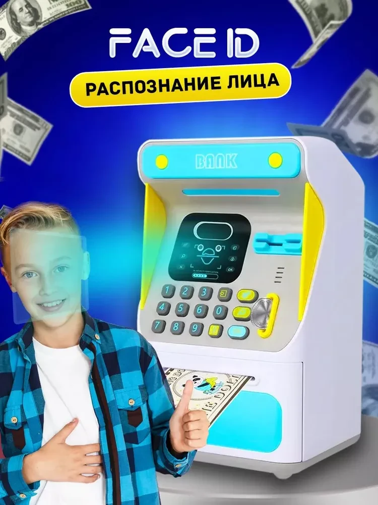 Ищете оригинальный и полезный подарок для близких? Обратите внимание на интерактивную копилку-банкомат с распознаванием лица- фэйс айди (Face ID). Копилка с паролем станет не только стильным элементом декора, но и функциональным аксессуаром для хранения денег. Благодаря современным технологиям, копилка денежная для девочек распознает лица и реагирует на приближение владельца, что добавляет элемент интерактивности и делает процесс накопления денег увлекательным. Сейф для денег детский может стать отличным подарком на день рождения или другой праздник. Копилка банкомат подойдет для любого члена семьи — будь то мама, папа, сестра или брат. Такой подарок будет не только оригинальным, но и практичным, ведь каждый сможет использовать ее для хранения своих сбережений. Это отличный способ научить детей ценности накоплений и финансовой грамотности. Интерактивная сейф- копилка с распознаванием лица — это не просто вещь, а целый опыт, который будет радовать вас и ваших близких. Ребенок с удовольствием будет собирать деньги, играя и развлекаясь. Работает от батареек, принимает монеты и бумажные купюры, имеет музыкальное сопровождение. Закажите ее уже сегодня и добавьте немного веселья и стиля в вашу жизнь!