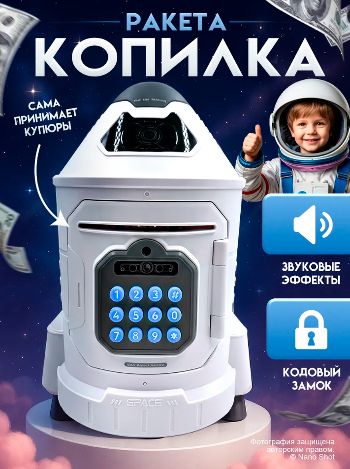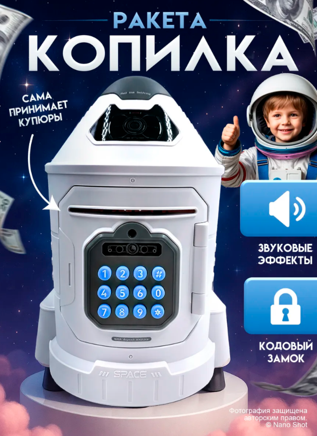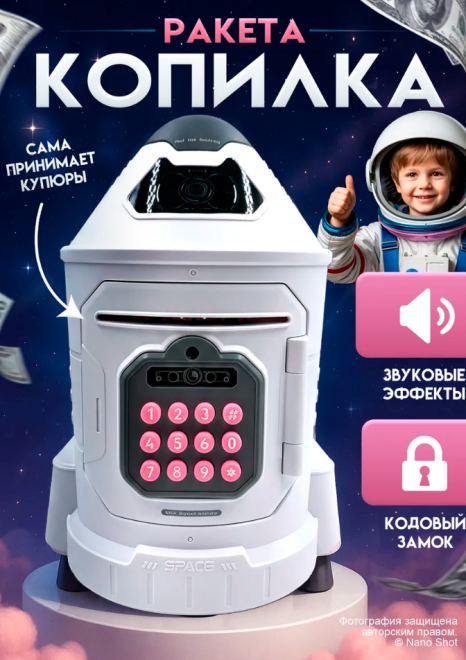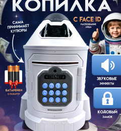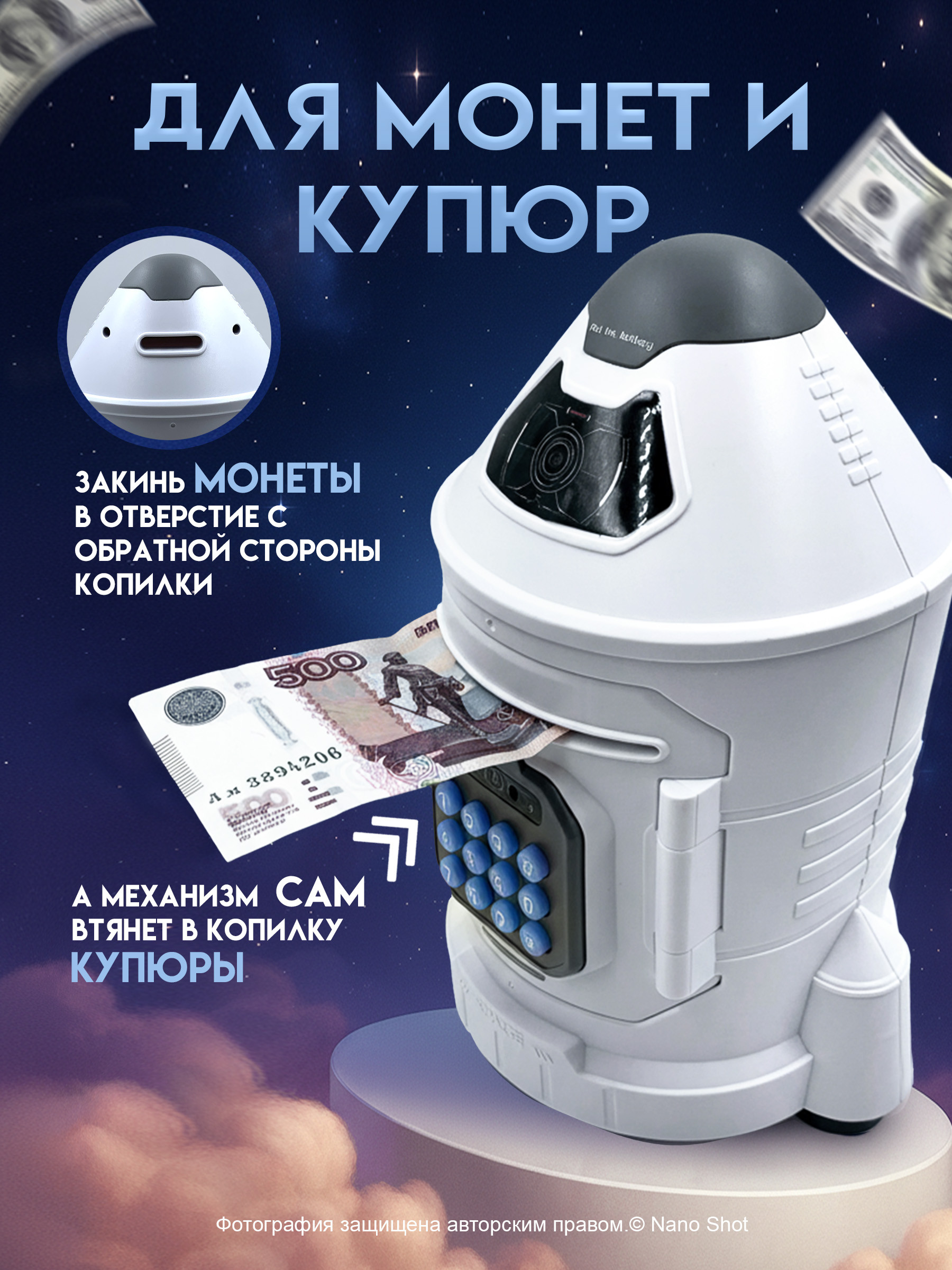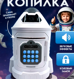 Оригинальная копилка сейф в форме ракеты с кодовым замком. Для снятия денег необходимо набрать пин-код и поднести поближе ваше лицо (имитация функции распознавания). И только после этого заветный ящик с деньгами распахнется. Классной фишкой также является купюроприемник с функцией автоматического затягивания банкнот. Просто поднесите к нему купюру и он моментально проглотит ее. Также имеется слот для монет.