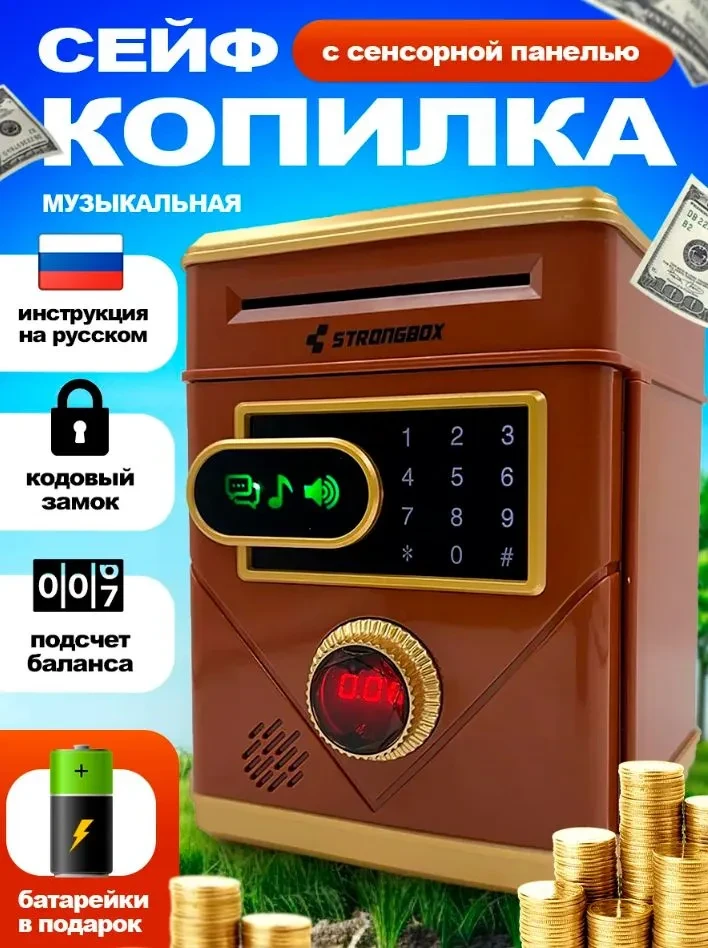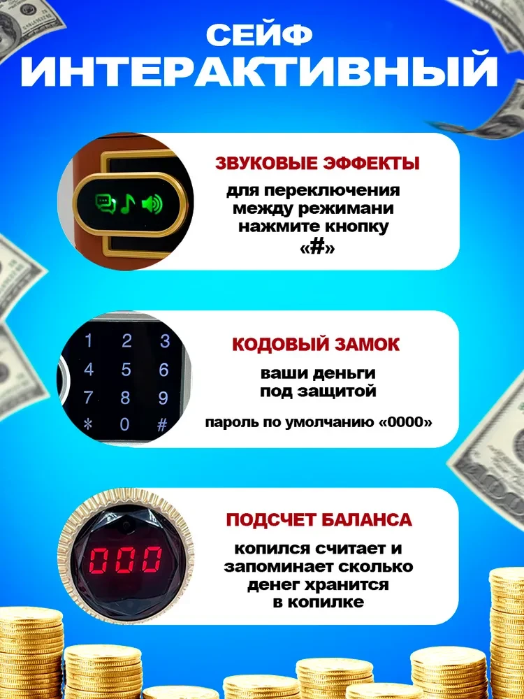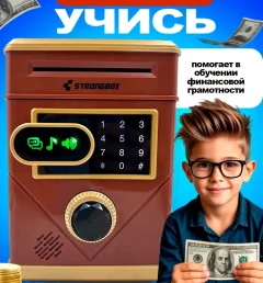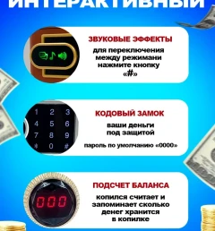 Подрастающим мальчикам и девочкам очень хочется быть похожими на своих родителей, а значит и их детские игрушки должны быть более «взрослыми». Сейф – копилка со звуковыми эффектами и подсветкой от бренда Nano Shot – оригинальная идея для подарка подрастающему поколению! Все мы наверняка помним свинью – копилку из детства. Детская копилка обычно была сделана в виде милого животного с прорезью для денег. А вот чтобы потратить честно скопленные сбережения, приходилось разбивать игрушечную копилку… Cейф поможет накопить на «мечту», но после этого прощаться с интерактивным банкоматом не нужно. Модный дизайн и особенности конструкции сейфа - банкомата продуманы до мелочей. Для работы электронного банкомата понадобятся 3 батарейки типа АА и установка кодового замка. Заводские настройки детского сейфа предполагают введение стандартного пароля «0000». Обладатель копилки для детей конечно захочет придумать свой тайный код – не забудьте объяснить ребенку необходимость и важность запоминания этих «магических» цифр. Несколько простых шагов и копилка – сейф надежно охраняет детские ценности: открыть детскую копилку – нажать кнопку «звездочка» - после загорания двух индикаторов ввести новый пин – код – нажать кнопку «решетка». При необходимости входной код можно поменять с помощью извлечения источника питания на 30 минут. Для открытия дверцы банковского сейфа наберите код, после чего должен загореться световой индикатор правильности ввода пин – кода. Вашему ребенку многочисленная родня передала подарки в «конвертах»? или малыш уже достаточно взрослый для карманных денег? Тогда пришло время поговорить с ним о финансовой грамотности и безопасности. Реалистичная копилка сейф практичная обучающая игрушка, с которой ваше чадо не только интересно проведет время, но и научится бережливости и терпению. Мини – копия банкомата выполняет весь функционал настоящего сейфа для детей. Вашему вниманию представляем новинку! Интерактивная копилка-сейф-банкомат станет прекрасным подарком ребёнку! Активный купюроприемник, как в настоящем банкомате, легко затягивает купюру внутрь, тем самым вызывая восторг у детей. Давно замечено, что маленьким детям свойственно копить. Объясните ребенку, что накопив определенную сумму, он сможет купить необходимую вещь. Копилка для денег поможет избежать спонтанных покупок, и это здорово сбережет семейный бюджет. Кодовый замок исключает доступ к копилке -банкомату случайных лиц, а значит все детские секреты будут под надежным замком!