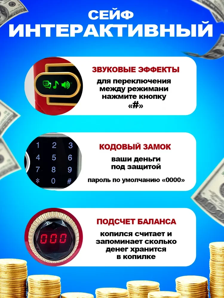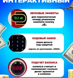 Подрастающим мальчикам и девочкам очень хочется быть похожими на своих родителей, а значит и их детские игрушки должны быть более «взрослыми». Сейф – копилка со звуковыми эффектами и подсветкой от бренда Nano Shot – оригинальная идея для подарка подрастающему поколению! Все мы наверняка помним свинью – копилку из детства. Детская копилка обычно была сделана в виде милого животного с прорезью для денег. А вот чтобы потратить честно скопленные сбережения, приходилось разбивать игрушечную копилку… Cейф поможет накопить на «мечту», но после этого прощаться с интерактивным банкоматом не нужно. Модный дизайн и особенности конструкции сейфа - банкомата продуманы до мелочей. Для работы электронного банкомата понадобятся 3 батарейки типа АА и установка кодового замка. Заводские настройки детского сейфа предполагают введение стандартного пароля «0000». Обладатель копилки для детей конечно захочет придумать свой тайный код – не забудьте объяснить ребенку необходимость и важность запоминания этих «магических» цифр. Несколько простых шагов и копилка – сейф надежно охраняет детские ценности: открыть детскую копилку – нажать кнопку «звездочка» - после загорания двух индикаторов ввести новый пин – код – нажать кнопку «решетка». При необходимости входной код можно поменять с помощью извлечения источника питания на 30 минут. Для открытия дверцы банковского сейфа наберите код, после чего должен загореться световой индикатор правильности ввода пин – кода. Вашему ребенку многочисленная родня передала подарки в «конвертах»? или малыш уже достаточно взрослый для карманных денег? Тогда пришло время поговорить с ним о финансовой грамотности и безопасности. Реалистичная копилка сейф практичная обучающая игрушка, с которой ваше чадо не только интересно проведет время, но и научится бережливости и терпению. Мини – копия банкомата выполняет весь функционал настоящего сейфа для детей. Вашему вниманию представляем новинку! Интерактивная копилка-сейф-банкомат станет прекрасным подарком ребёнку! Активный купюроприемник, как в настоящем банкомате, легко затягивает купюру внутрь, тем самым вызывая восторг у детей. Давно замечено, что маленьким детям свойственно копить. Объясните ребенку, что накопив определенную сумму, он сможет купить необходимую вещь. Копилка для денег поможет избежать спонтанных покупок, и это здорово сбережет семейный бюджет. Кодовый замок исключает доступ к копилке -банкомату случайных лиц, а значит все детские секреты будут под надежным замком!