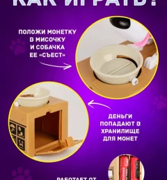 Положите любую монетку на копилку, после чего приоткроется створка, и вы увидите круглые глазки питомца, наблюдающие за новым предметом. Питомец аккуратно высунет лапку и стащит монетку в свой домик-копилку. Работает от двух батареек АА (в комплект не входят). Размер копилки 8 см х 15 см х 17 см.
