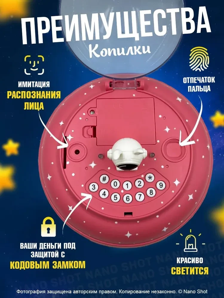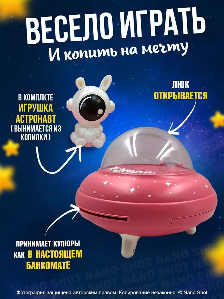 Копилка для денег летающая тарелка и астронавт - это интерактивный и забавный предмет, который поможет сделать процесс накопления денег более увлекательным. Эта копилка для монет выполнена в виде НЛО с астронавтом на борту, что придает ей уникальный и футуристический вид. Приблизившись к копилке, астронавт оживает, активируя различные световые и звуковые эффекты, создавая ощущение, что он действительно находится на космическом корабле. Копилка-астронавт оснащена специальным отверстием для монет, через которое вы можете бросить монеты и наблюдать за их перемещением внутри копилки. Когда астронавт видит, что вы бросаете монеты, он начинает двигаться и издавать звуки, как будто управляет своим космическим кораблем. Интерактивная музыкальная электронная копилка сейф - это удивительный подарок для дома и семьи. Эта декоративная копилка станет не только функциональным элементом интерьера, но и забавным способом сбережения денег. Сейф оснащен купюроприемником, который позволяет удобно вносить деньги, а также кодовым замком для безопасного хранения накоплений.С помощью этой копилки можно вдохновляться на новые мечты и цели, копить на путешествия, подарки или просто на приятные мелочи. Интерактивная функция добавляет удовольствие в процесс копления денег - каждый раз, когда вы кладете монету или купюру, копилка издает музыкальный сигнал или звуковой эффект, что делает процесс еще более увлекательным.Эта копилка идеально подойдет как подарок на день рождения девочке или подростку, а также станет отличным сувениром на свадьбу, новоселье или другой праздник. Оригинальный декор с уникальным дизайном НЛО летающей тарелки копить придаст вашему дому уют и тепло.Не упустите возможность приобрести этот интересный и практичный товар для дома по выгодной цене на распродаже. Удивите своих близких и друзей оригинальным подарком, который будет радовать их каждый день. Создайте свою семейную копилку счастья с этой уникальной электронной копилкой сейфом!