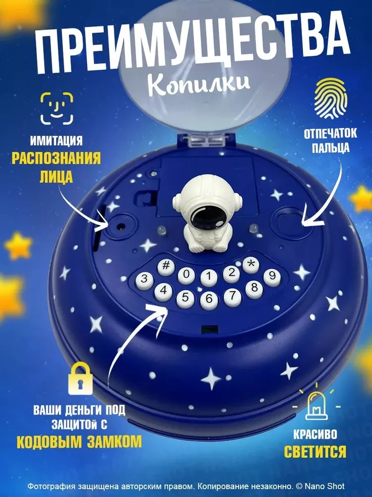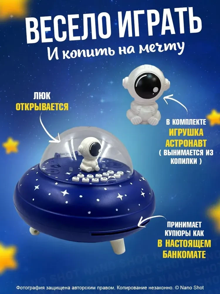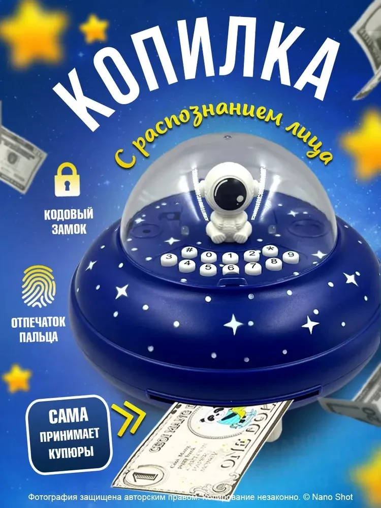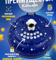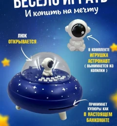 Копилка для денег летающая тарелка и астронавт - это интерактивный и забавный предмет, который поможет сделать процесс накопления денег более увлекательным. Эта копилка для монет выполнена в виде НЛО с астронавтом на борту, что придает ей уникальный и футуристический вид. Приблизившись к копилке, астронавт оживает, активируя различные световые и звуковые эффекты, создавая ощущение, что он действительно находится на космическом корабле. Копилка-астронавт оснащена специальным отверстием для монет, через которое вы можете бросить монеты и наблюдать за их перемещением внутри копилки. Когда астронавт видит, что вы бросаете монеты, он начинает двигаться и издавать звуки, как будто управляет своим космическим кораблем. Интерактивная музыкальная электронная копилка сейф - это удивительный подарок для дома и семьи. Эта декоративная копилка станет не только функциональным элементом интерьера, но и забавным способом сбережения денег. Сейф оснащен купюроприемником, который позволяет удобно вносить деньги, а также кодовым замком для безопасного хранения накоплений.С помощью этой копилки можно вдохновляться на новые мечты и цели, копить на путешествия, подарки или просто на приятные мелочи. Интерактивная функция добавляет удовольствие в процесс копления денег - каждый раз, когда вы кладете монету или купюру, копилка издает музыкальный сигнал или звуковой эффект, что делает процесс еще более увлекательным.Эта копилка идеально подойдет как подарок на день рождения девочке или подростку, а также станет отличным сувениром на свадьбу, новоселье или другой праздник. Оригинальный декор с уникальным дизайном НЛО летающей тарелки копить придаст вашему дому уют и тепло.Не упустите возможность приобрести этот интересный и практичный товар для дома по выгодной цене на распродаже. Удивите своих близких и друзей оригинальным подарком, который будет радовать их каждый день. Создайте свою семейную копилку счастья с этой уникальной электронной копилкой сейфом!