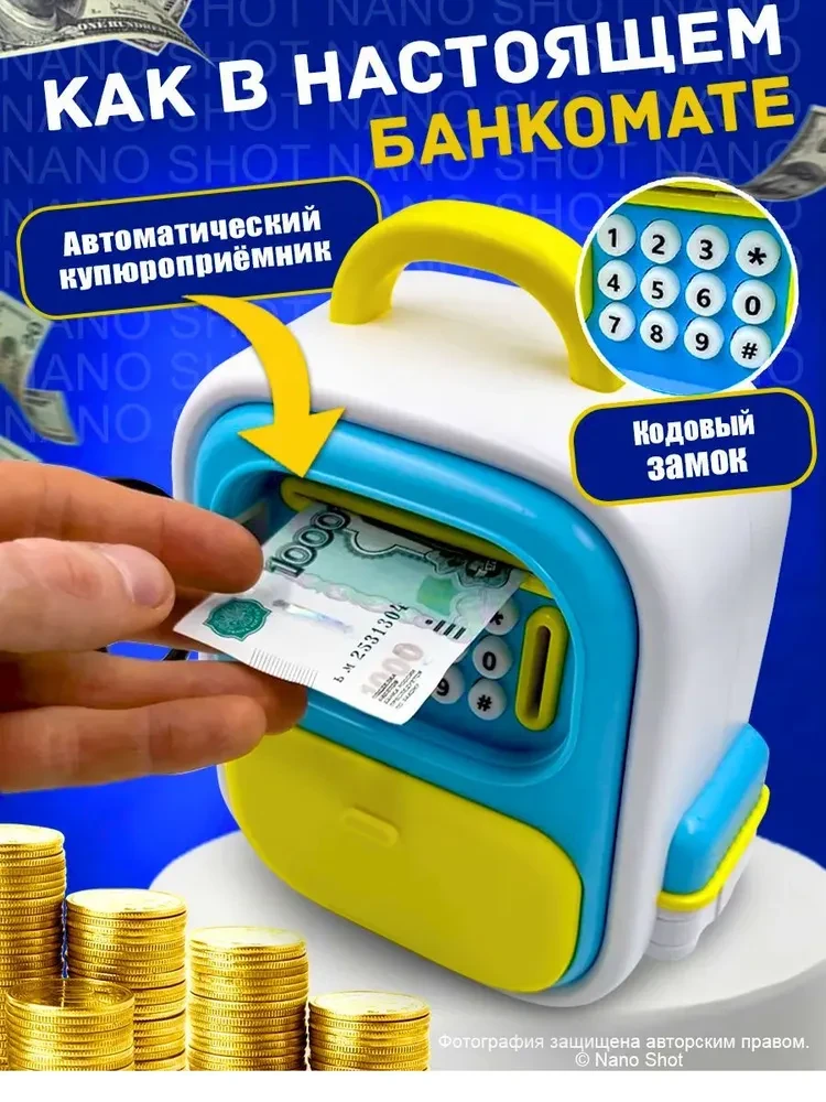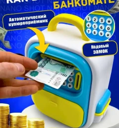 Оригинальная копилка сейф в форме рюкзака с кодовым замком. Здесь все как в настоящем банкомате: для снятия денег необходимо набрать пин-код и поднести поближе ваше лицо (имитация функции распознавания). И только после этого заветный ящик с деньгами распахнется. Классной фишкой также является купюроприемник с функцией автоматического затягивания банкнот. Просто поднесите к нему купюру и он моментально проглотит ее. Также имеется слот для монет.