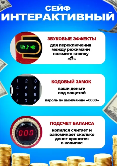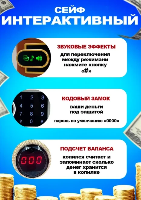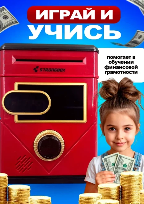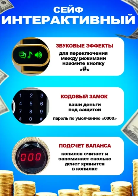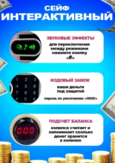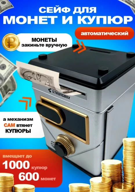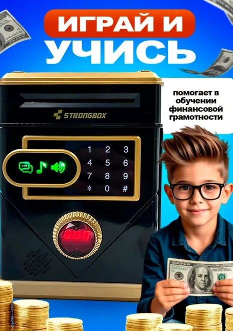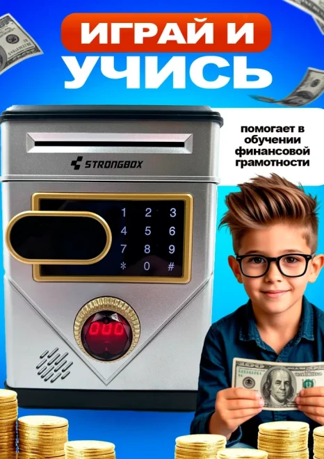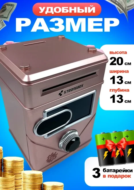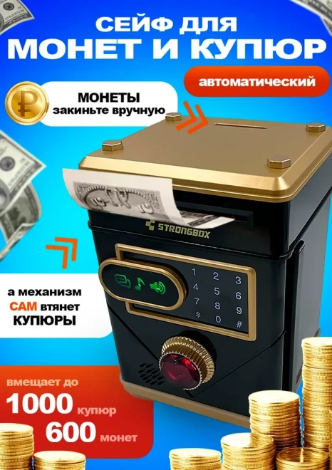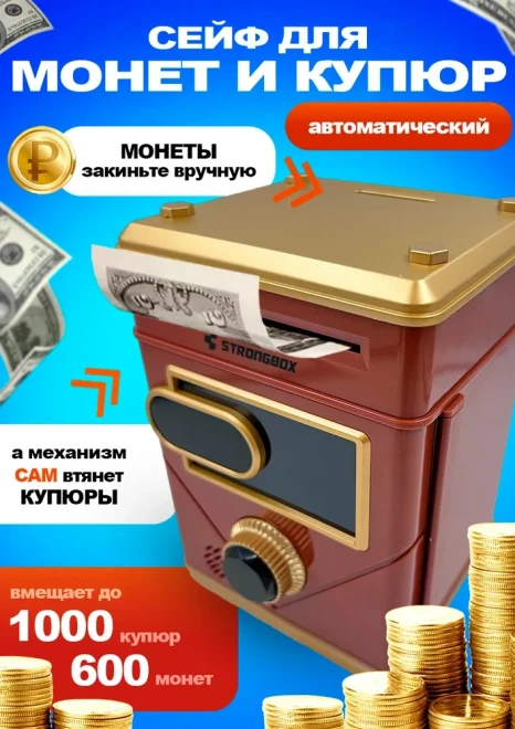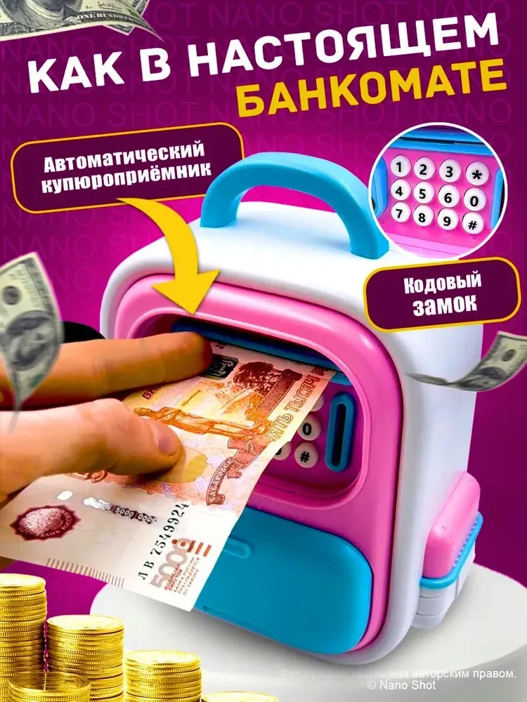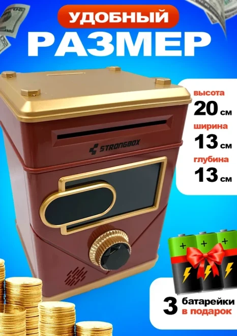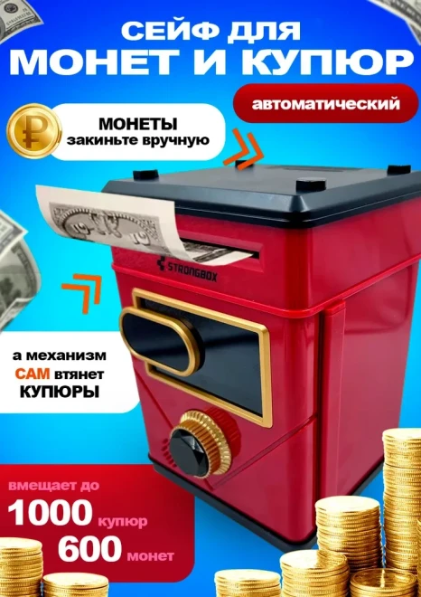 Оригинальная копилка сейф в форме рюкзака с кодовым замком. Здесь все как в настоящем банкомате: для снятия денег необходимо набрать пин-код и поднести поближе ваше лицо (имитация функции распознавания). И только после этого заветный ящик с деньгами распахнется. Классной фишкой также является купюроприемник с функцией автоматического затягивания банкнот. Просто поднесите к нему купюру и он моментально проглотит ее. Также имеется слот для монет.