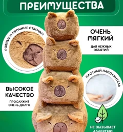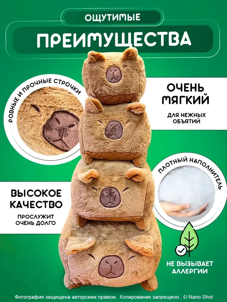 Эта мягкая игрушка разных размеров станет отличным товарищем для детей. Капибара антистресс такая классная, плюшевая, её можно использовать, как подушку для сна- сплюшку. Выберите своего хомяка- капибару! Подарите своим любимым частичку счастья с этой мягкой, нежной и стильной игрушкой- капибара квадрат.