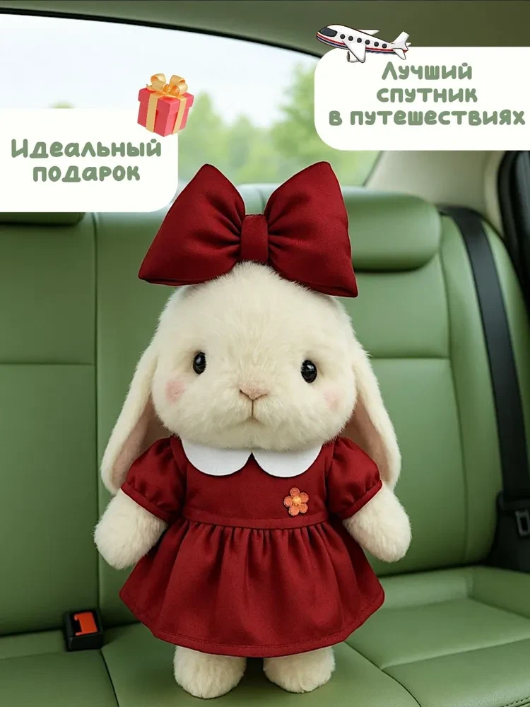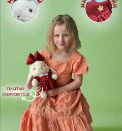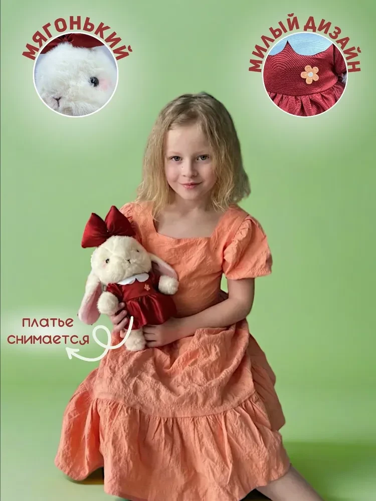Не забывайте, что такой милый подарок способен украсить любой праздник, будь то день рождения или Новый год. Плюшевый кролик станет не только игрушкой, но и стильным элементом декора детской комнаты. Его светло-бежевый цвет и изящное платье прекрасно впишутся в любой интерьер, добавляя ему нотку нежности и уюта.
