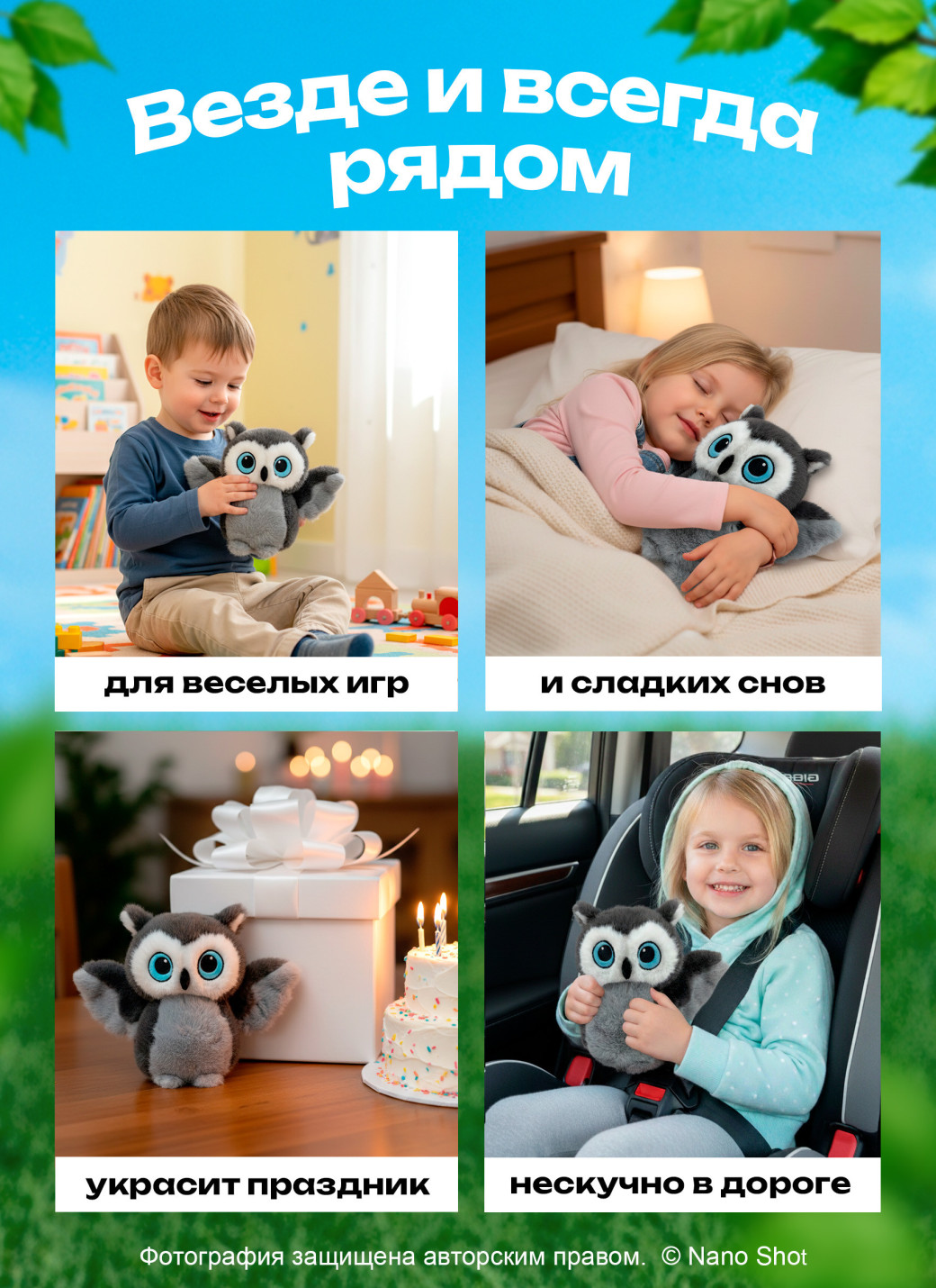 С ней удобно засыпать, ведь она предназначена не только для активных игр, но и для спокойного сна, создавая комфорт и чувство безопасности. Плюшевая сова станет неотъемлемой частью ритуала приготовления ко сну, помогая детям расслабиться и быстрее уснуть.