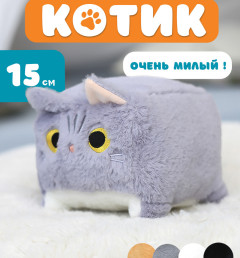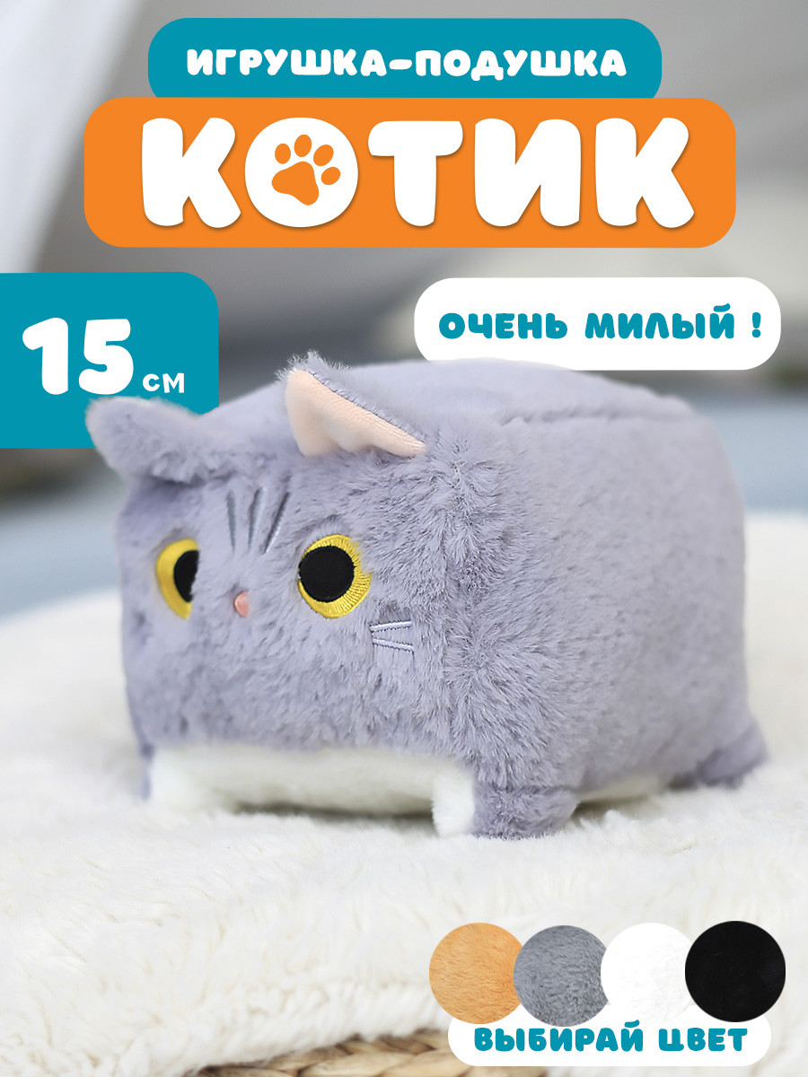 Мягкая игрушка кот-кирпичик котокуб глазастый квадратный котик, серый 15 см