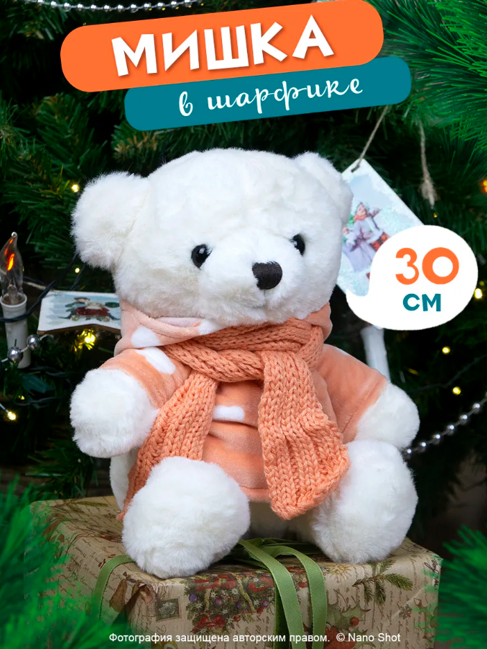 Мягкая игрушка плюшевый Медведь в оранжевом шарфике, 30 см