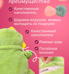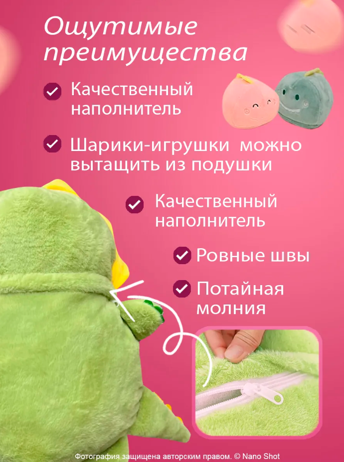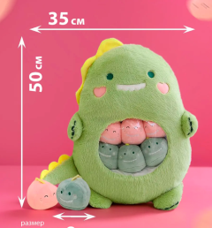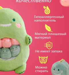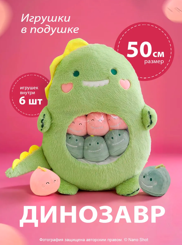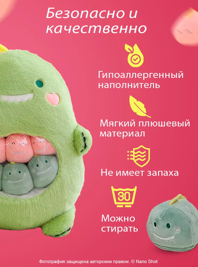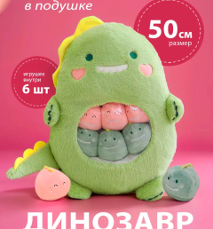 Эта мягкая игрушка дино может использоваться как подушка, что делает её функциональной и практичной. Внутри подушки находится мягкий наполнитель, который позволяет ей сохранять форму и обеспечивать комфорт при использовании. Большая подушка в виде милого динозаврика станет отличным решением для обнимашек и отдыха.