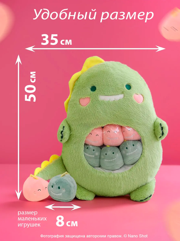 Игрушка динозаврик выполнена в забавном дизайне, который понравится как мальчикам, так и девочкам. Благодаря своей универсальности, она может стать отличным подарком для детей и взрослых. Плюшевые игрушки, такие как этот динозавр, популярны среди маленьких и больших любителей мягких игрушек. Они не только украшают интерьер, но и служат отличным средством для снятия стресса и расслабления.