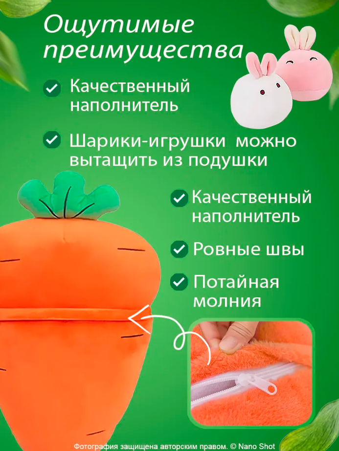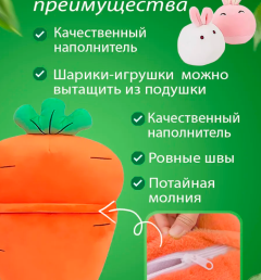 Эта плюшевая игрушка морковка с зайчатами — это не просто подушка, а настоящий элемент уюта и комфорта в вашем доме. Она станет отличным подарком для любого случая, будь то день рождения или просто желание порадовать близкого человека. Вытянуть удовольствие от использования этой игрушки можно в любое время, наслаждаясь её мягкостью и уютом.