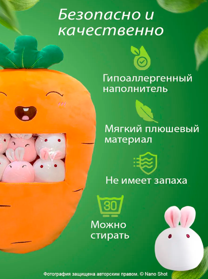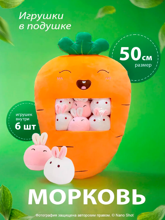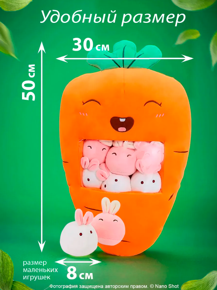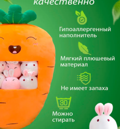 Игрушка морковка с игрушками зайчатами внутри выполнена в забавном дизайне, который понравится как мальчикам, так и девочкам. Благодаря своей универсальности, она может стать отличным подарком для детей и взрослых. Плюшевые игрушки, такие как эта морковка, популярны среди маленьких и больших любителей мягких игрушек. Они не только украшают интерьер, но и служат отличным средством для снятия стресса и расслабления.