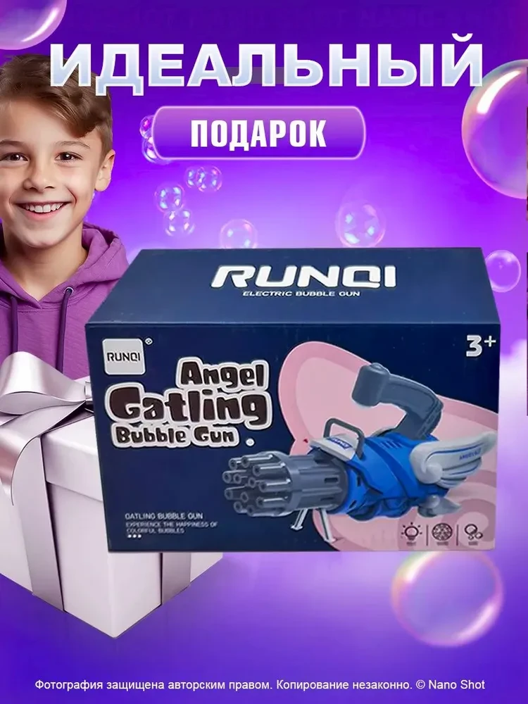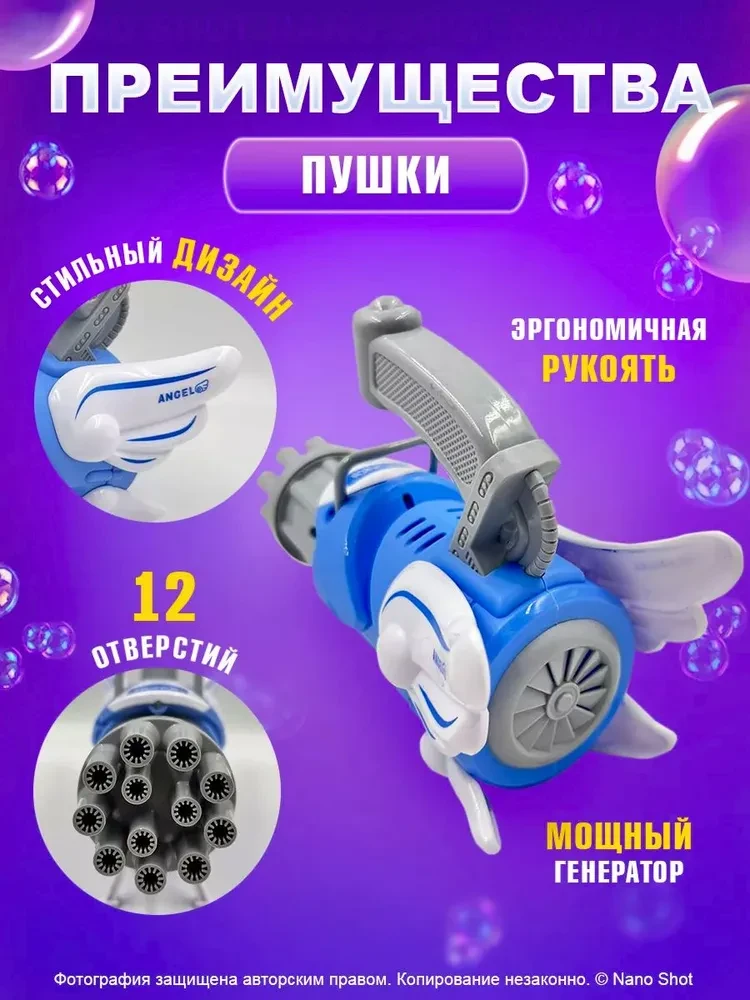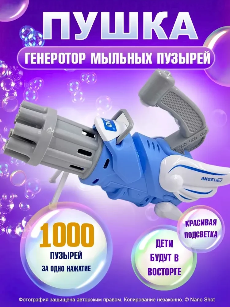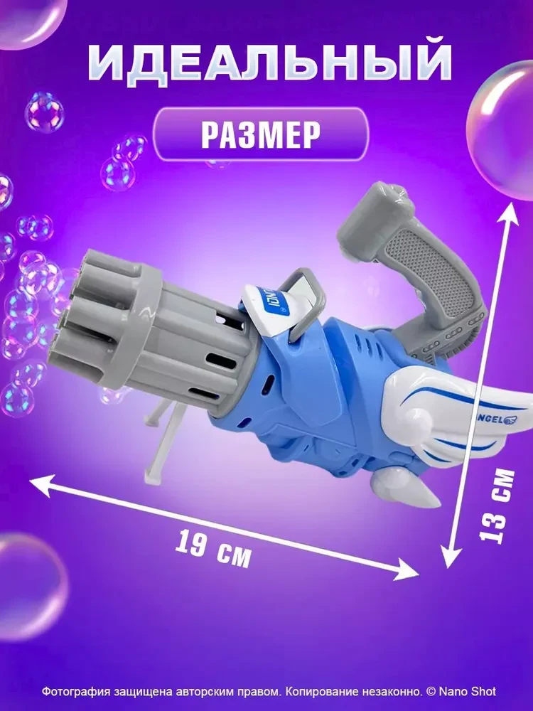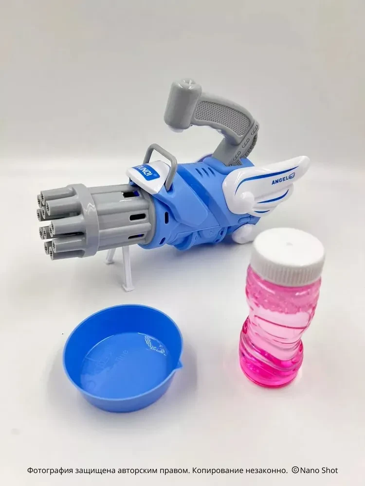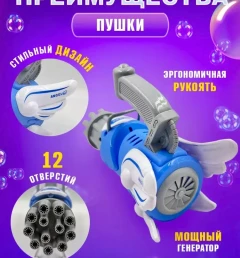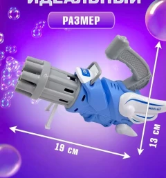 Представляем Вашему вниманию невероятно легкую воздушную игрушку пушку-генератор мыльных пузырей . Генератор мыльных пузырей - пулемет для запуска мыльных пузырей очень удобно лежит в руке, кажется невесомой и воздушной, образуя по-настоящему большое облако мыльных пузырей. Сотни мыльных шариков пускаются в воздух при одном лишь нажатии на кнопку, от такого занятия будет сложно оторваться не только ребенку, но и взрослому. Мыльные пузыри - одна из любимых забав детей. Что может быть веселее, чем устроить мыльное шоу с пузырями или мыльные перестрелки, обстреливая своих соперников каскадом маленьких пузырьков! Так же Генератор может порадовать и взрослых.