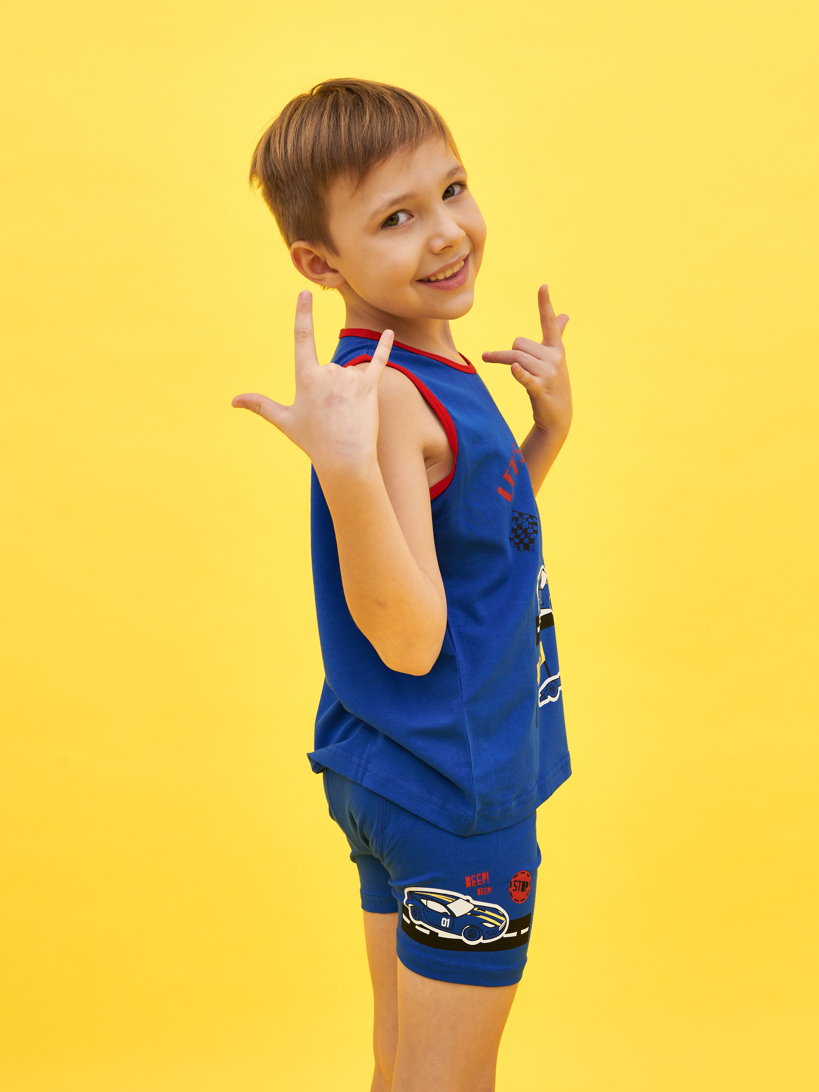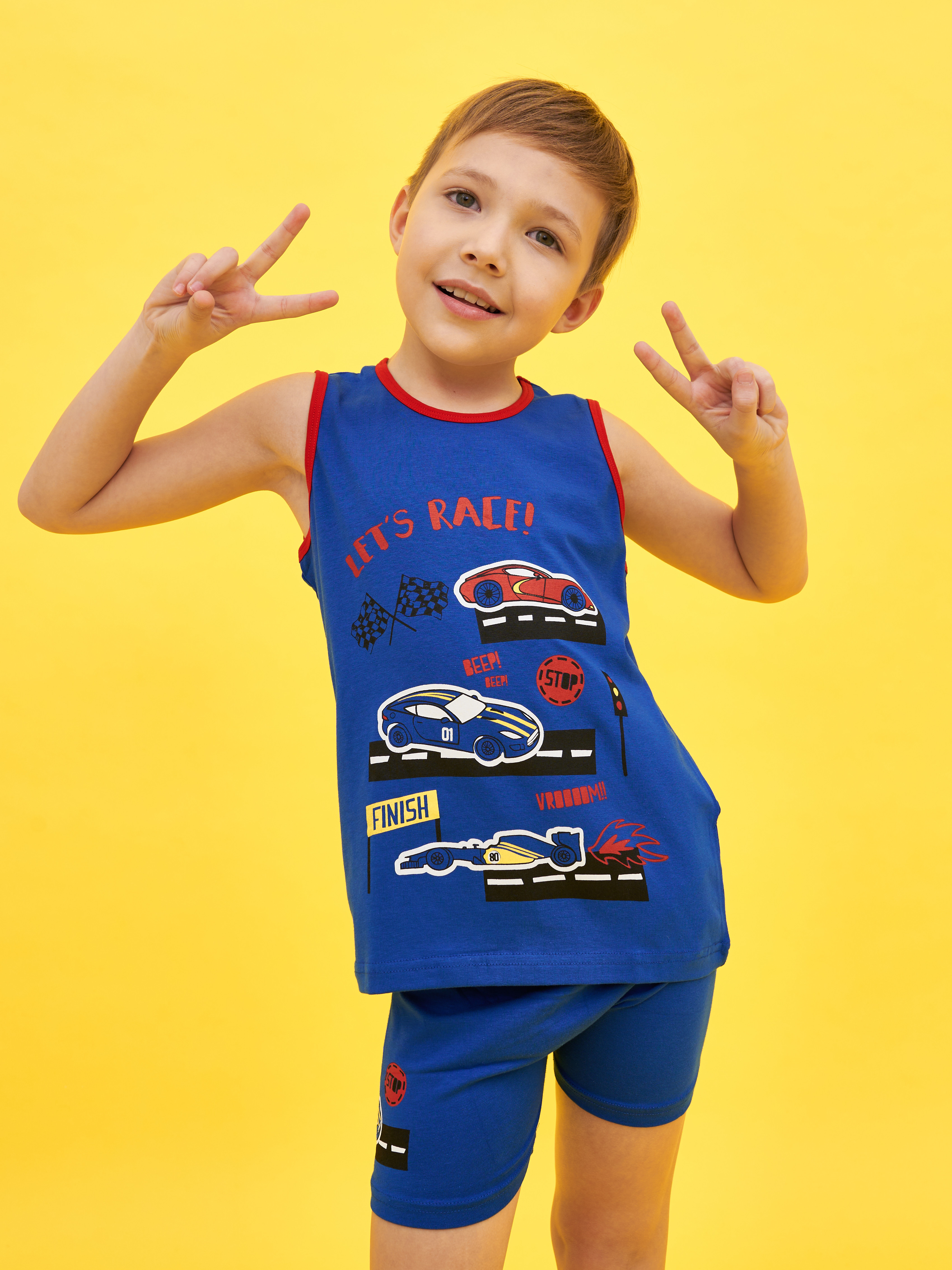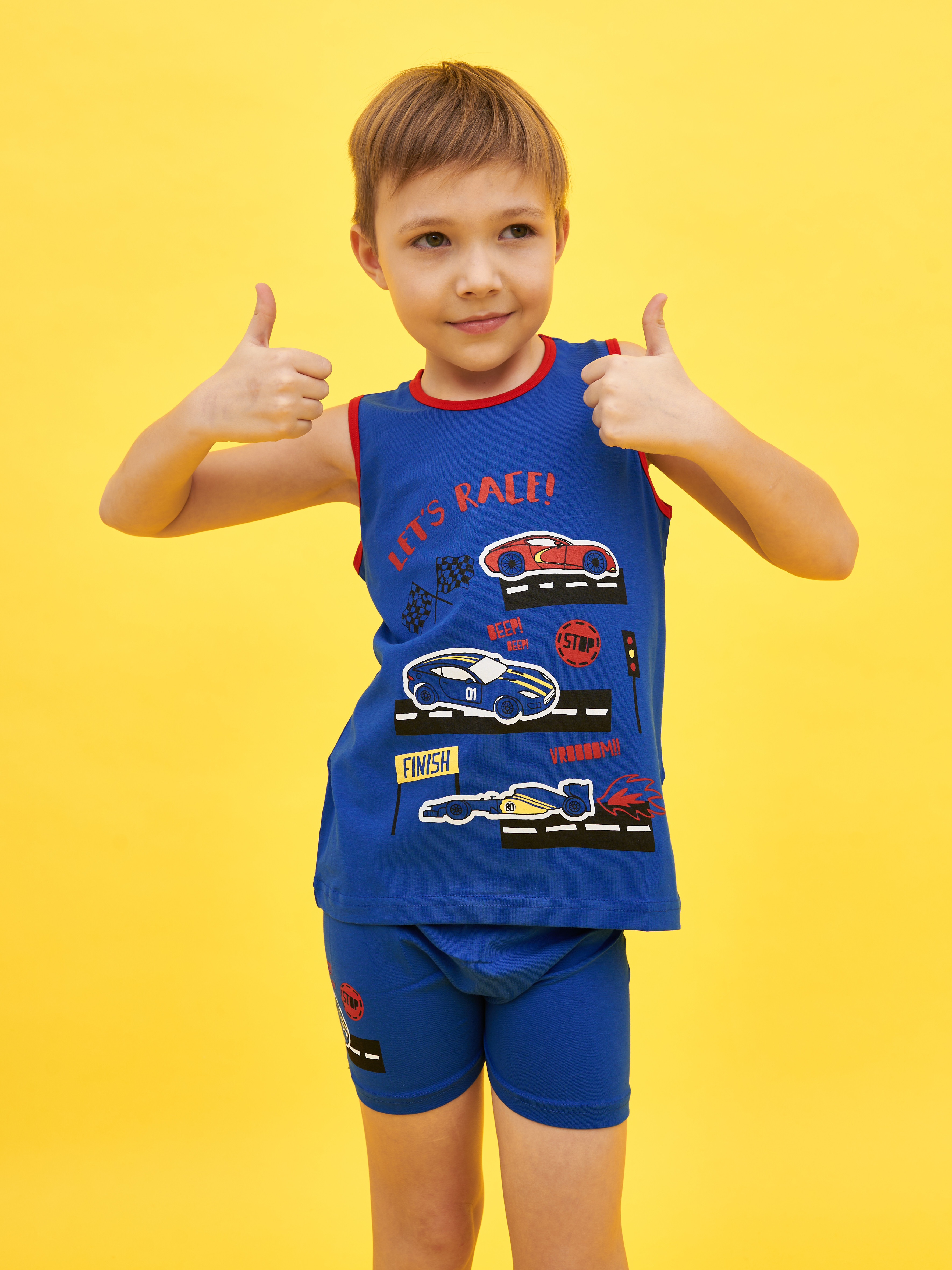 Комплект состоит из футболки с укороченным рукавом и коротких шортиков