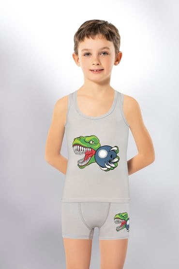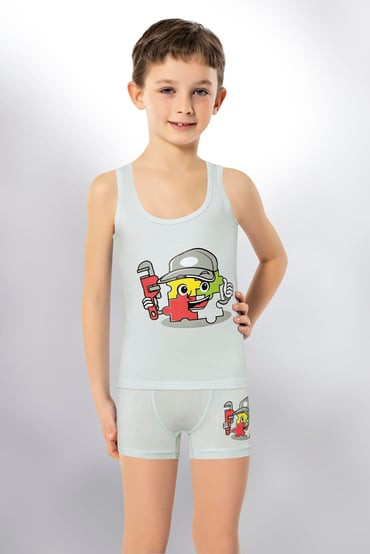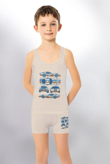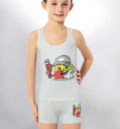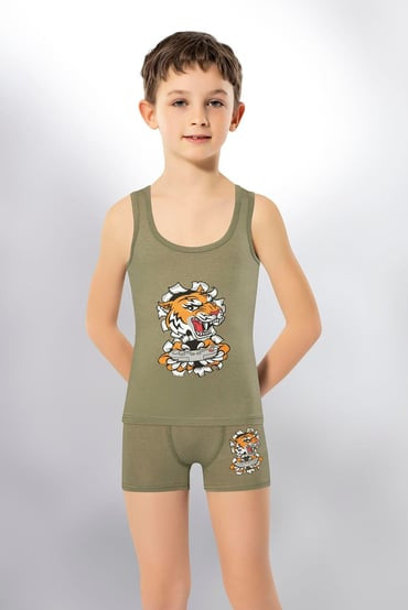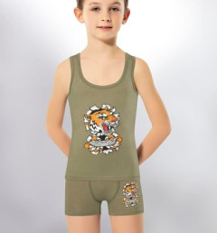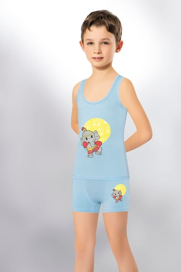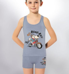 Комплект состоит из майки с широкими плечиками и трусиков боксеров.