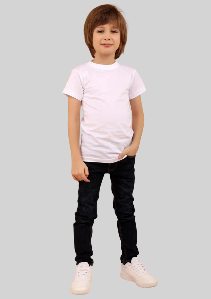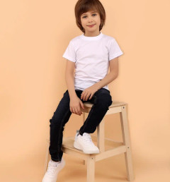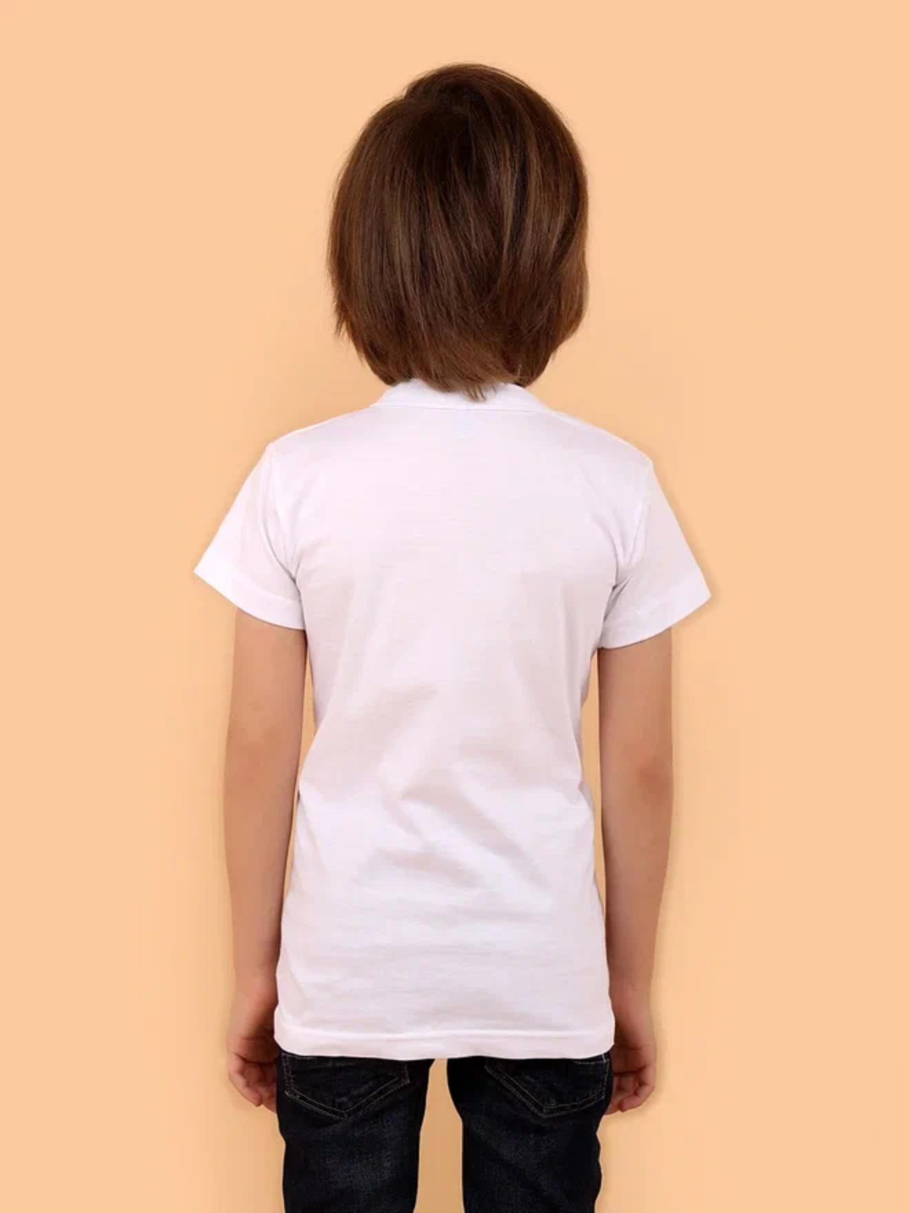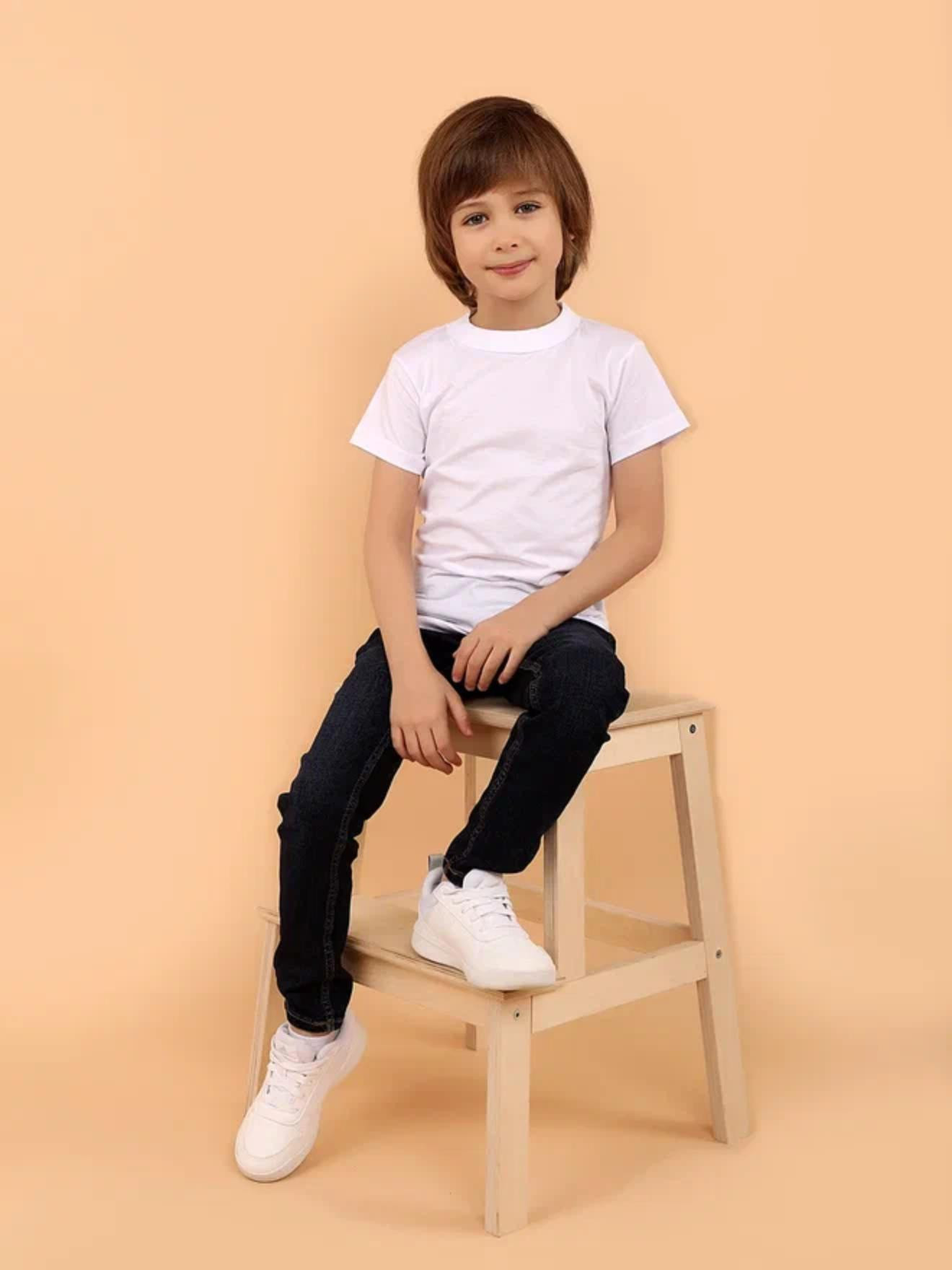Белая футболка для мальчиков, с коротким рукавом, с круглым вырезом горловины. Высокое качество футболки, ровные хорошо обработанные швы. Базовая модель всегда будет выглядеть аккуратно, стильно и лаконично.