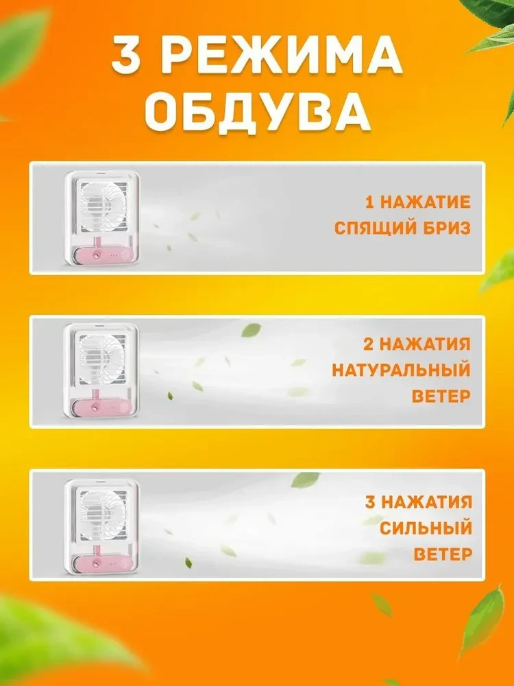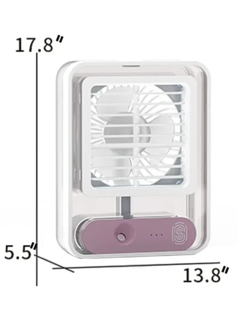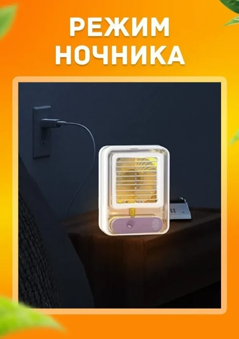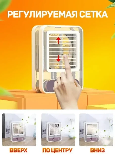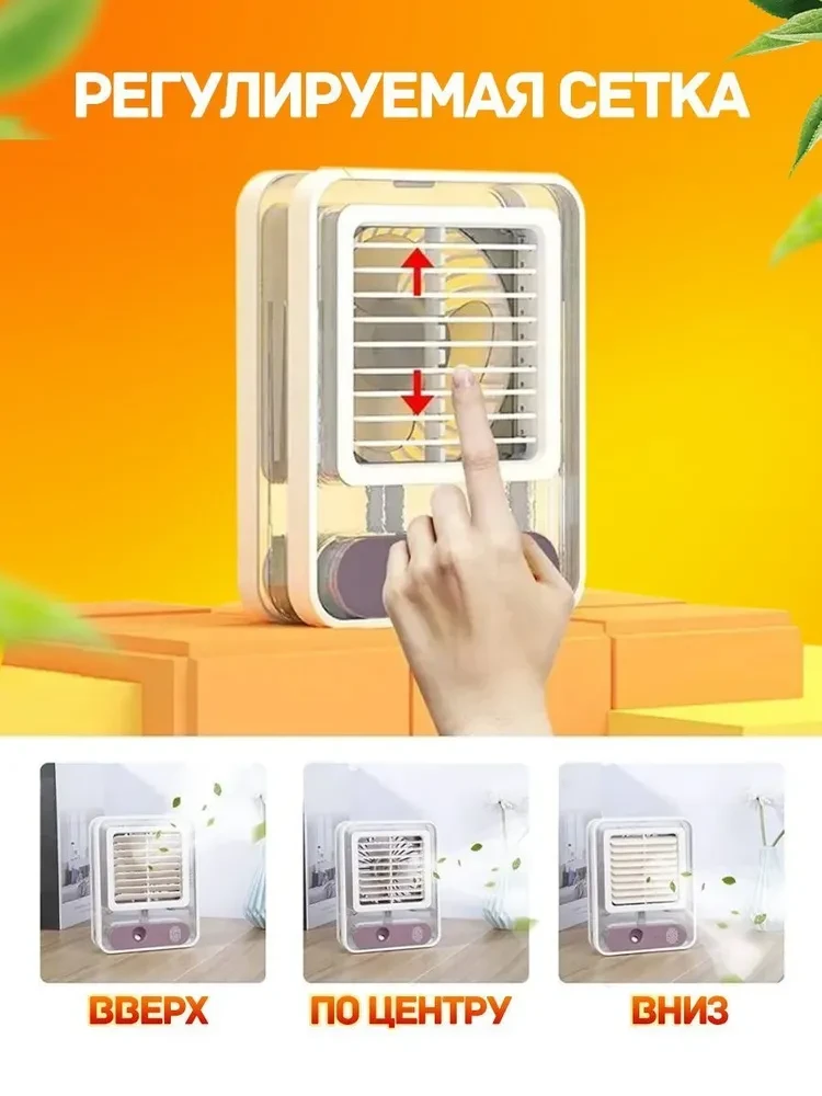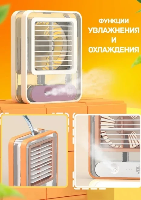 Портативный вентилятор с USB с функцией охлаждения воздуха в корпусе разных цветов. Может работать не только как вентилятор, но и как кондиционер. Внутрь устройства добавьте воду, после чего прибор начнет за счет воды подавать охлажденный воздух. Мини кондиционер отлично справляется с выполнением задачи по созданию комфортных условий в помещении. Симпатичный дизайн и функциональность вентилятора, технические особенности и простое управление являются преимуществами данной модели мини климатической техники.Работает от любого устройства с разъемом USB: компьютера, ноутбука, автомобиля, от сети. Также в комплект входит перезаряжаемый аккумулятор с помощью которого Вы будете в комфортных условиях даже там, где нет источников электричества.На задней панели кондиционера находится переключатель включения / выключения прибора. На передней панели находится сенсорная кнопка управления вентилятором. При коротком нажатии происходит включение вентилятора на слабый режим вращения, при повторном нажатии включается режим средней скорости, при третьем режим быстрого вращения. При длительном нажатии сенсорной кнопки включается ночная подсветка. Для включения функции водяного кондиционирования необходимо налить воды в отверстие сверху устройства до линии максимального уровня и длительно нажать сенсорную кнопку. По нажатии кнопки активируется выпуск водяного тумана, который будет увлажнять окружающее пространство. После этого короткими нажатиями выбрать желаемую скорость вращения вентилятора и наслаждаться прохладным потоком охлажденного воздуха.