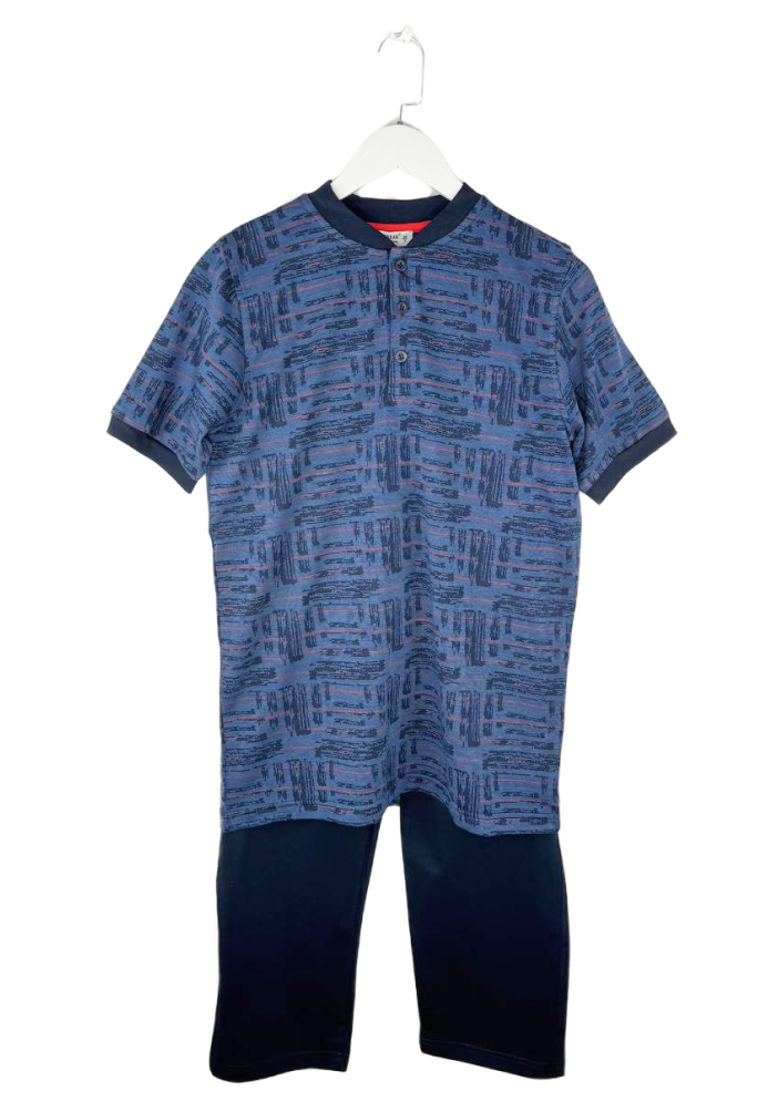 Мужской домашний комплект представлен в удобном сочетании комфортной футболки и мягких хлопковых штанов, предназначенных для приятного отдыха и расслабления в домашних условиях.