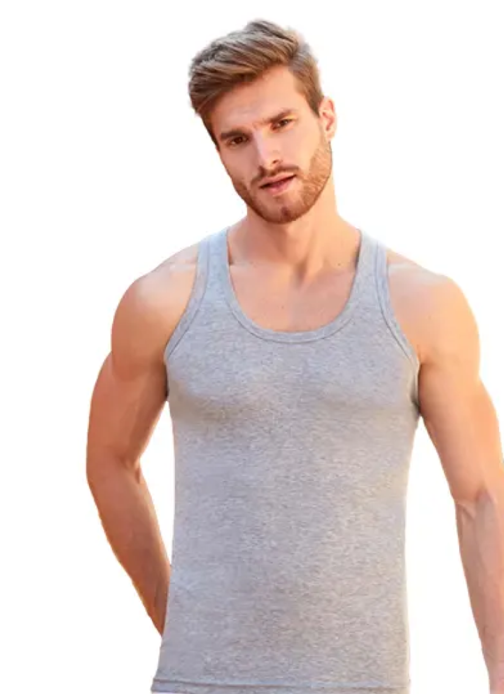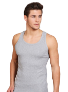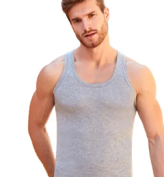 Мужская майка Berrak серого цвета на широких лямках. Приталенная и удлиненная. Классическая спина. Майка изготовлена из 70% полиэстера и 30% хлопка. Без боковых швов представляет собой простую и элегантную одежду, которая может использоваться как нижнее белье или как верхний слой в зависимости от стиля и предпочтений владельца. Она имеет облегающий крой, который подчеркивает фигуру. Ткань рибана