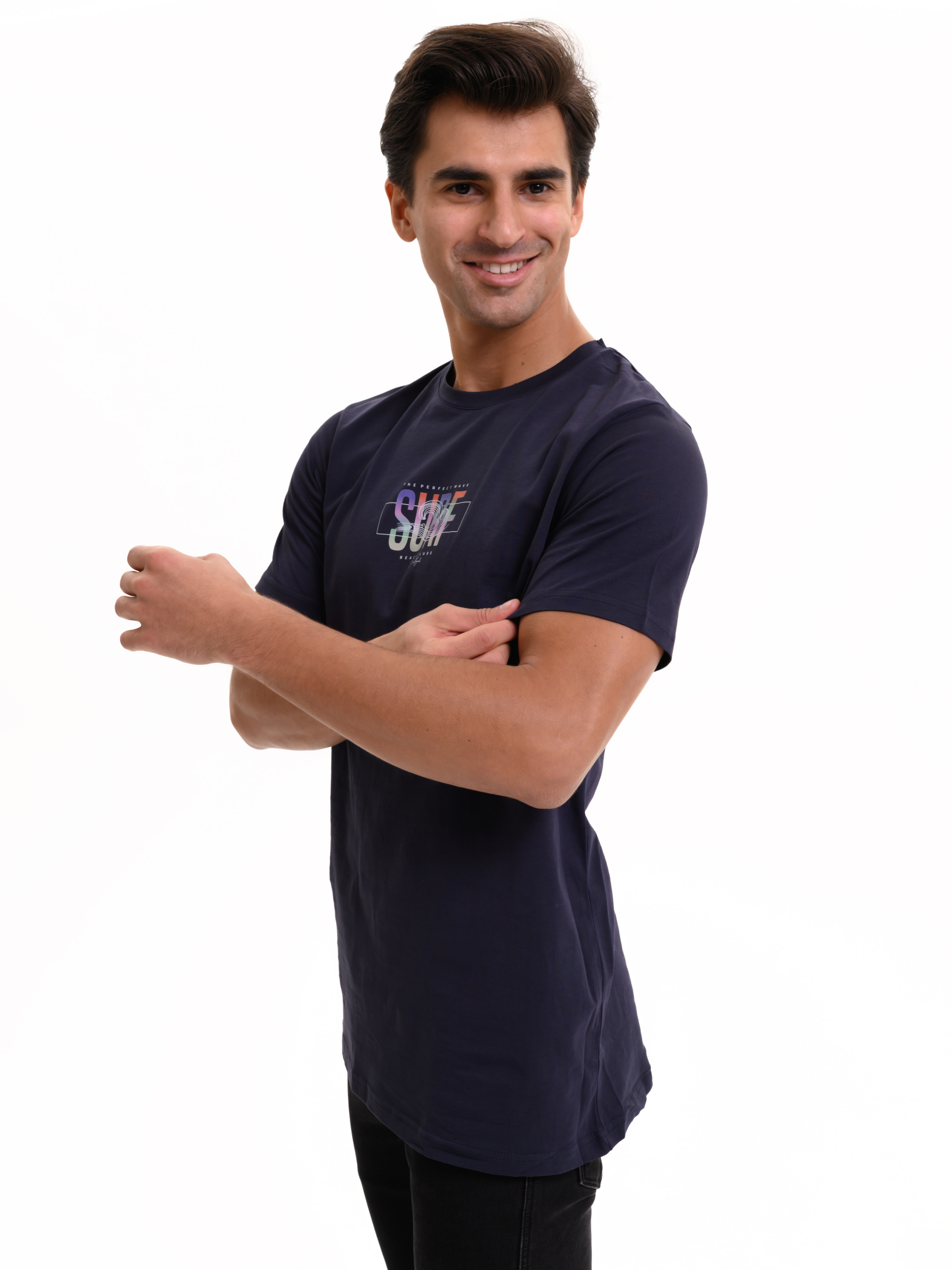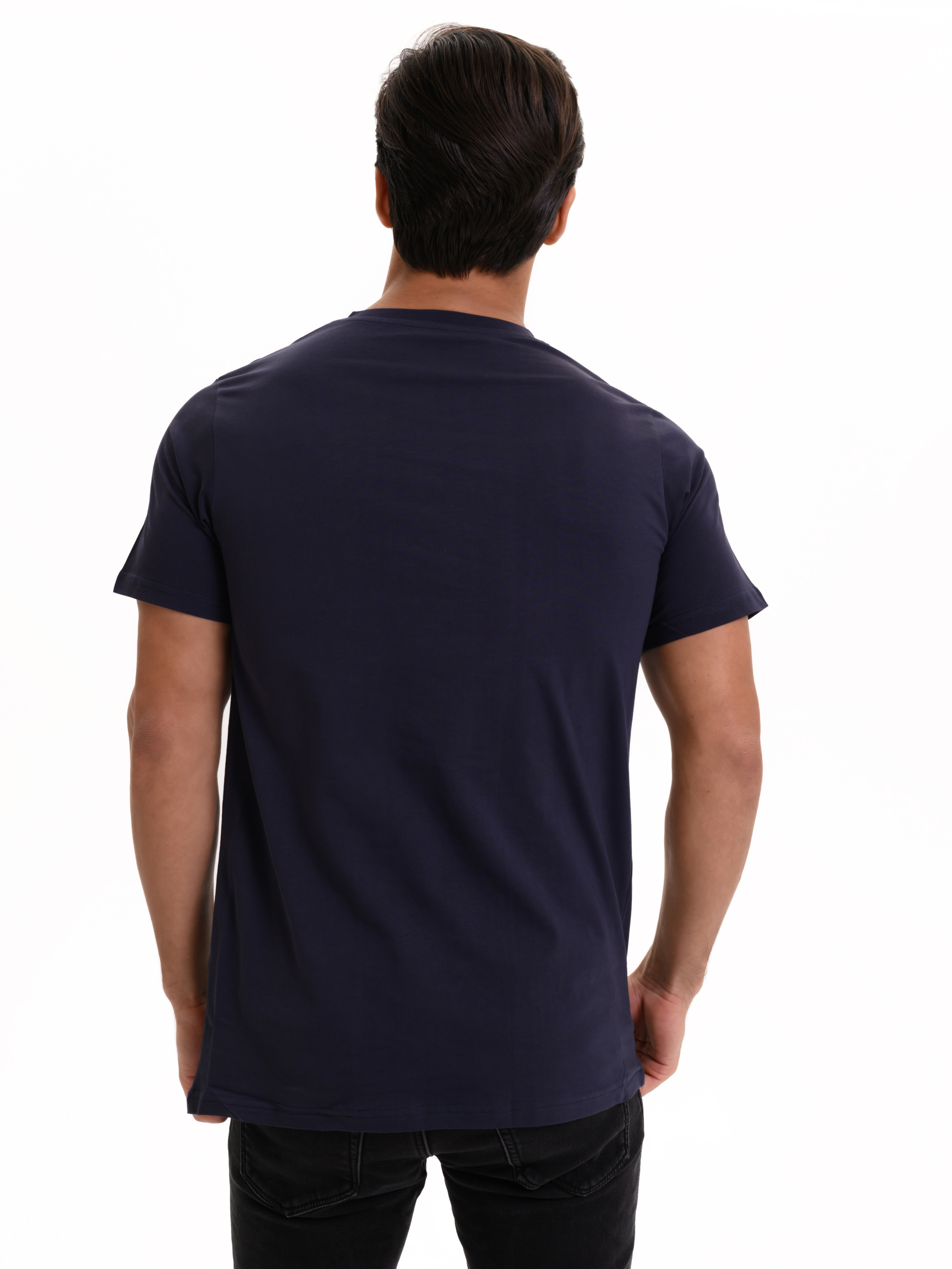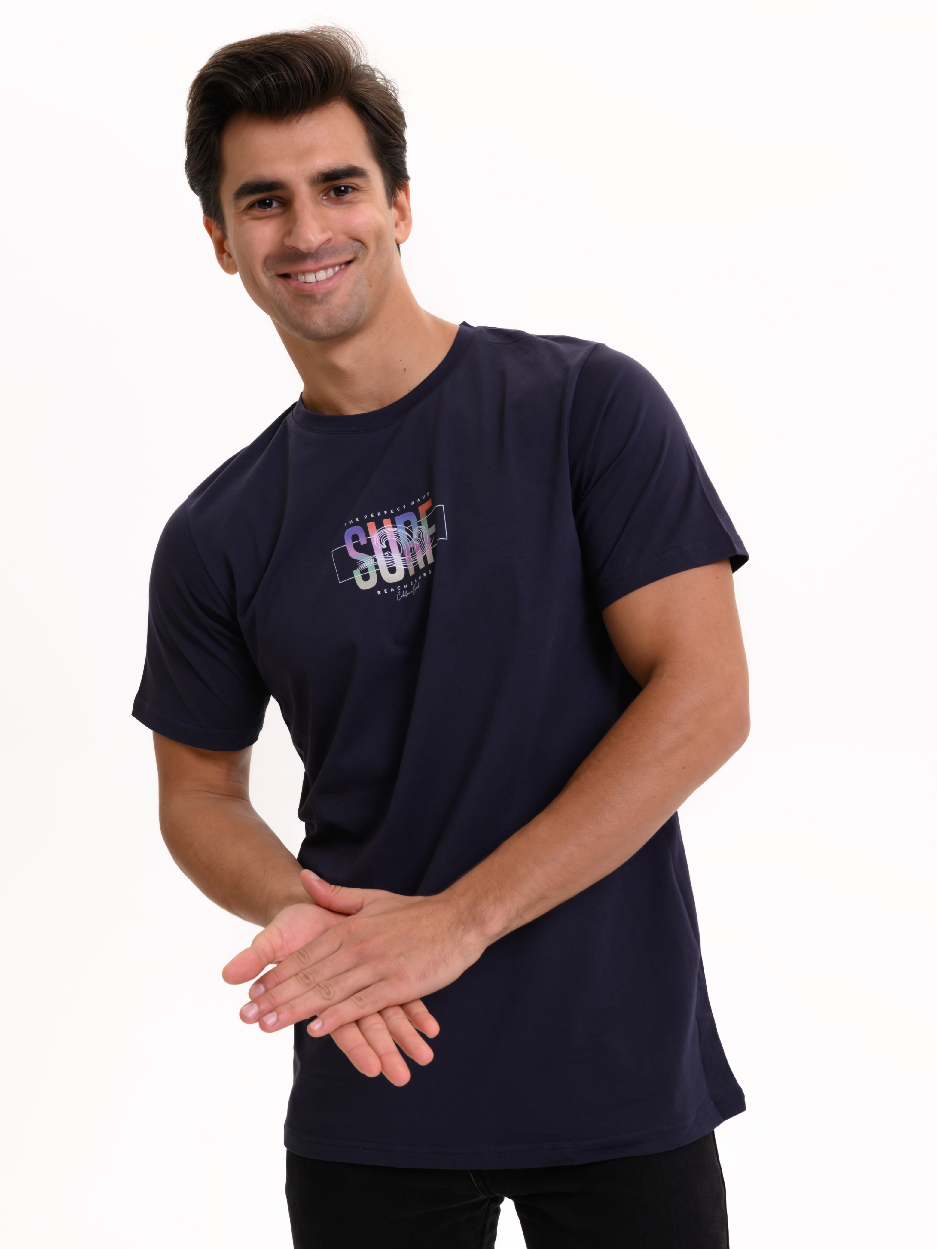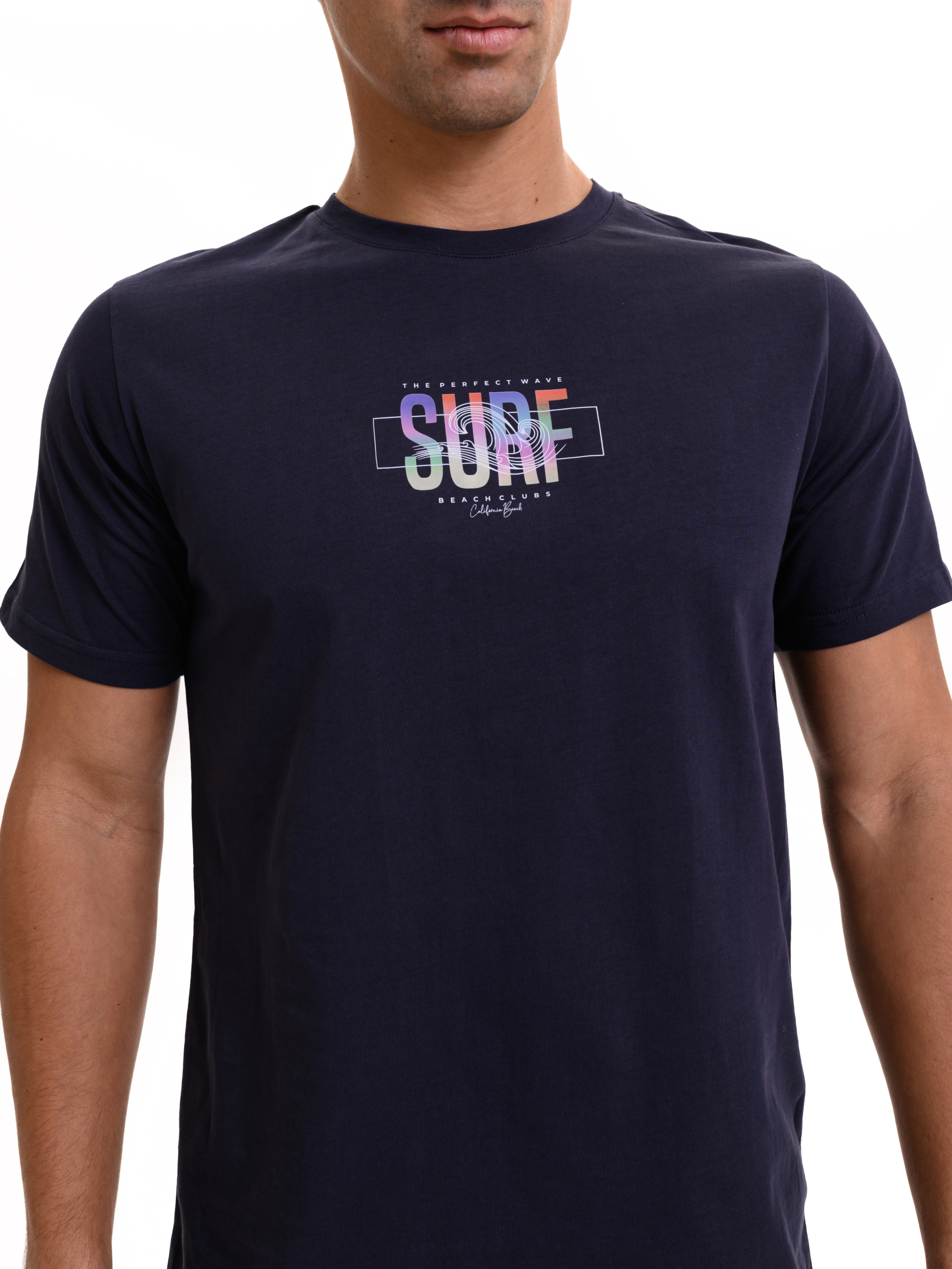 Футболка Berrak классического фасона темно-синего цвета прямого кроя, с коротким рукавом и округлым вырезом. Свободная посадка. С принтом. Рукав втачной с манжетом. Футболка сшита из 100 % хлопка pamuk.
