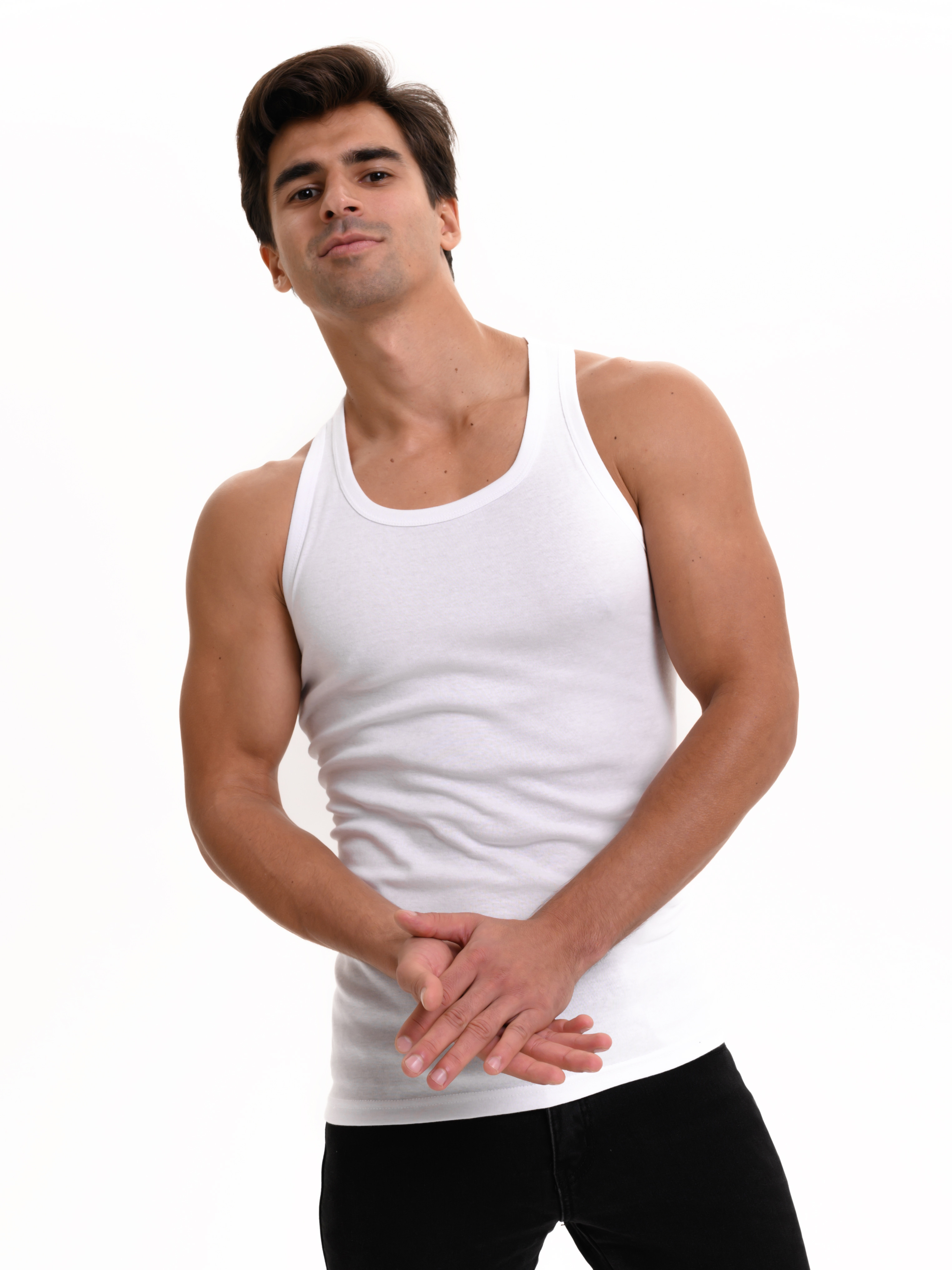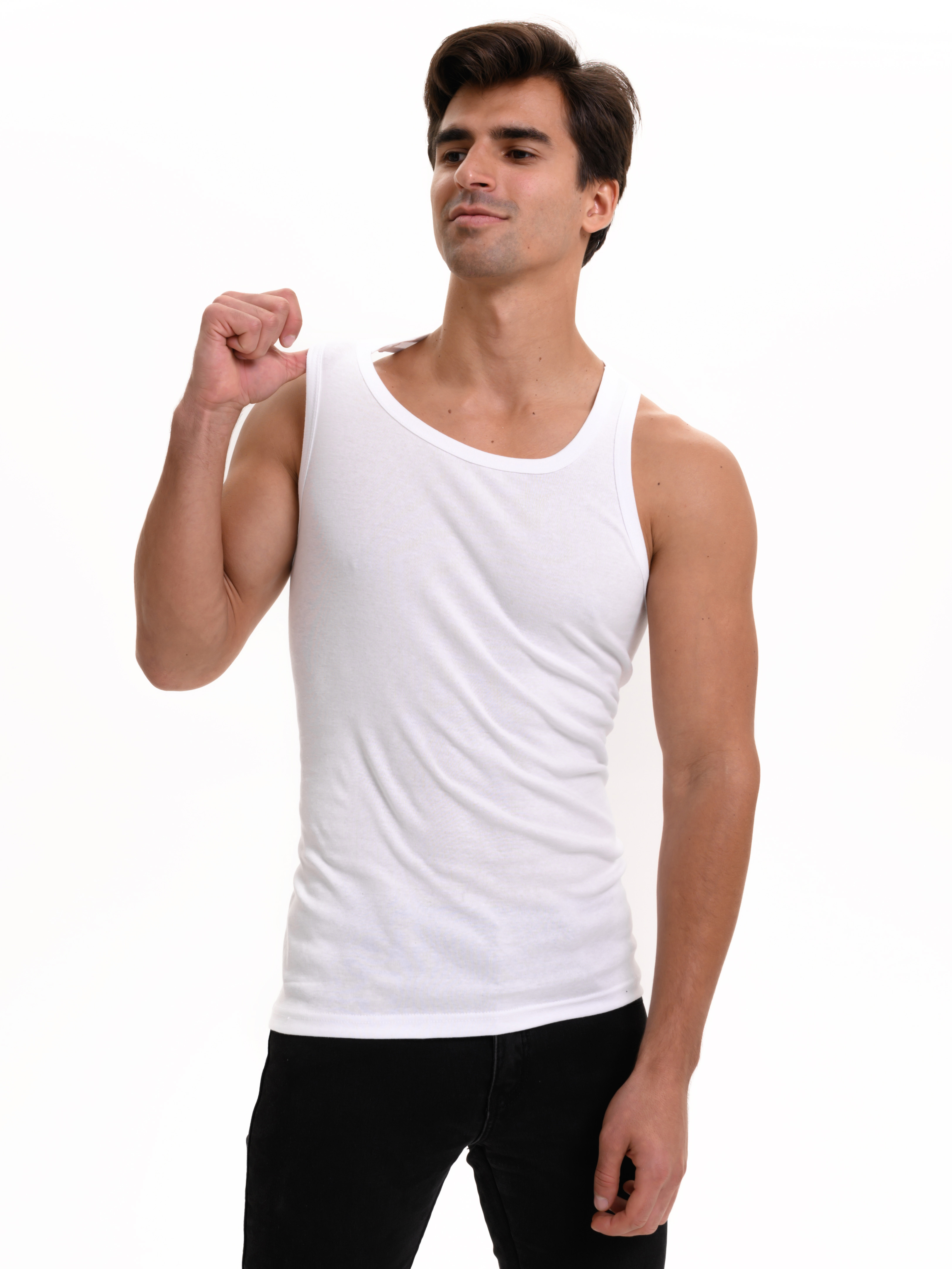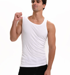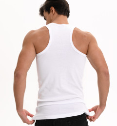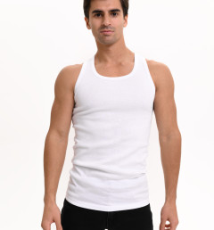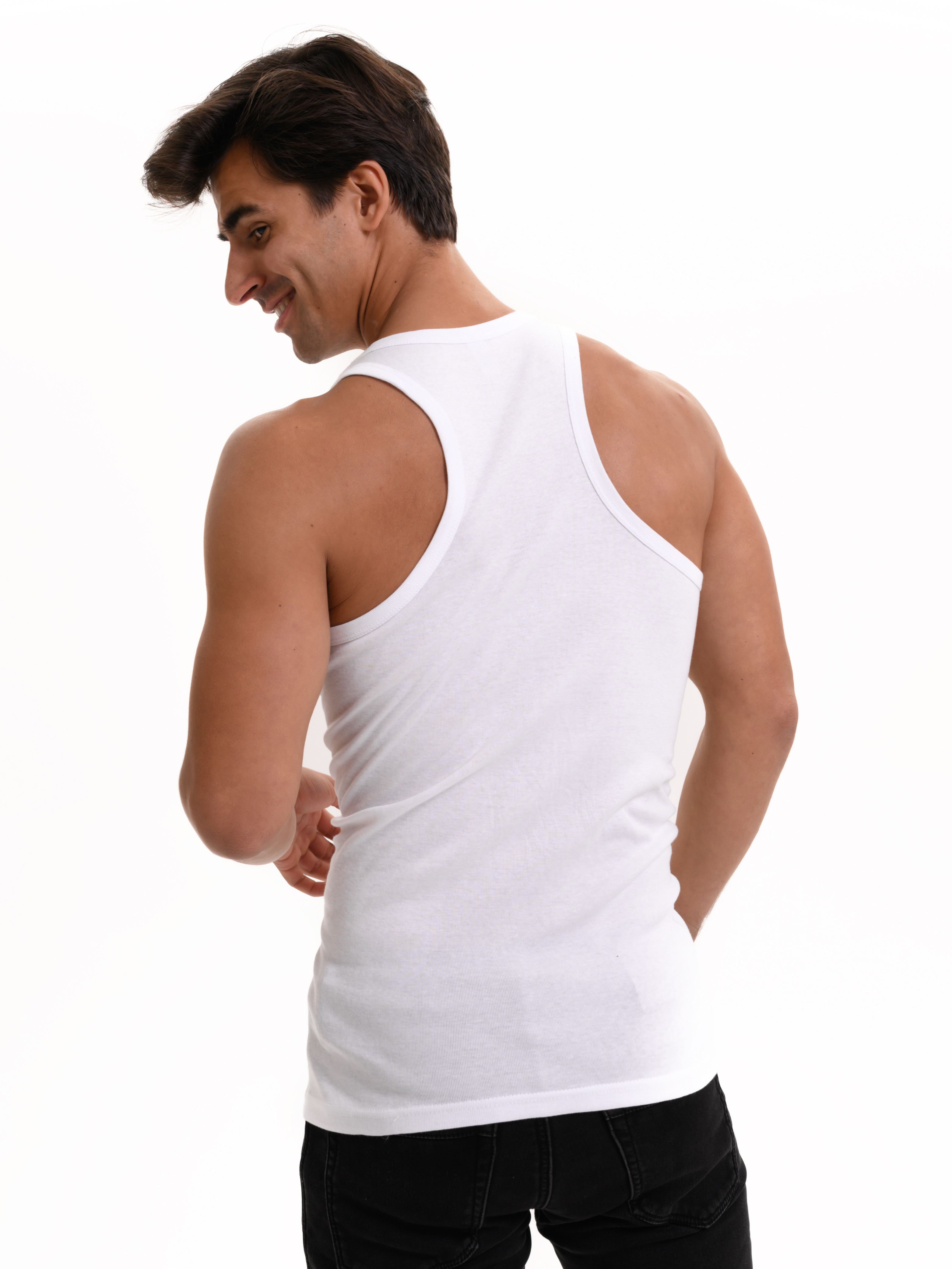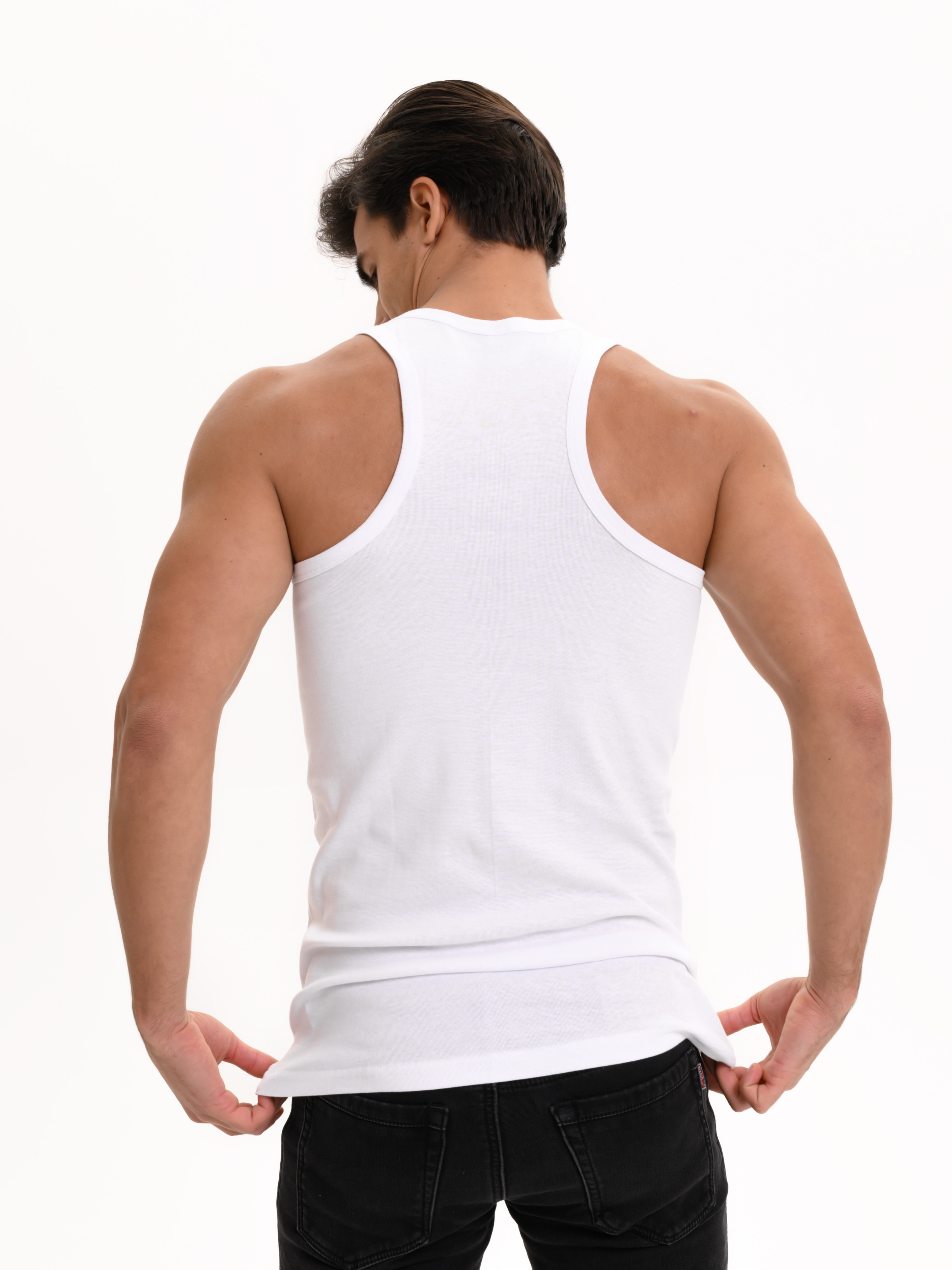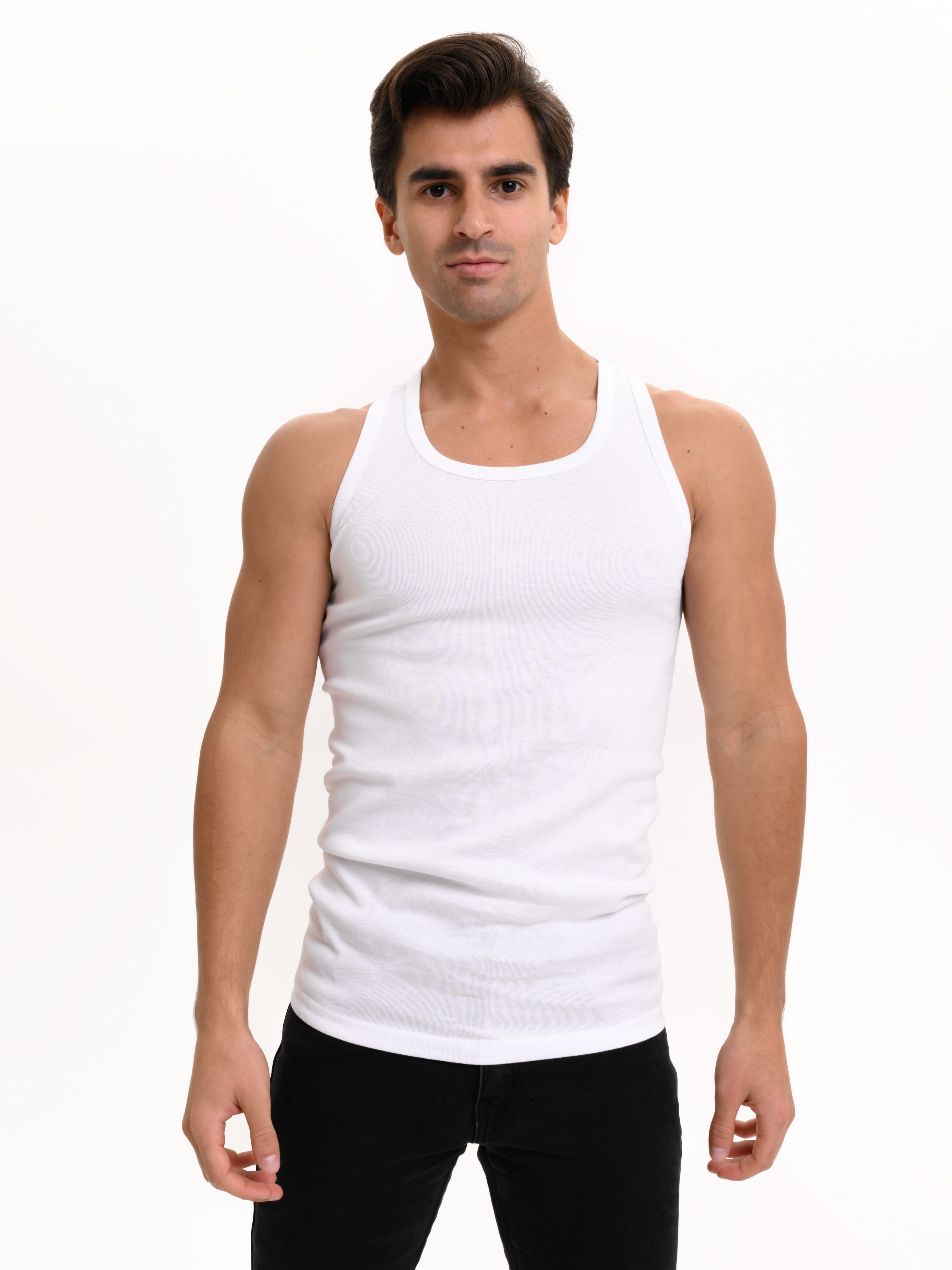 Мужская майка Oztas белого цвета на широких лямках, приталенная. Спина борцовка. Изделие изготовлено из 100% хлопка.