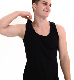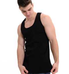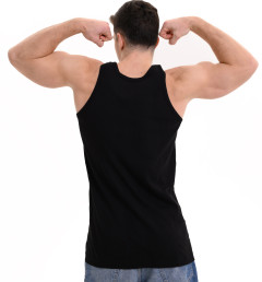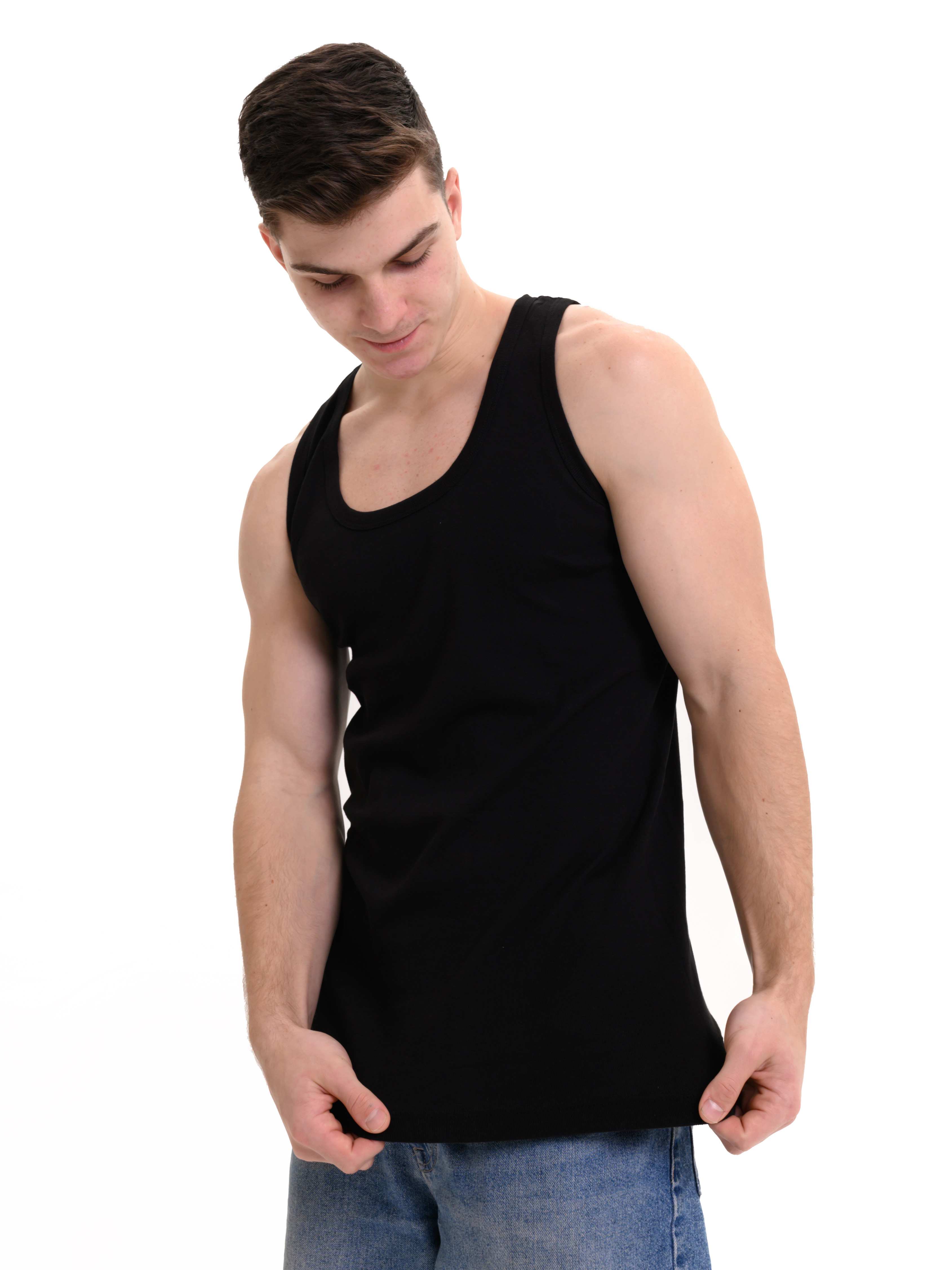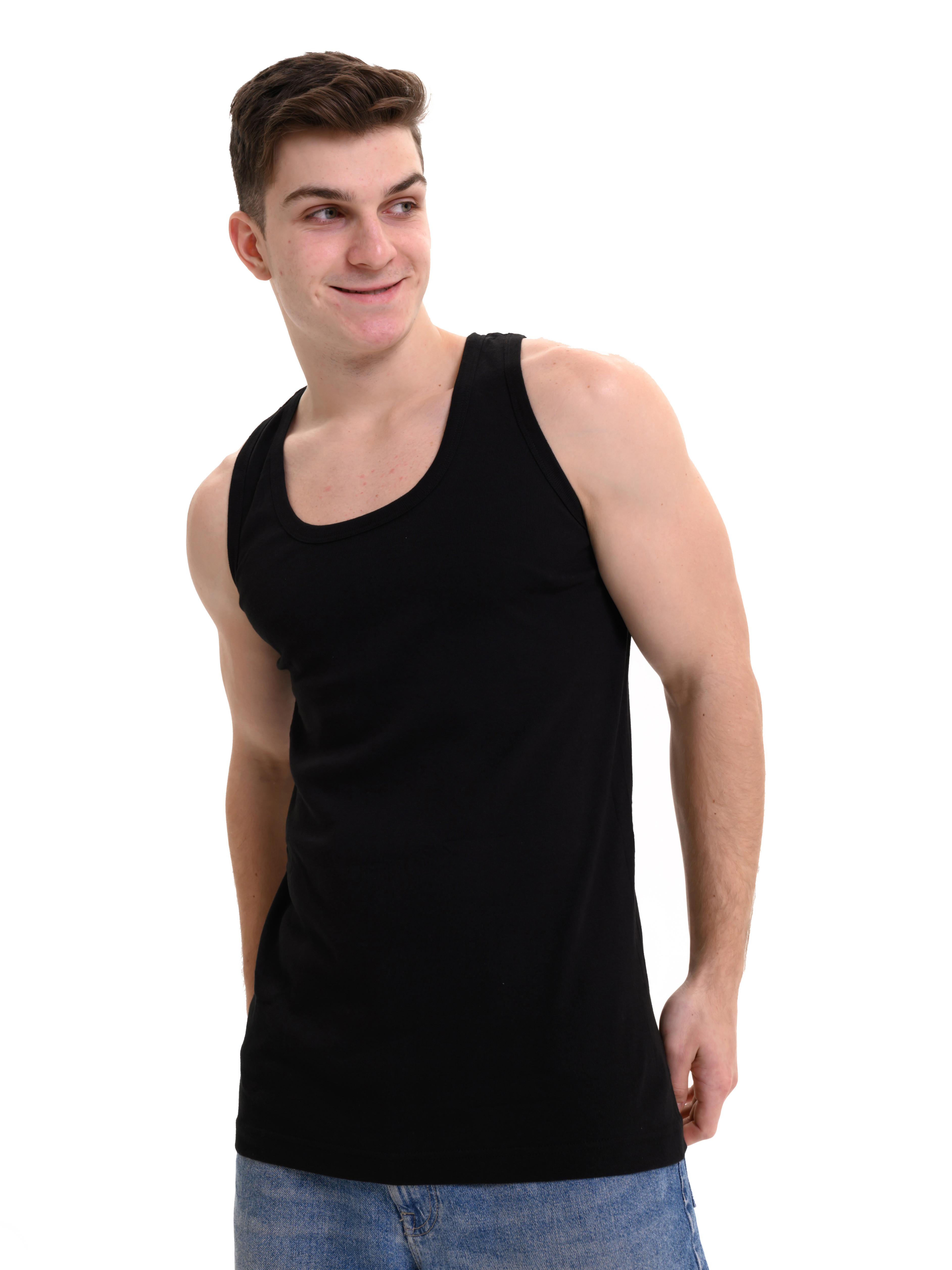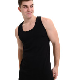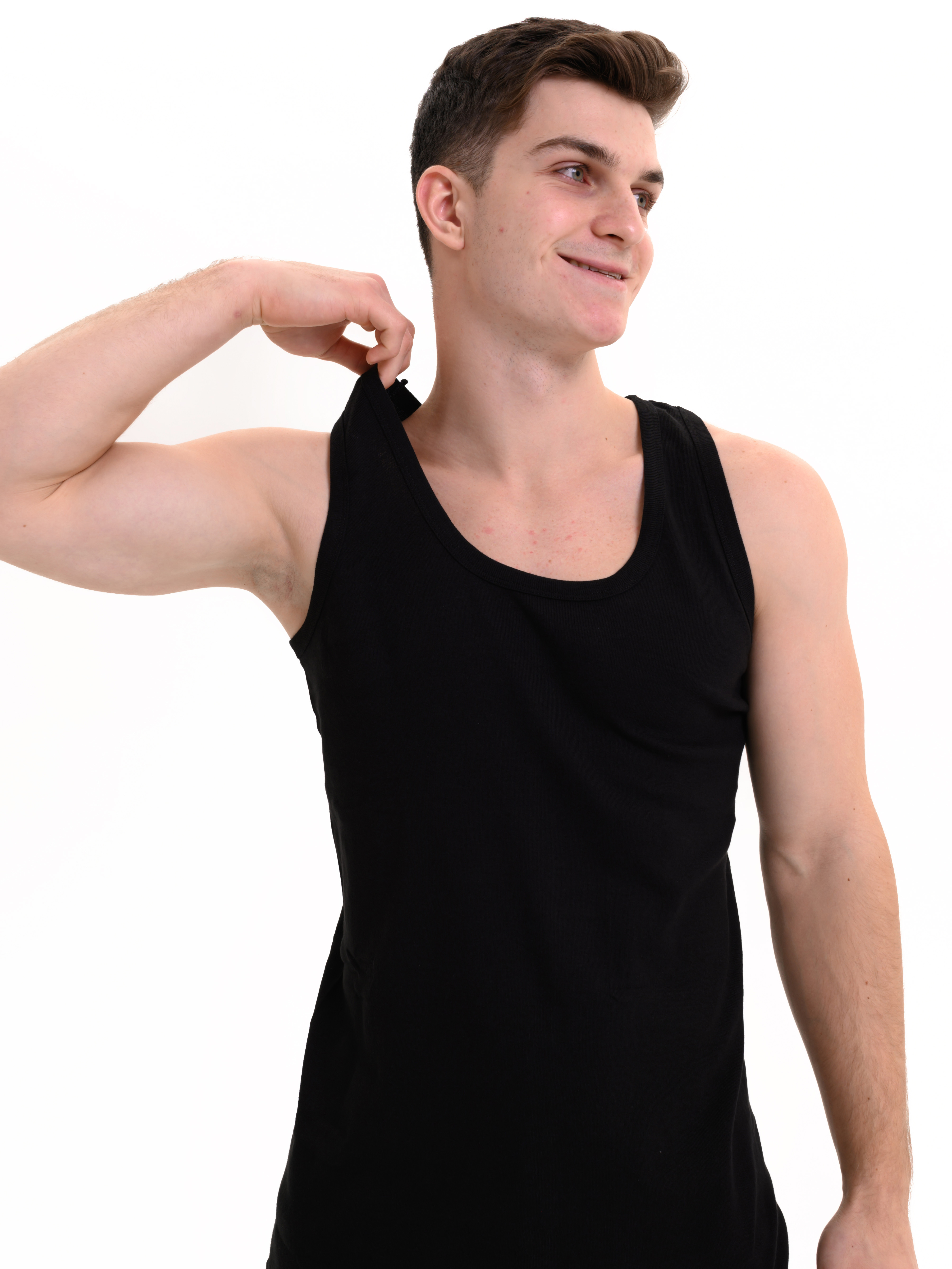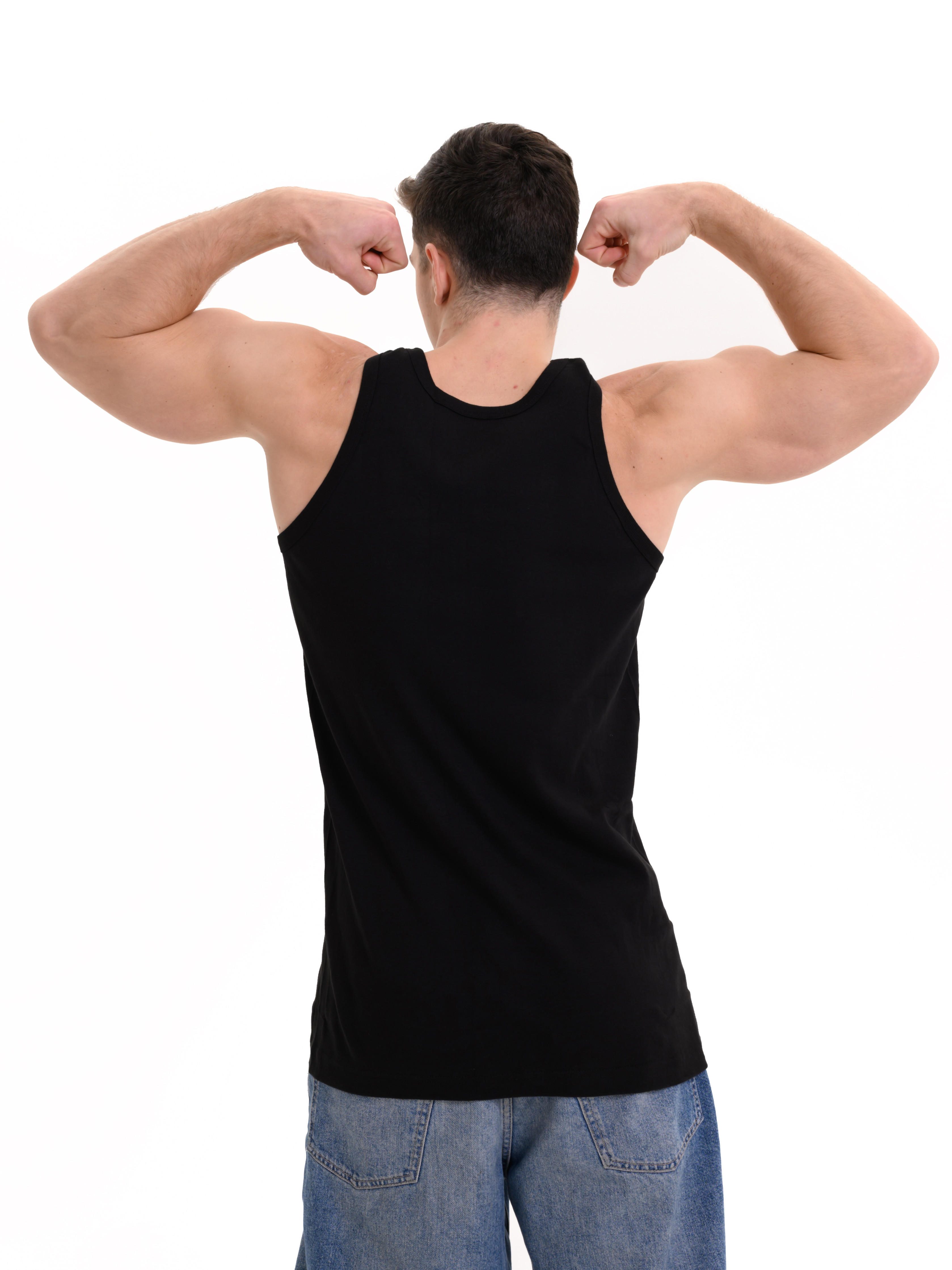 Мужская майка Berrak черного цвета на широких лямках. Приталенная и удлиненная. Классическая спина. Майка изготовлена из 100% хлопка, что делает ее долговечной и комфортной при носке. Она имеет облегающий крой, который подчеркивает фигуру. Майки без боковых швов часто предпочитаются теми, кто ценит минимализм и удобство в одежде. Ткань рибана
