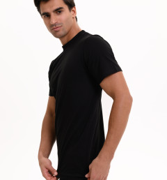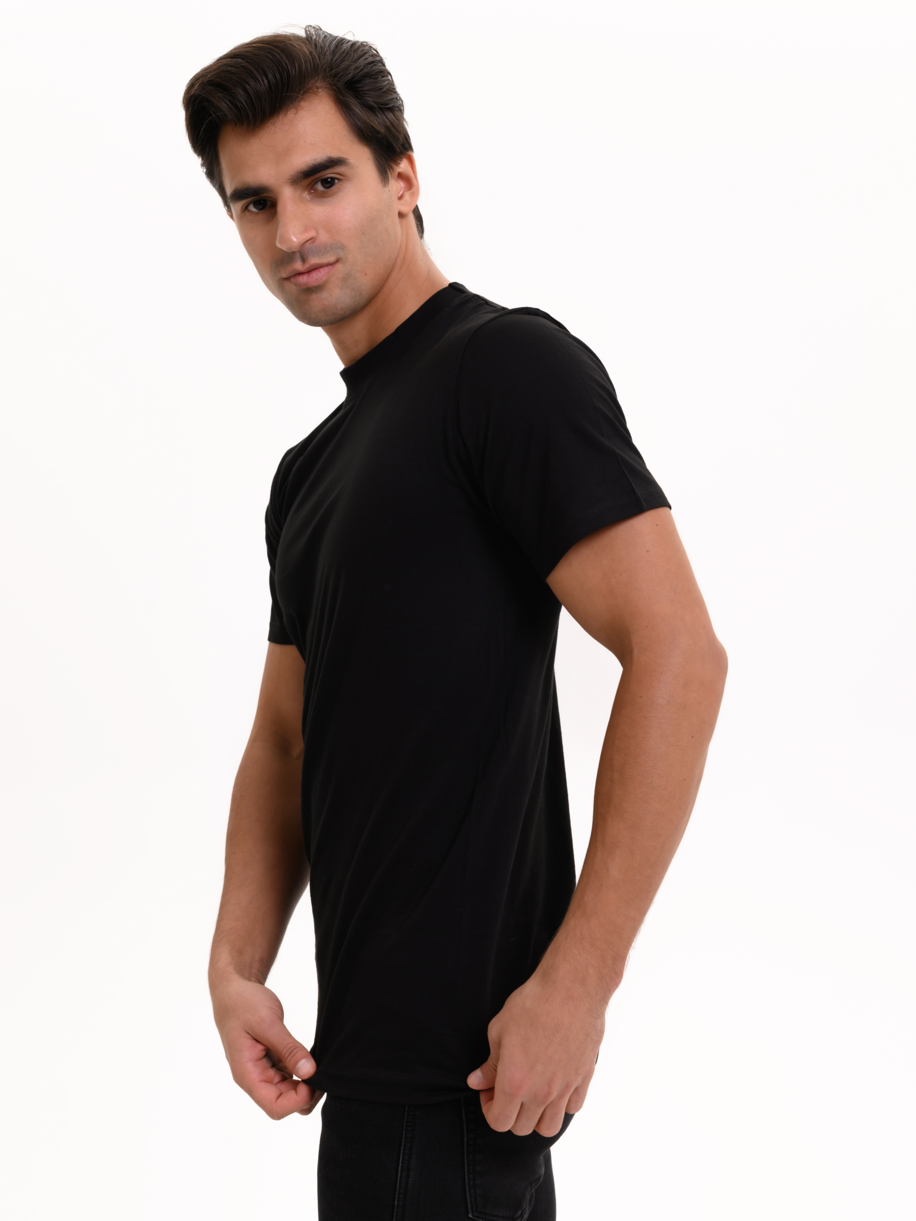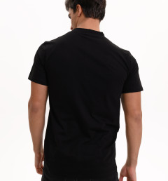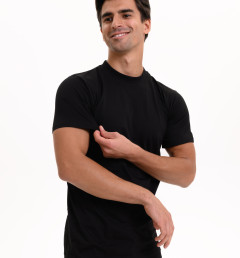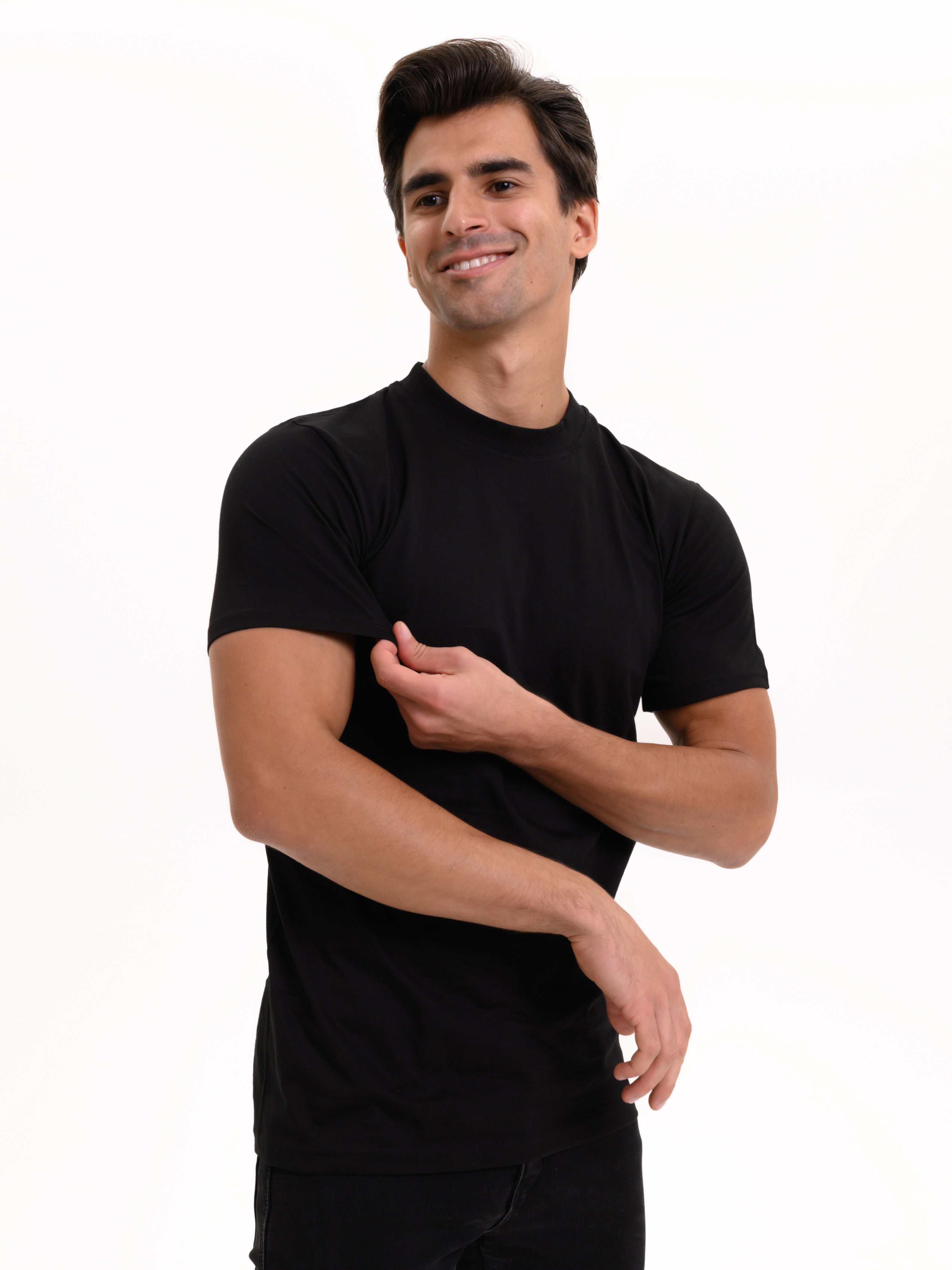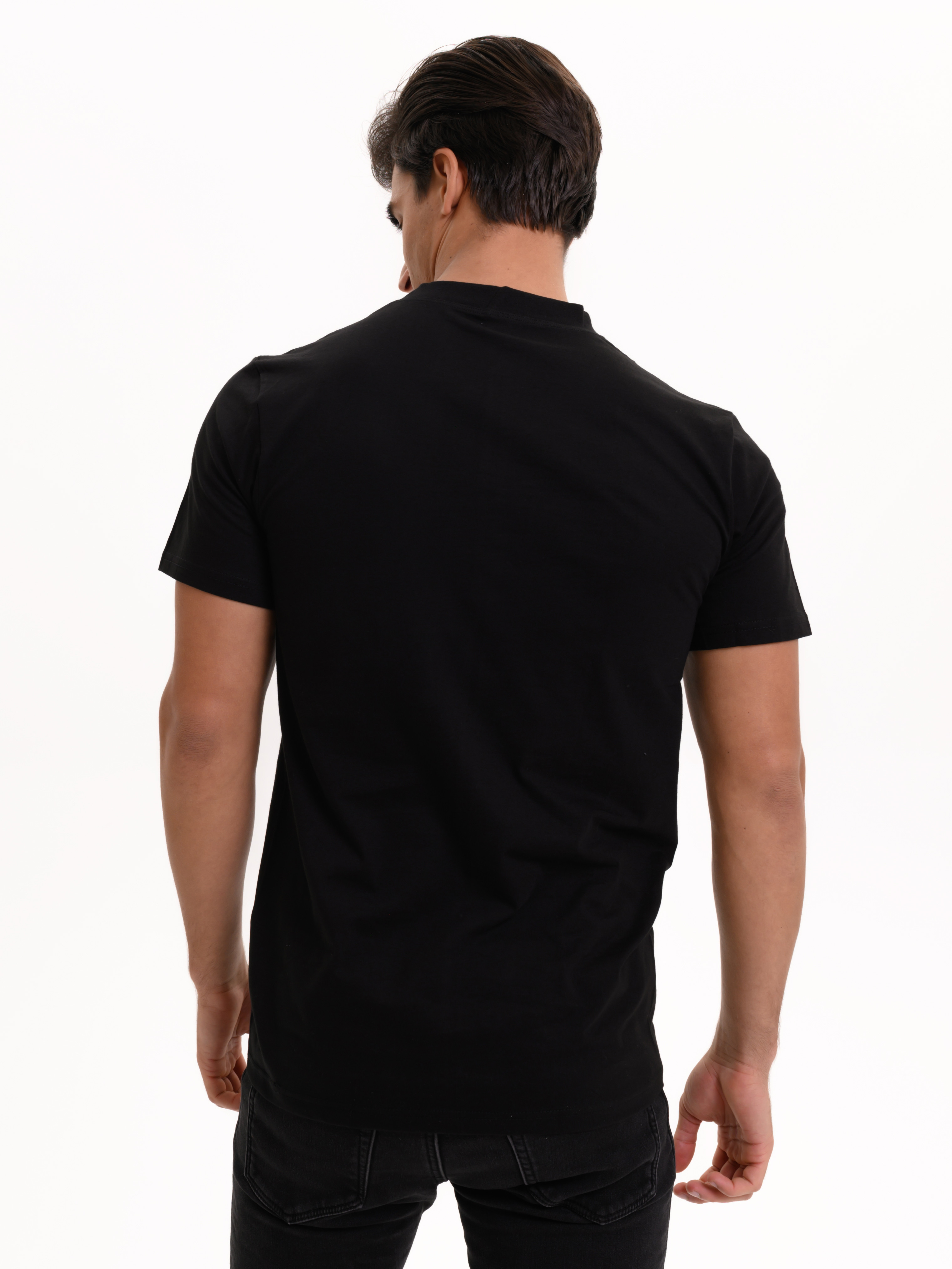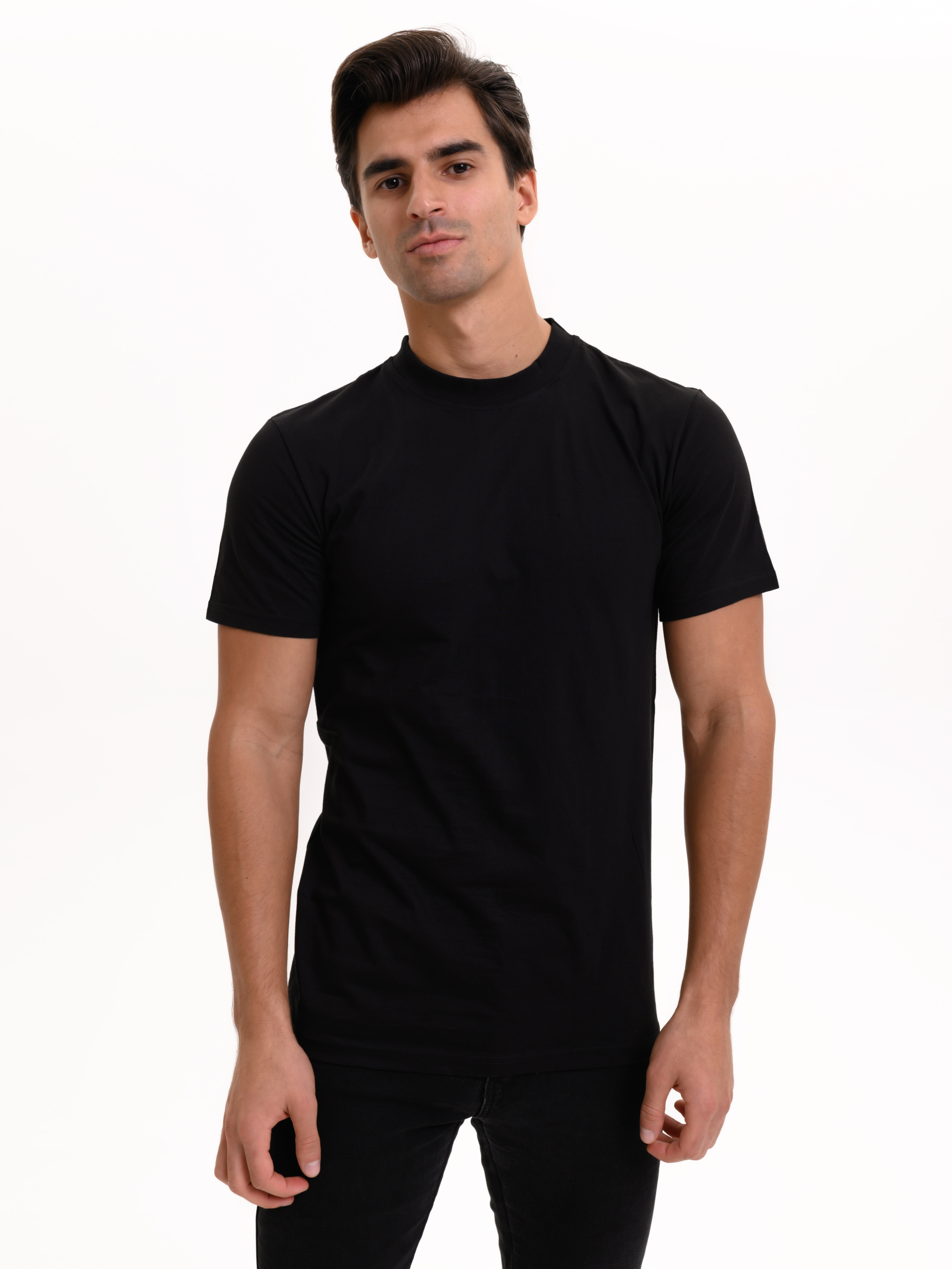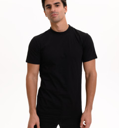 Базовая футболка Oztas черного цвета с коротким рукавом и круглым вырезом. Прямой крой, свободная посадка. Футболка изготовлена из 100% хлопка.