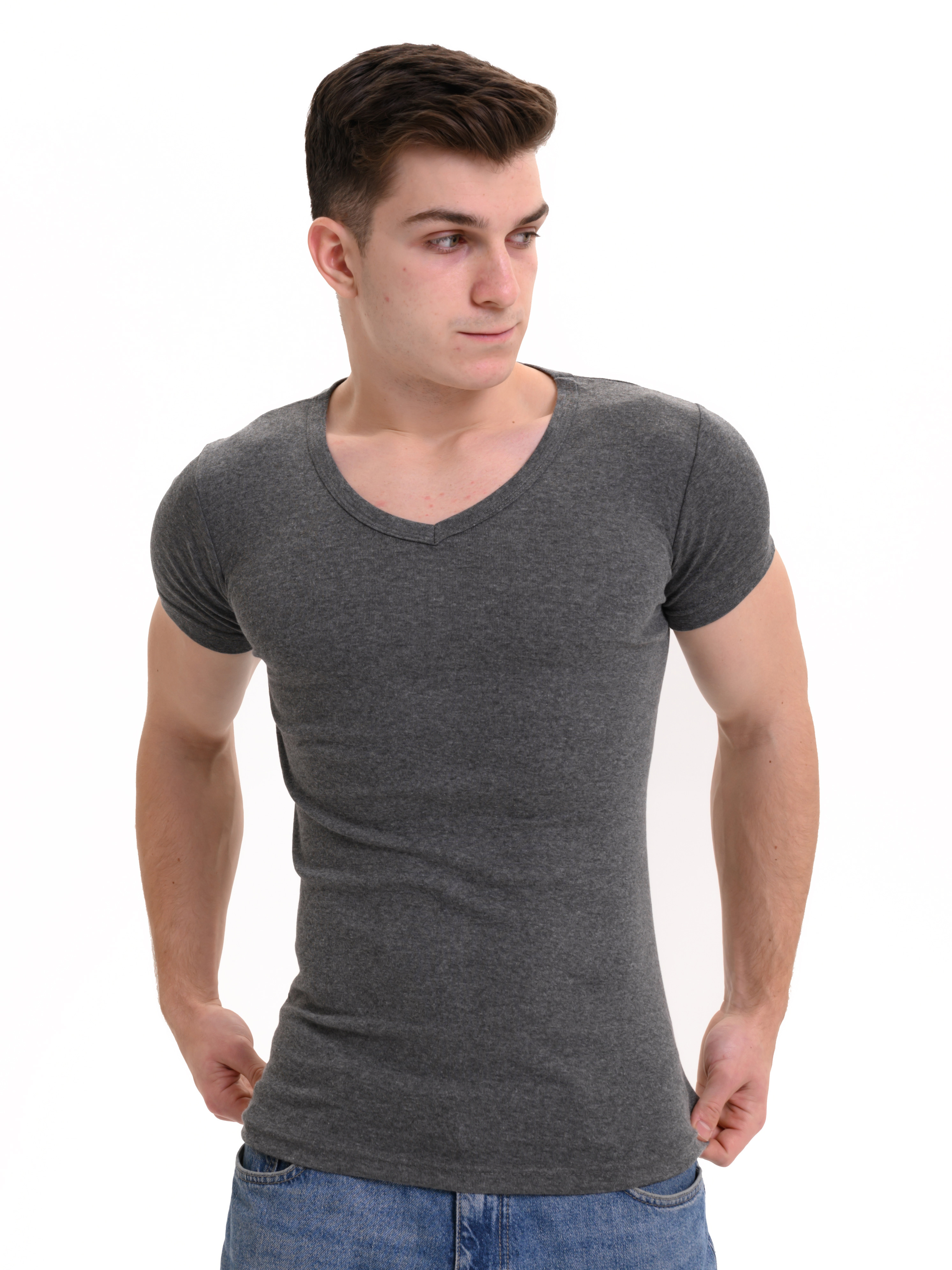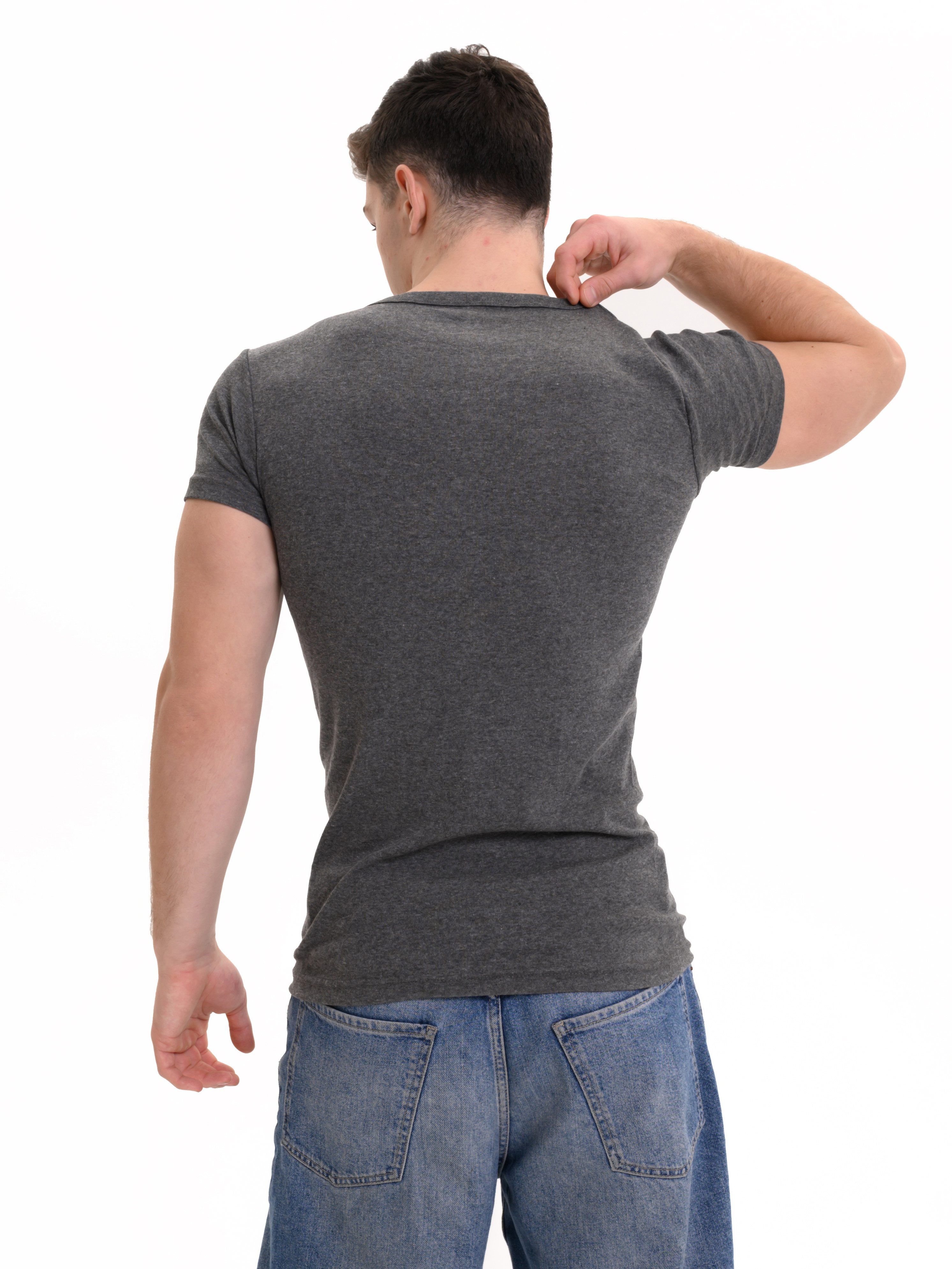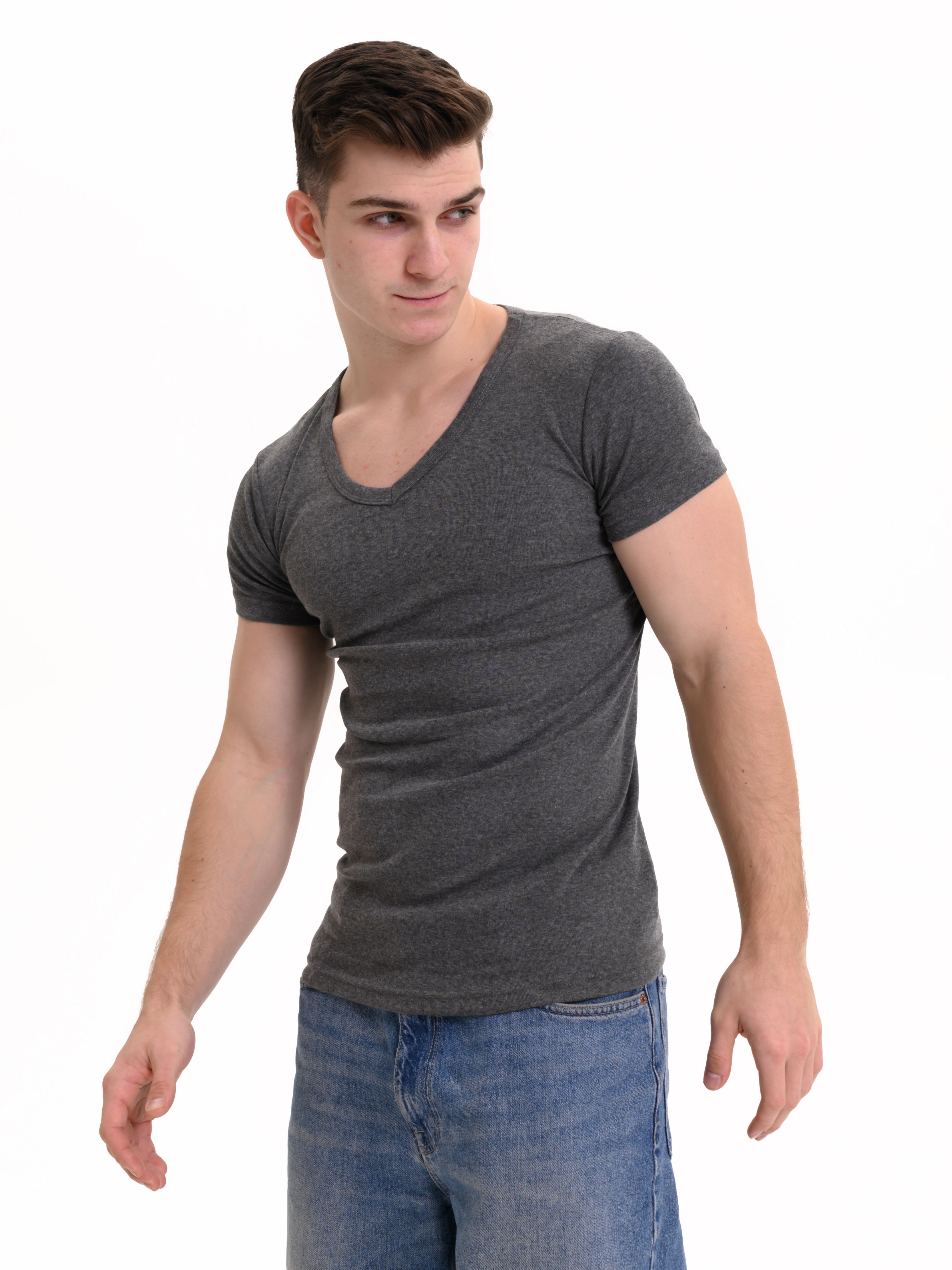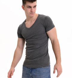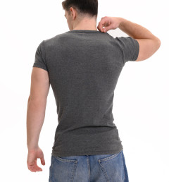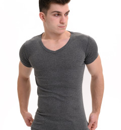 Базовая футболка Oztas темно-серого цвета с коротким рукавом и V-образным вырезом. Прямой крой, свободная посадка. Футболка изготовлена из 100% хлопка.