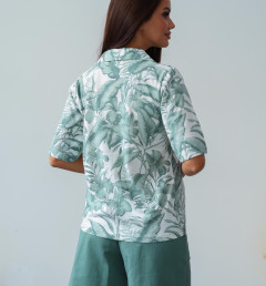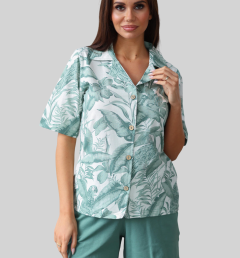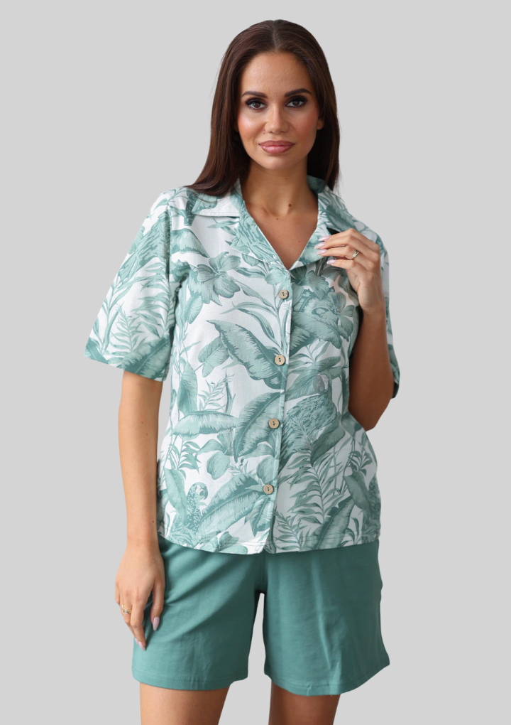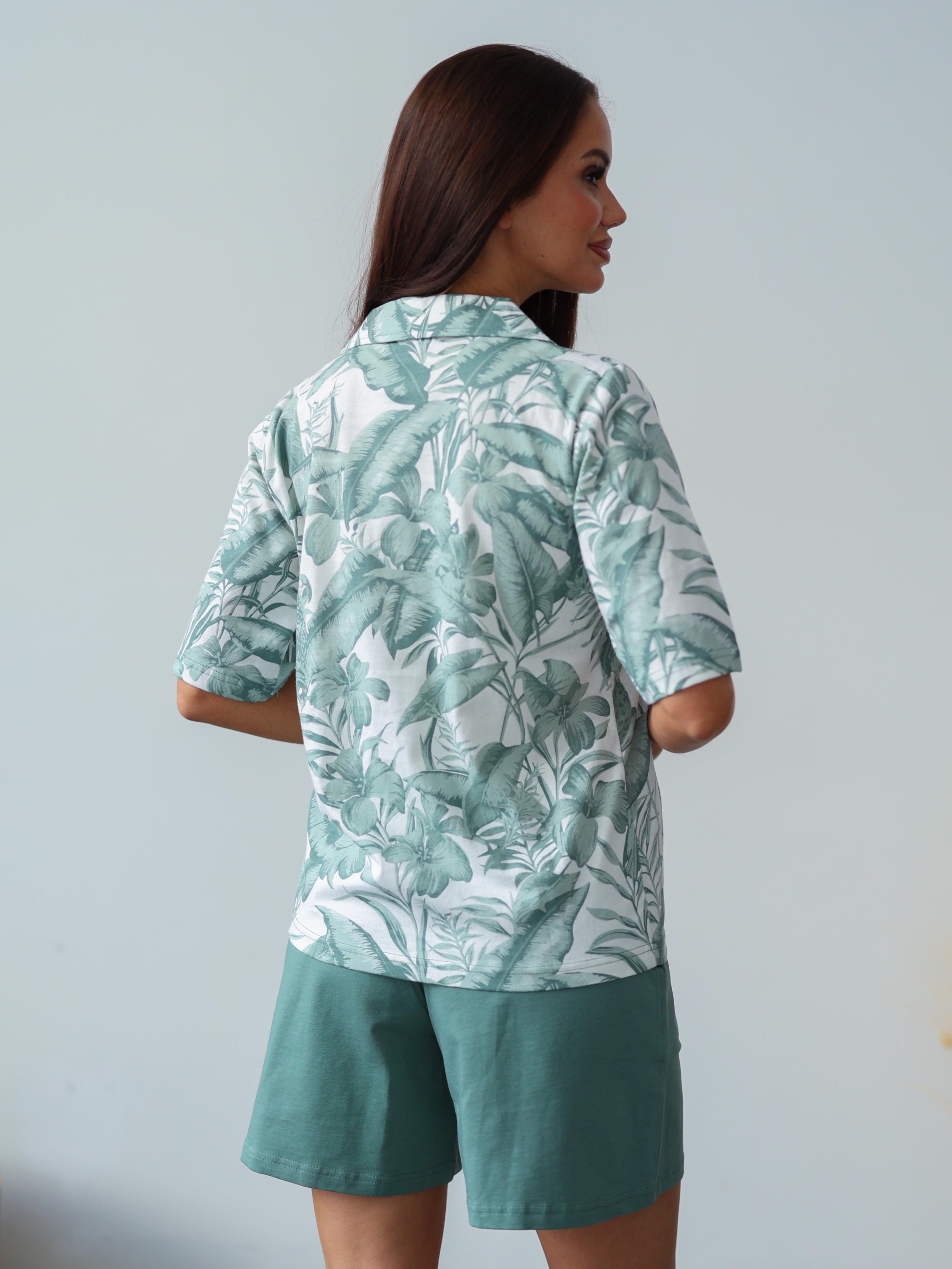 Женский домашний комплект Berrak: белая футболка с принтом (также есть короткий рукав, воротник и пуговицы); бирюзовые шорты. Комплект изготовлен из 100% хлопка pamuk.