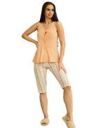 Женский комплект Berrak: свободная персиковая майка на широких лямках, с пуговицами, и укороченные разноцветные штаны в полоску. Верх изготовлен из 80% вискозы, а низ - из 65%.