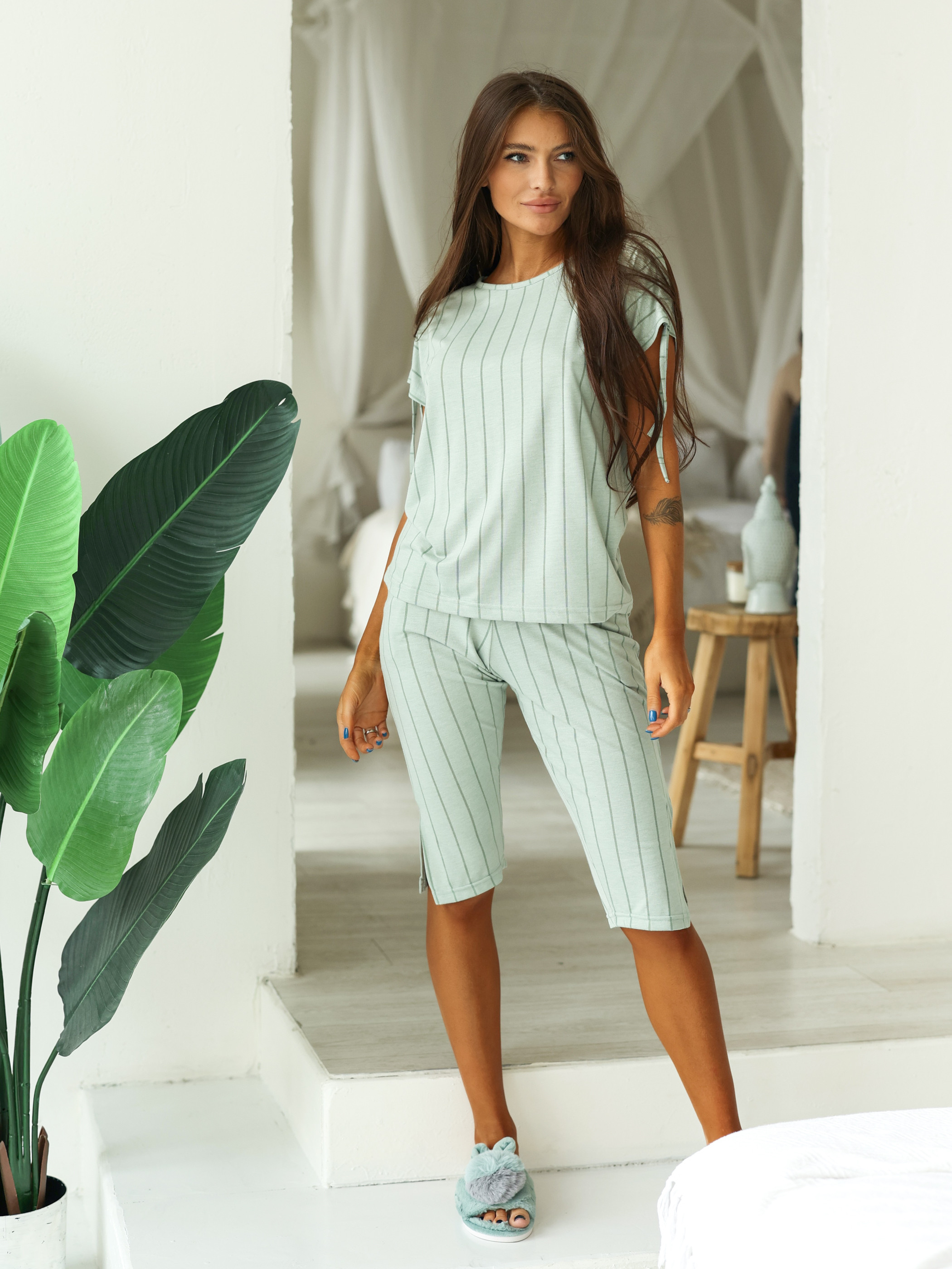 Женский комплект Berrak: футболка с короткими рукавами на завязках, укороченные обтягивающие штаны с разрезом по бокам. Ткань в полоску. Комплект изготовлен из 65% полиэстера.
